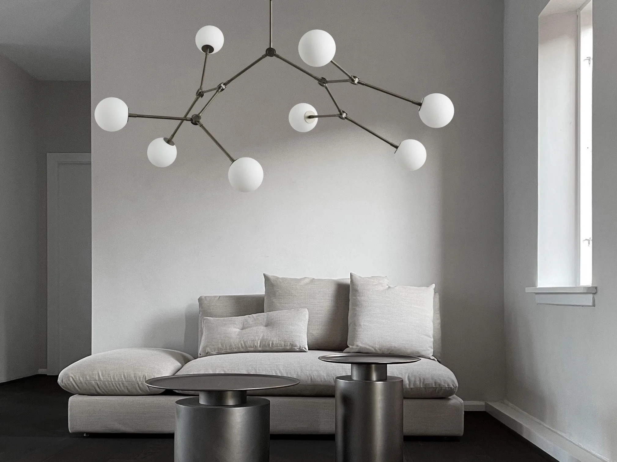 The Drop Chandelier Bulp offers a versatile LED lighting solution, ideal for hotels, offices, retail spaces, restaurants, and residential interior design projects. Available in a standard and mini version, this modern chandelier design draws inspiration from its larger counterpart, providing ambient lighting that embodies the Danish concept of "hygge." The drop-shaped opal glass lampshade can be adjusted to various angles, allowing for the creation of a distinct and personalized atmosphere. Constructed with oxidized brass pipes, it features an E14 socket compatible with 230V. The recommended light source is a Tala LED 3W porcelain bulb, delivering 450 lumens at 2700K. Note that this product does not meet US standards. This energy-efficient lighting design combines functionality with decorative pendant light aesthetics, making it a suitable choice for modern LED interior lighting needs.