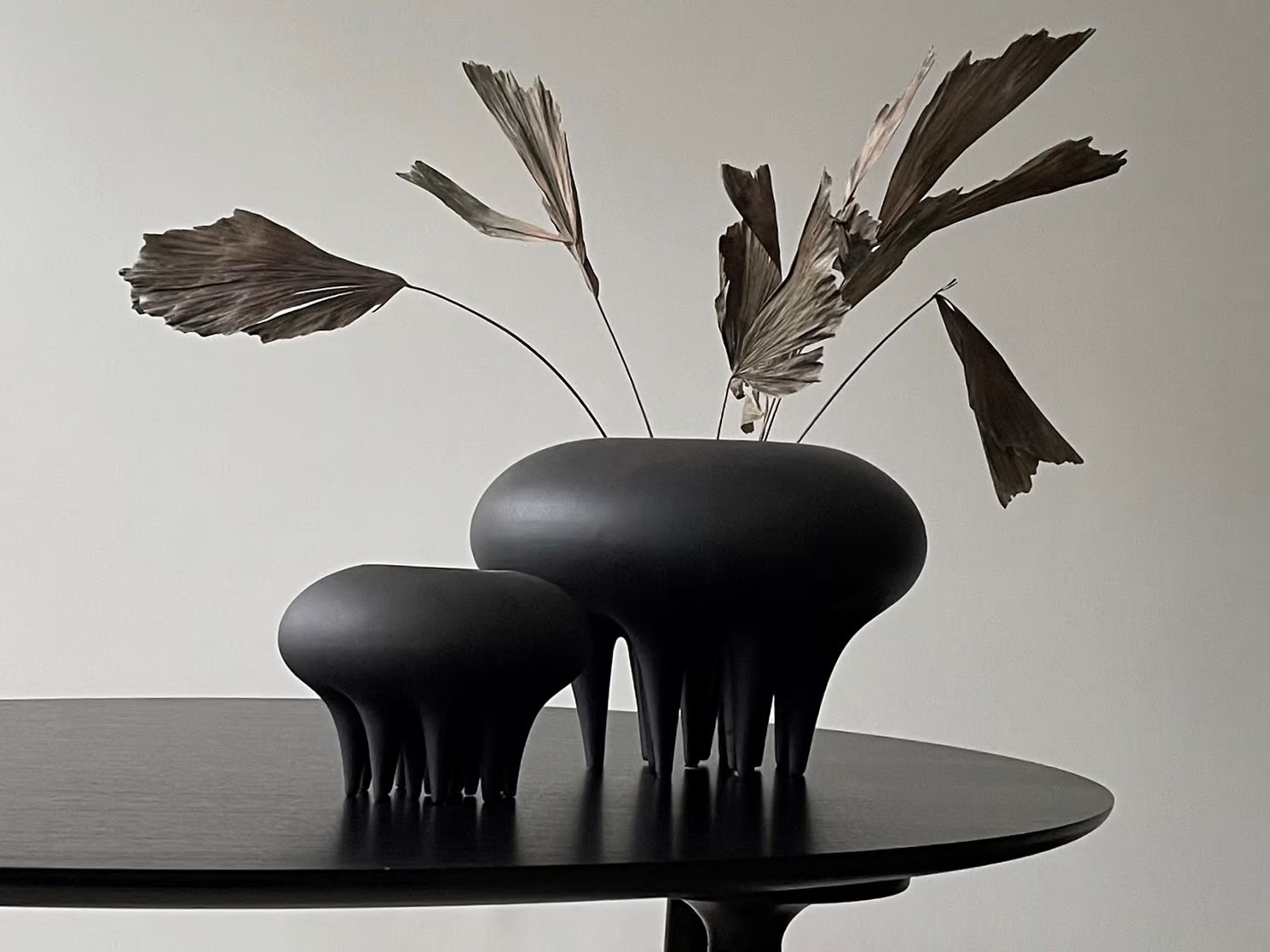 The MEDUSA MINI vase draws inspiration from the distinctive forms of the Medusa jellyfish, highlighting its gentle oval contours and intricate details. Expertly crafted, each piece is elevated by small conical legs, reminiscent of jellyfish tentacles. This design offers a refined and understated aesthetic, seamlessly integrating into various interior settings as a sculptural element or a vessel for floral arrangements and decorative accents. Available in both vases and trays, the MEDUSA MINI is crafted from ceramic with a hand-glazed finish, ensuring a unique surface texture. As a handmade item, slight color variations may occur. Please note, the vase is not entirely waterproof, and a bag for fresh flowers is included. Ideal for modern wall art displays, luxury home accessories, and minimalist home decoration ideas, it complements customizable wall décor and stylish decorative themes.