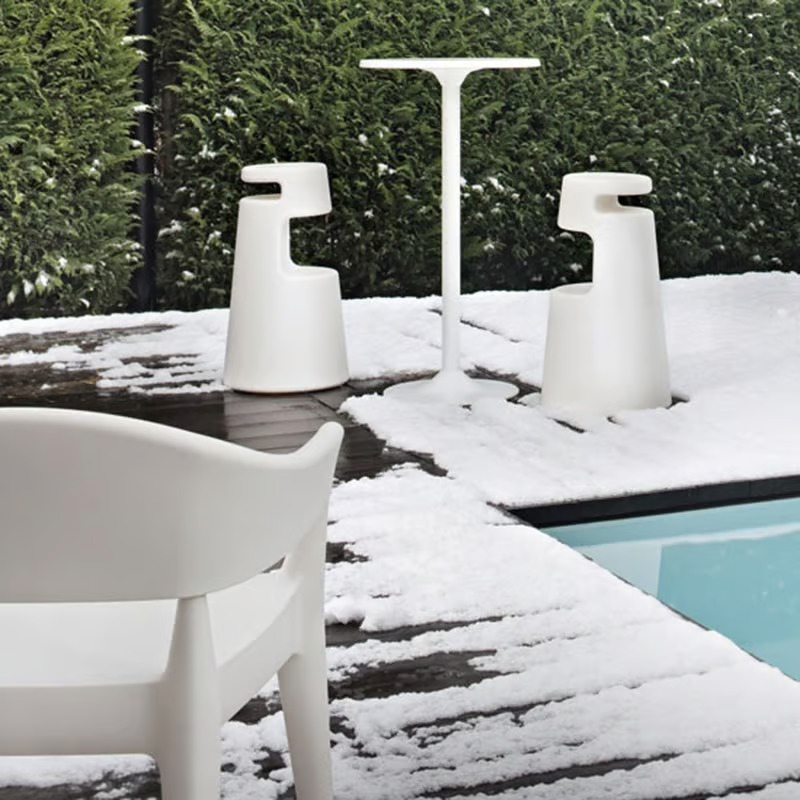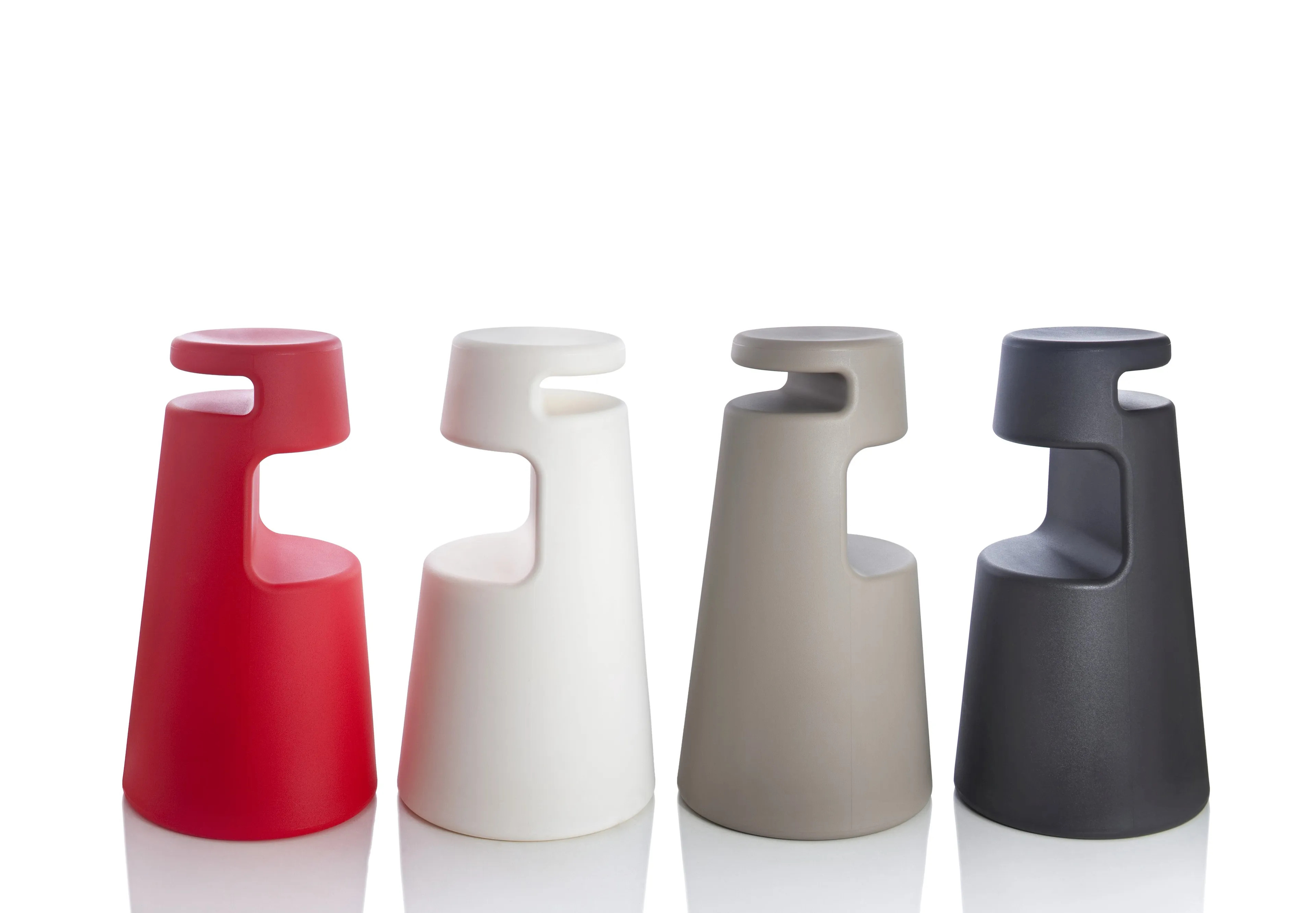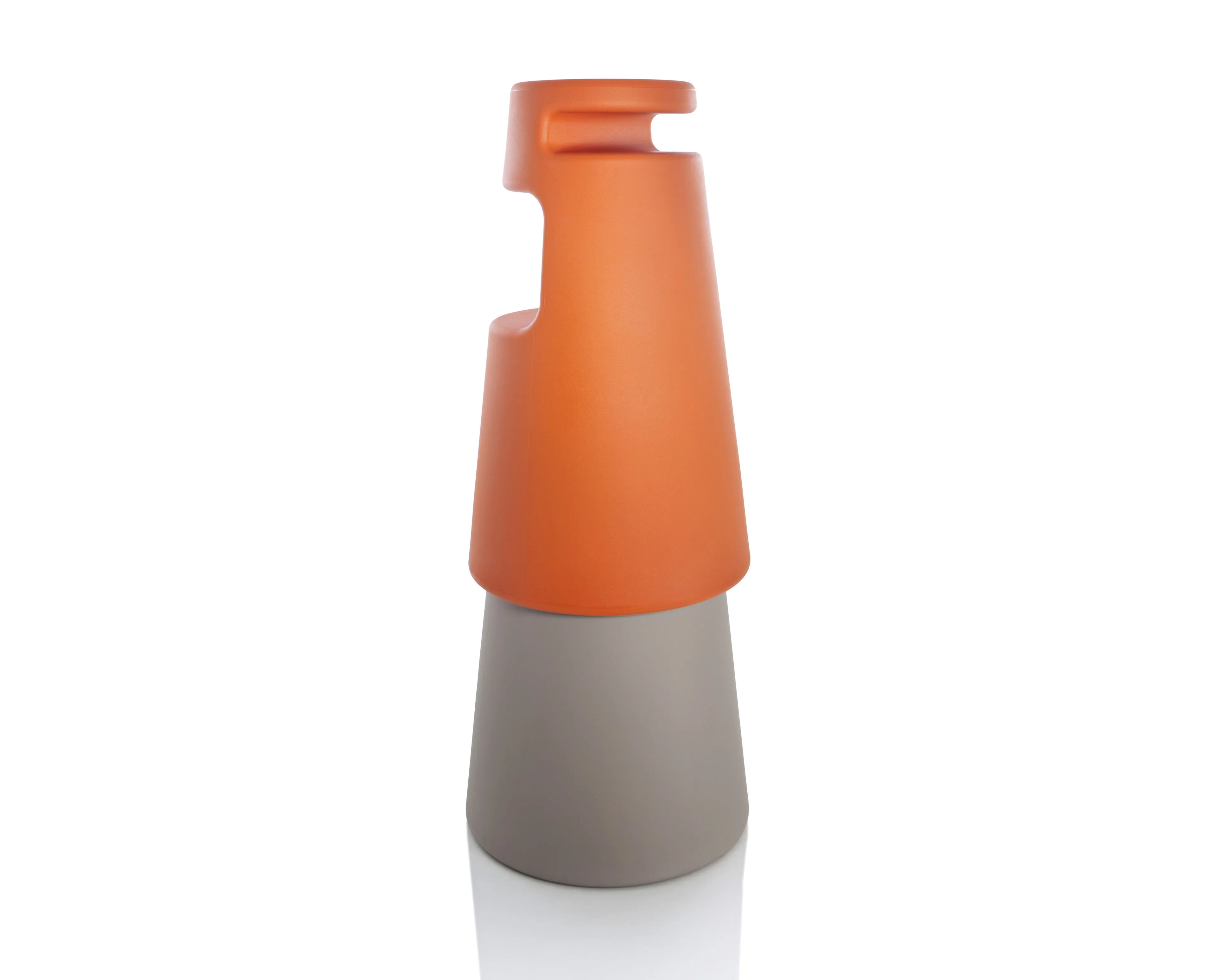 The 2525 stool is designed for versatile use in restaurants, conference rooms, coworking spaces, cafés, event venues, banquet halls, and educational institutions. Crafted from durable polyethylene, it is available in anthracite, orange, white, red, and sand. Its unique cone-shaped design allows it to form the numbers 2 and 5 when positioned differently. This modern design table companion is lightweight and stackable, making it ideal for spaces requiring flexible seating arrangements. The stool features a special opening that serves as both a footrest and a convenient compartment for personal items, enhancing its ergonomic functionality. Additionally, the opening provides a grip for easy relocation. Suitable for both indoor and outdoor use, the 2525 stool is resistant to UV rays and weather conditions. It can also be illuminated with LEDs, adding a distinctive touch to any setting.