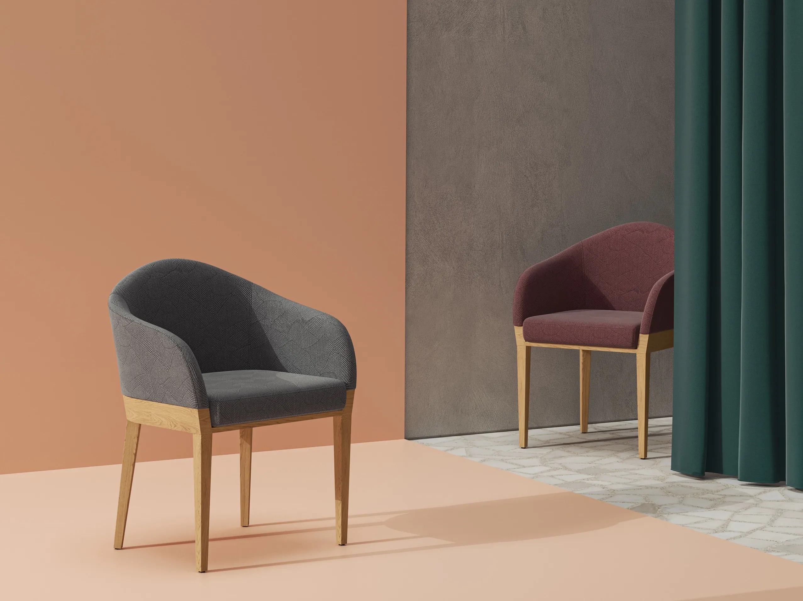 The AGATA fabric chair combines functionality and style, making it an ideal choice for dining tables in restaurants, conference room furniture, and café seating. Its ash wood base and armrests offer a sturdy foundation, while the ergonomic design ensures comfort for extended use. Available in two versions, the chair features either a fully upholstered shell or a show-wood detail, with materials ranging from fabric to leather. The chair's curved ash wood body and polyurethane stuffing enhance durability and comfort, while the tapered legs provide a modern design aesthetic. Stackable for convenience, AGATA is available in various finishes, including ash walnut, ash grey, and light ash, with additional lacquered options. This versatile chair is suitable for diverse settings, from coworking spaces to educational institutions.