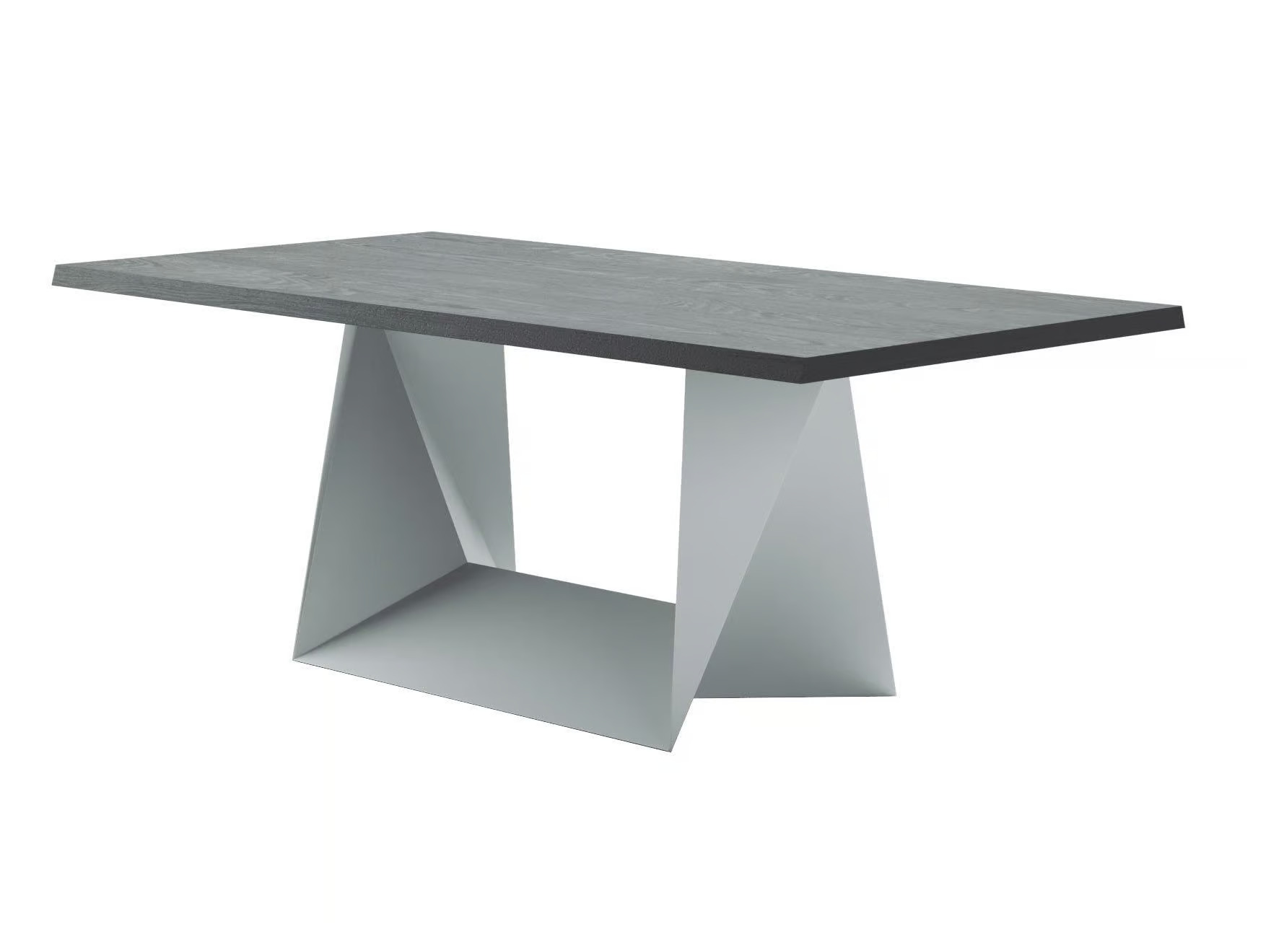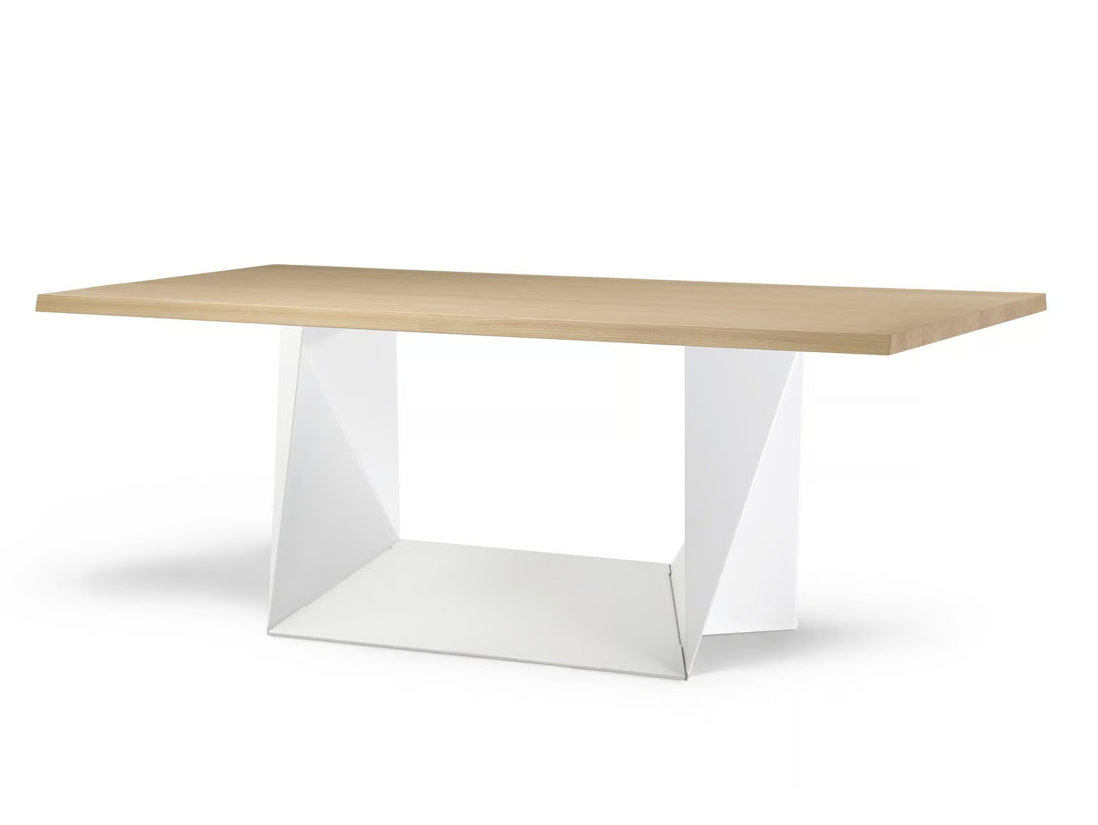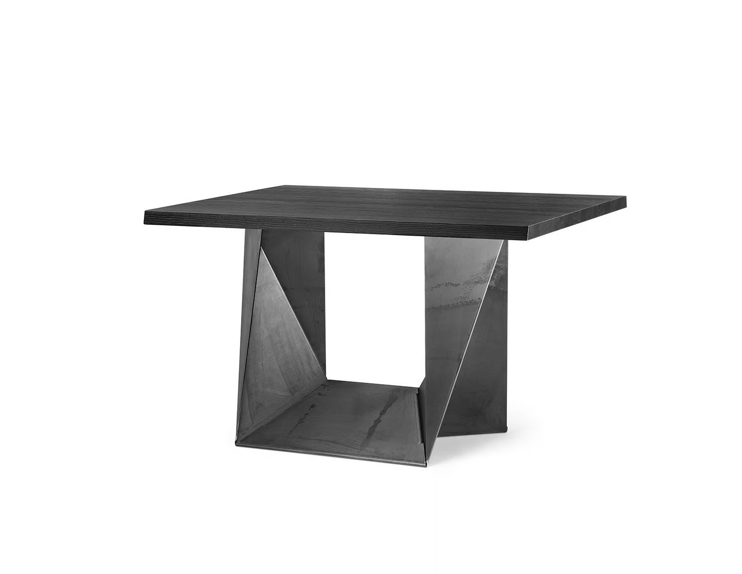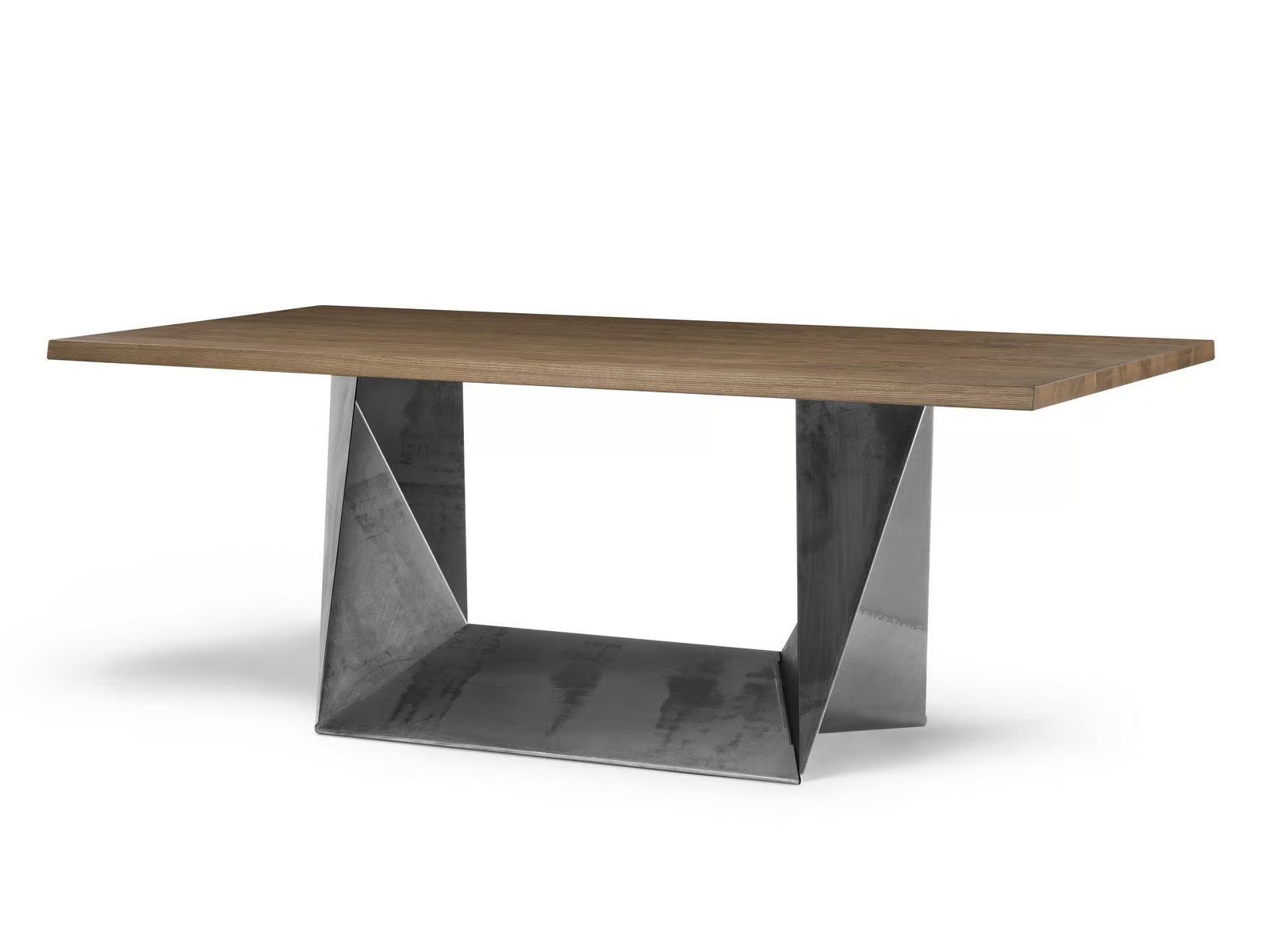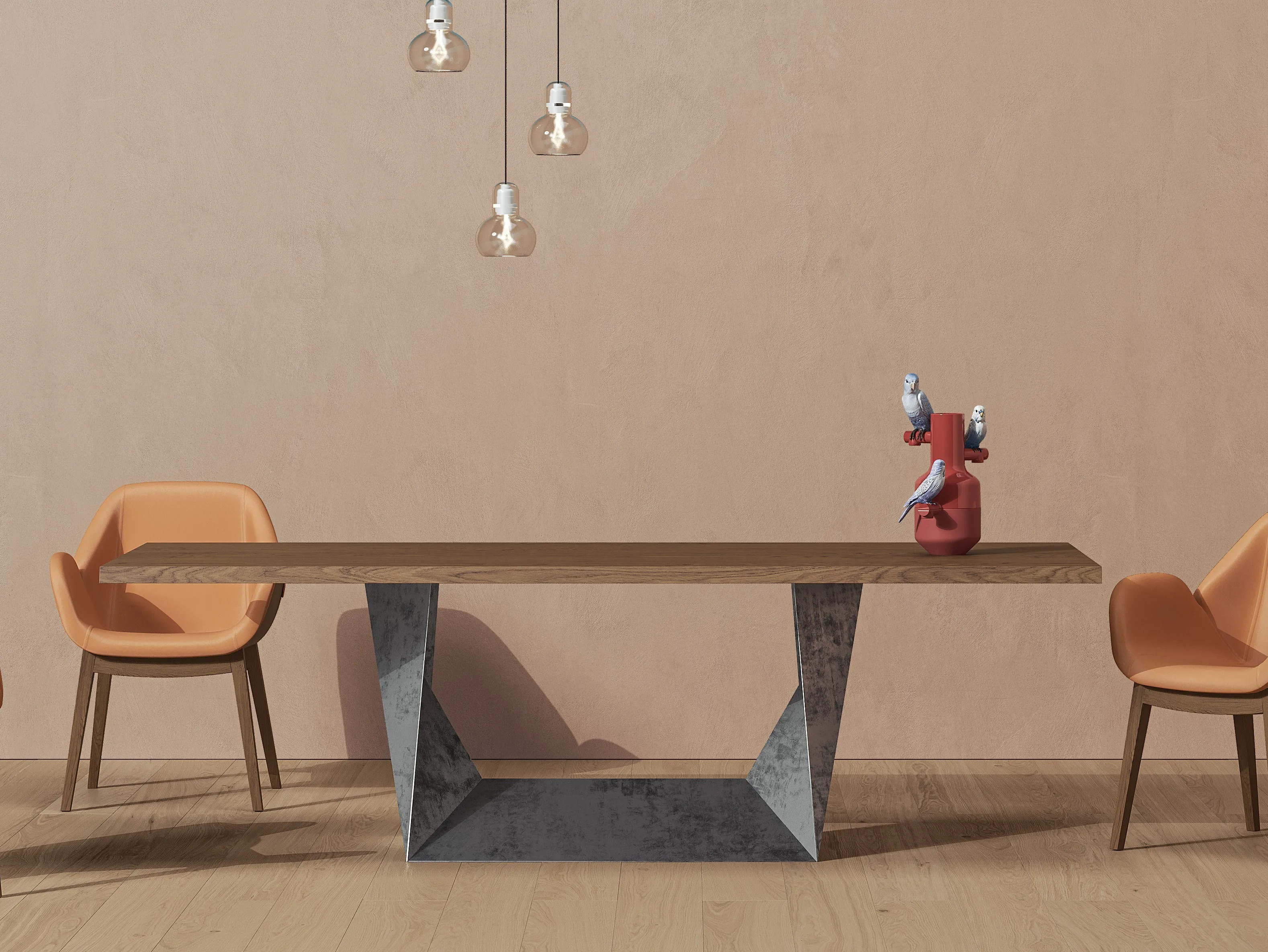 The CLINT Rectangular Table collection features a striking blend of modern design and functional elegance, ideal for diverse environments such as restaurants, conference rooms, coworking spaces, cafés, event venues, and educational institutions. The table's wooden top, offered in natural or dark finishes, exudes sophistication with its substantial thickness and rich wood tones. Supporting this refined surface is a uniquely sculpted metal base, reminiscent of origami, crafted from bent metal sheets. This intricate structure, available in various finishes, provides a stable and visually dynamic foundation. With multiple size options, the CLINT table seamlessly integrates into dining areas, conference room furniture setups, and other communal spaces, complementing ergonomic and stackable café chairs. Its durable seating and contemporary aesthetic make it a versatile choice for any setting requiring modern design tables.