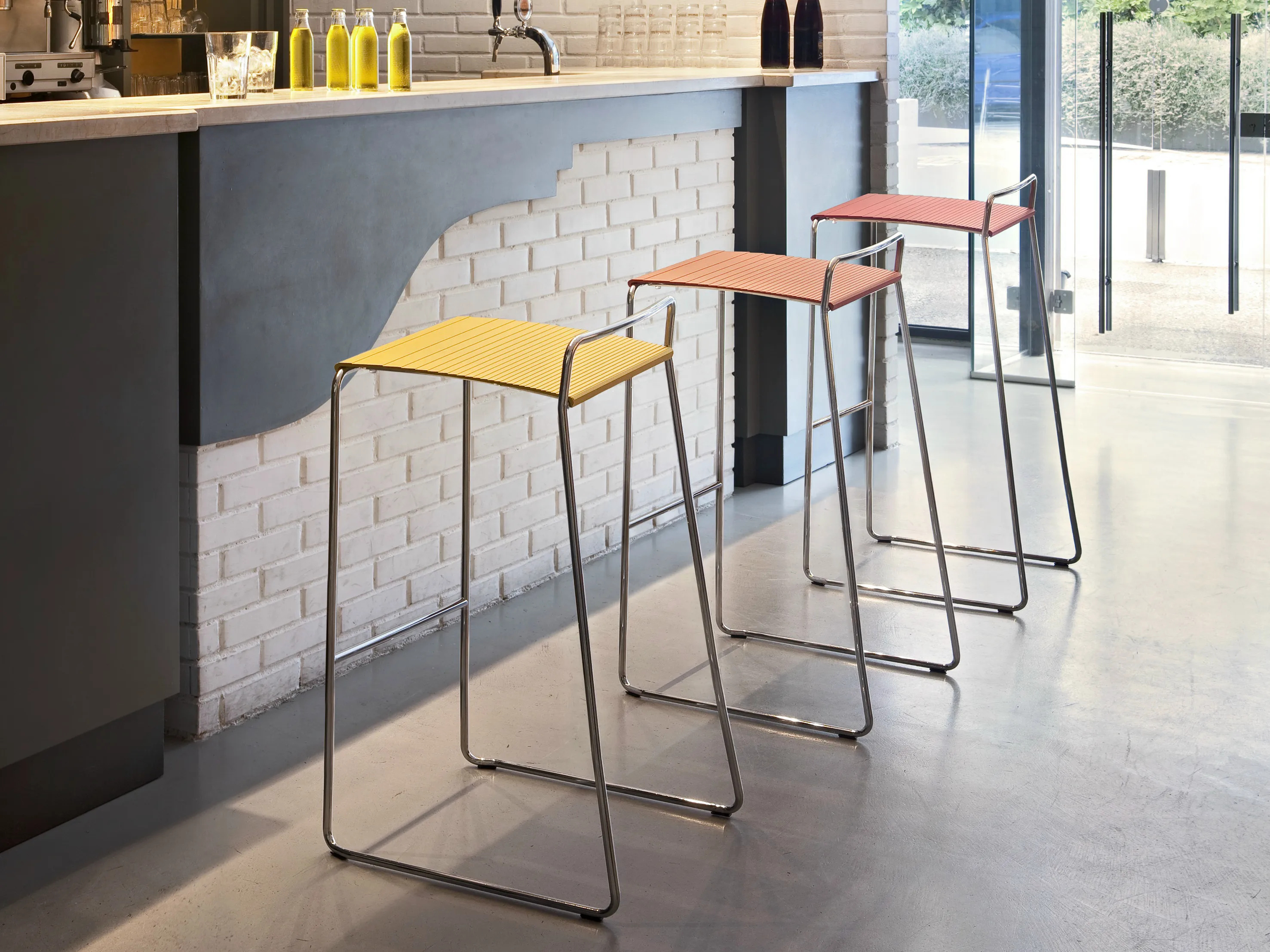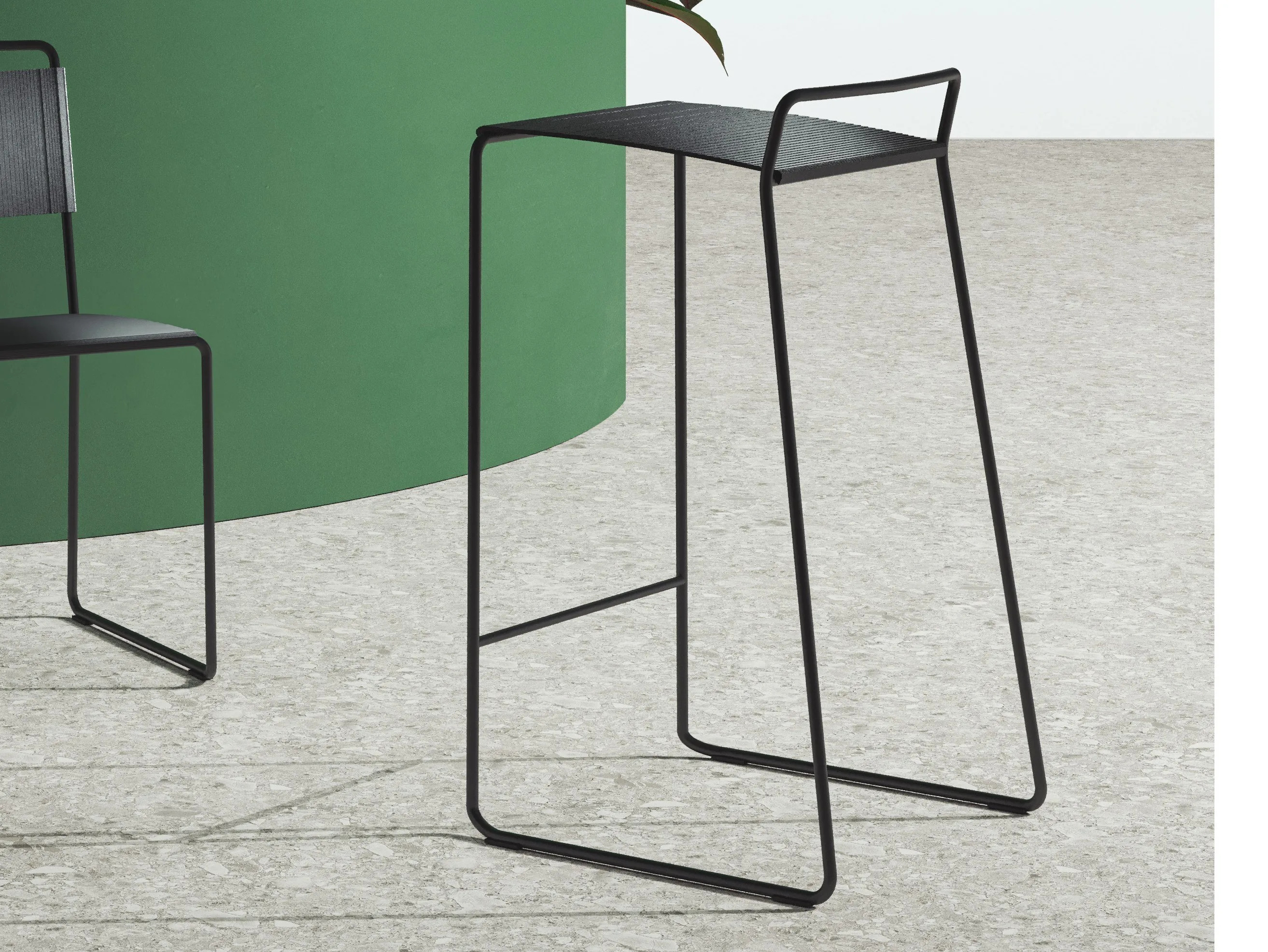 The ESTROSA Stool offers a versatile seating solution for restaurants, conference rooms, coworking spaces, cafés, event venues, and educational institutions. Its stackable design is ideal for dynamic environments, providing both functionality and style. Crafted from durable materials, the stool features a sleek aluminum seat that transforms the rigidity of metal into a visually appealing piece. The unique profile of the seat interacts with natural light, creating dynamic reflections that enhance its modern aesthetic. Available in a range of colors, including anodized black and gray, the stool's steel structure can be finished with epoxy-polyester or chrome-plated paint. This ergonomic seating option complements dining tables and café chairs, fitting seamlessly into both indoor and outdoor settings.