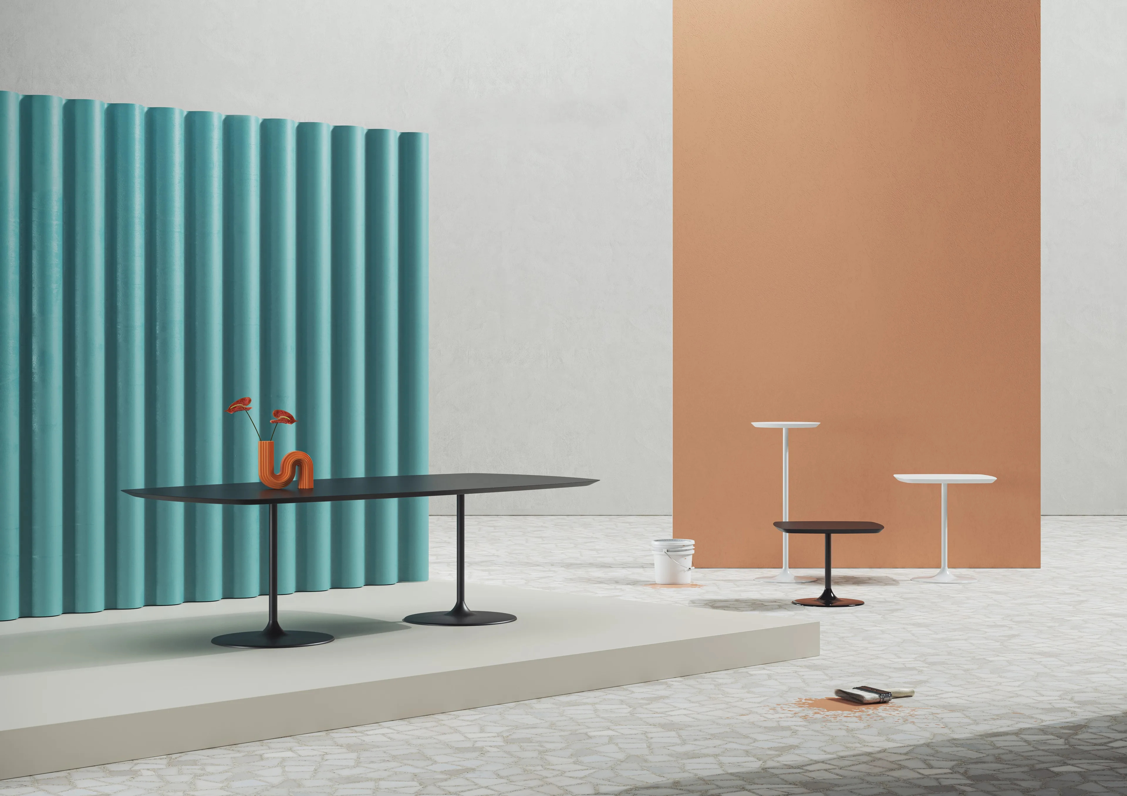 The MALÈNA round table is designed to enhance various environments such as restaurants, conference rooms, coworking spaces, cafés, event venues, and educational institutions. Available in heights of 730 mm and 500 mm, it offers a range of tabletop sizes from 700 mm to 3000×1300 mm, catering to diverse spatial needs. The table features a sturdy frame crafted from white or black painted steel, ensuring durability and stability. Its laminate tops, available in black and white with an inclined profile, provide a sleek and modern aesthetic. This versatile piece complements dining tables, café chairs, and other conference room furniture, making it a practical choice for spaces requiring durable seating and modern design tables.