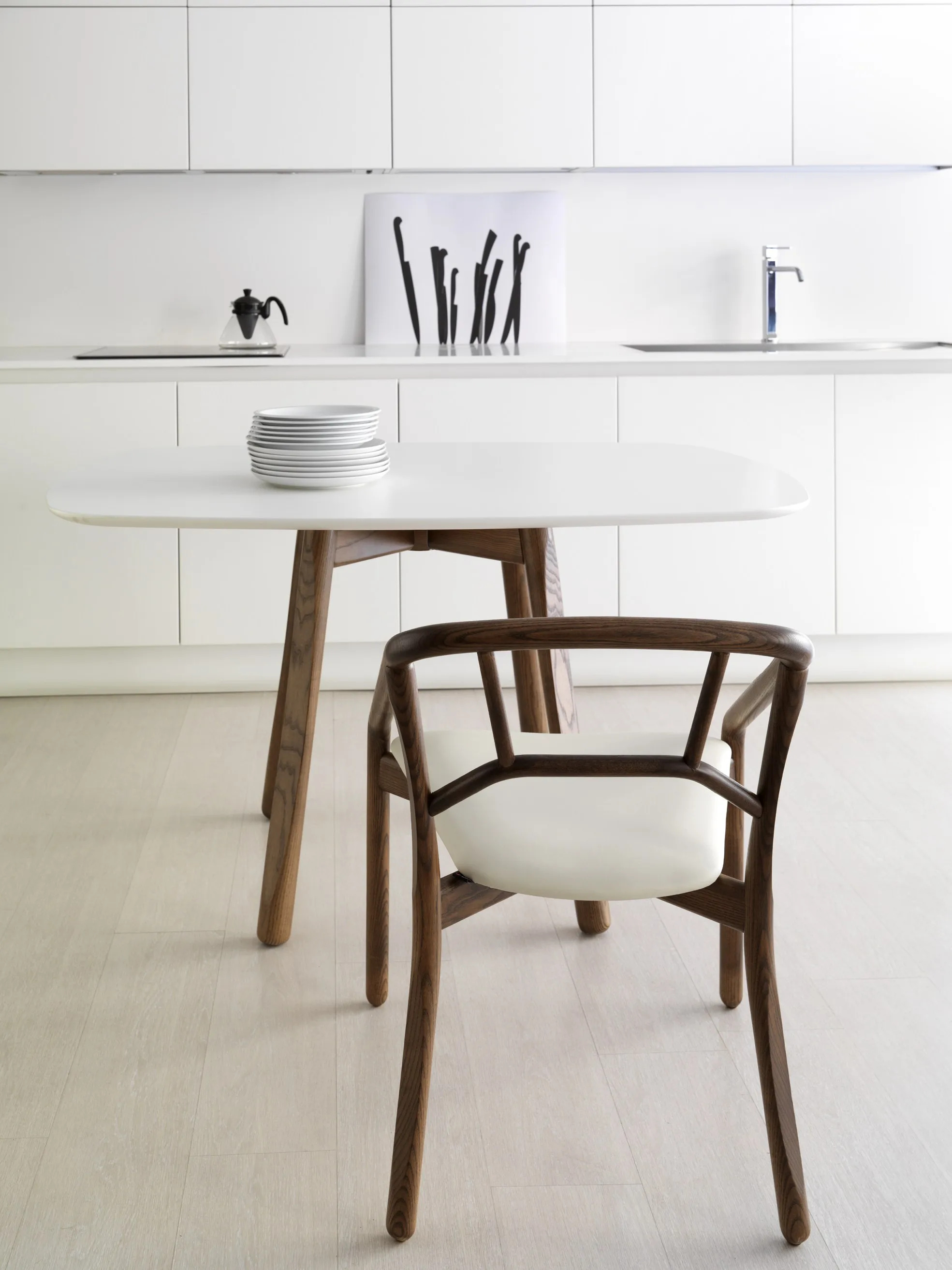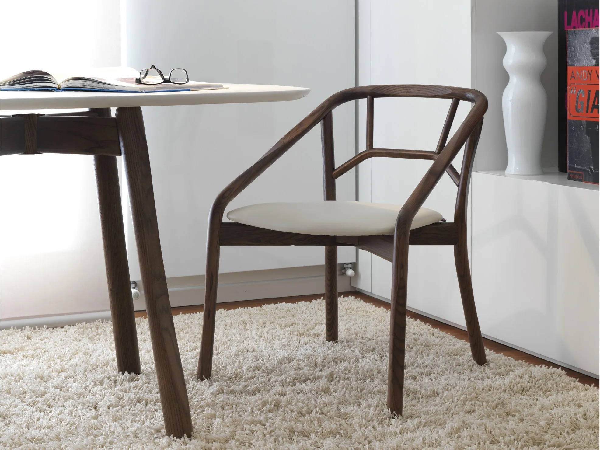 The Marnie chair offers a versatile seating solution for restaurants, conference rooms, coworking spaces, cafés, event venues, and educational institutions. Crafted from solid ash wood, its design combines the warmth of natural materials with a modern aesthetic. The chair features a unique side-cut detail on the arms and back, creating an intriguing interplay of light and shadow. Its ergonomic and stackable design ensures practicality and comfort, making it ideal for dining tables and conference room furniture. Available in light ash, walnut, or black finishes, Marnie can be customized with fabric or ecoleather upholstery. Choose from padded seat or fully upholstered options to suit your space's needs.