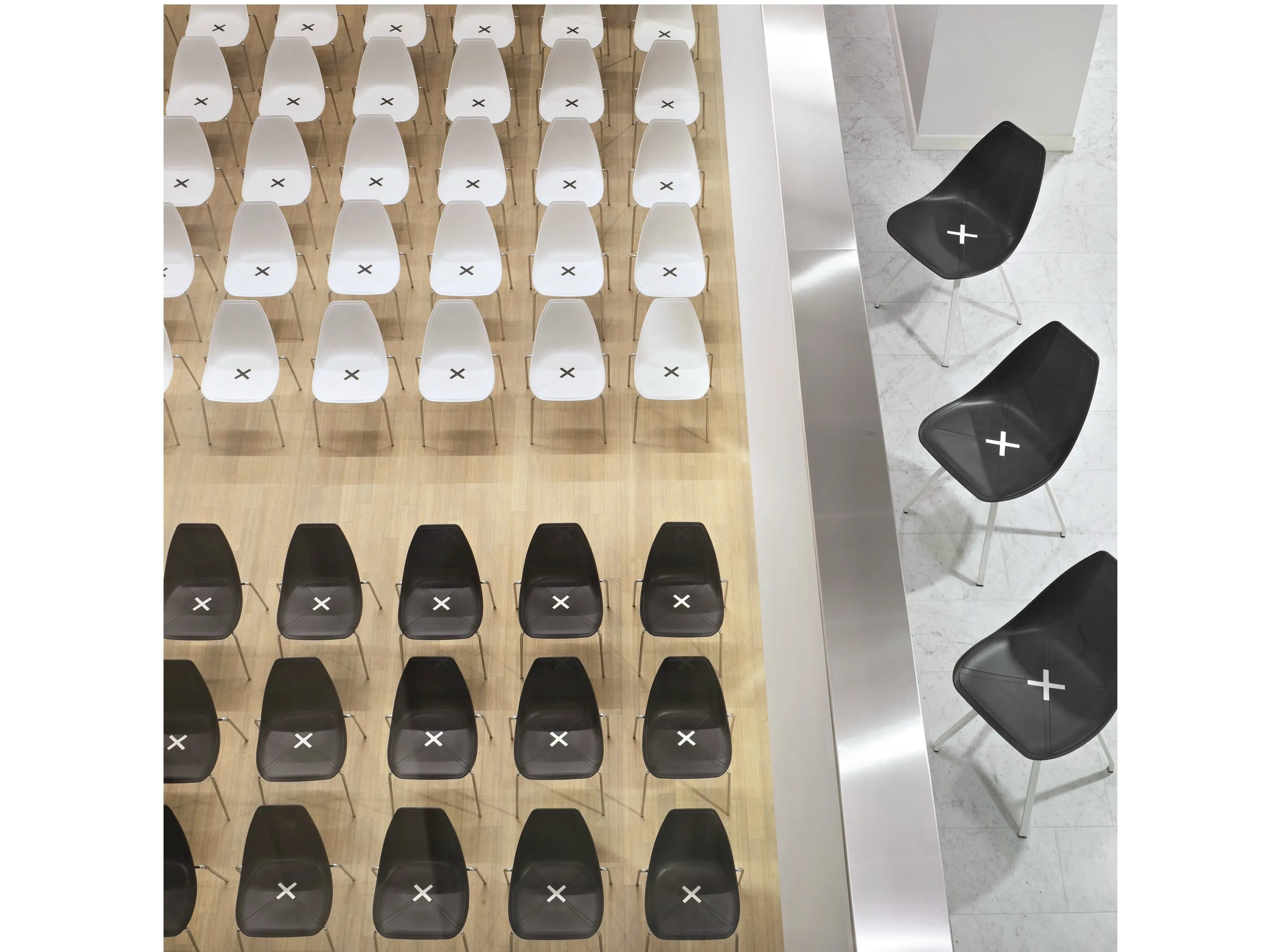 The X FOUR chair offers versatile seating solutions for various environments, including restaurants, conference rooms, coworking spaces, cafés, event venues, and educational institutions. This chair features a sturdy four-leg design, available with or without a cushion, ensuring comfort and durability. Constructed from chrome-plated steel and painted aluminum, it comes in a range of colors such as anthracite, white, and sand. The polypropylene shell is available in matching or contrasting hues, including yellow. The cross base is crafted from natural ash wood or polypropylene, complementing the shell's color. Ideal for dining tables and modern design tables, these ergonomic and stackable chairs are a practical choice for any setting requiring durable seating and adaptable conference room furniture.