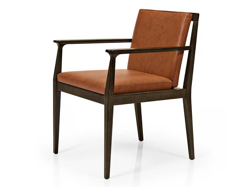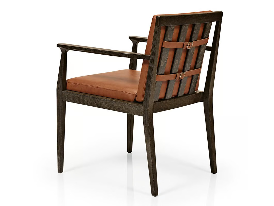 The ANNIE M1102 is a versatile seating option crafted from solid beech wood, featuring armrests and a seat and back upholstered in premium leather. Designed by Francisco Cardoso for MORE CONTRACT, this piece is part of the ANNIE collection, which includes a range of side chairs, armchairs, and lounge armchairs. Its modern design and durable construction make it suitable for various settings, including restaurants, conference rooms, coworking spaces, cafés, event venues, and educational institutions. The wide selection of wood stain finishes allows for seamless integration into any environment. Ideal for dining tables and conference room furniture, these ergonomic and stackable chairs offer both style and functionality, ensuring they meet the demands of high-traffic areas.