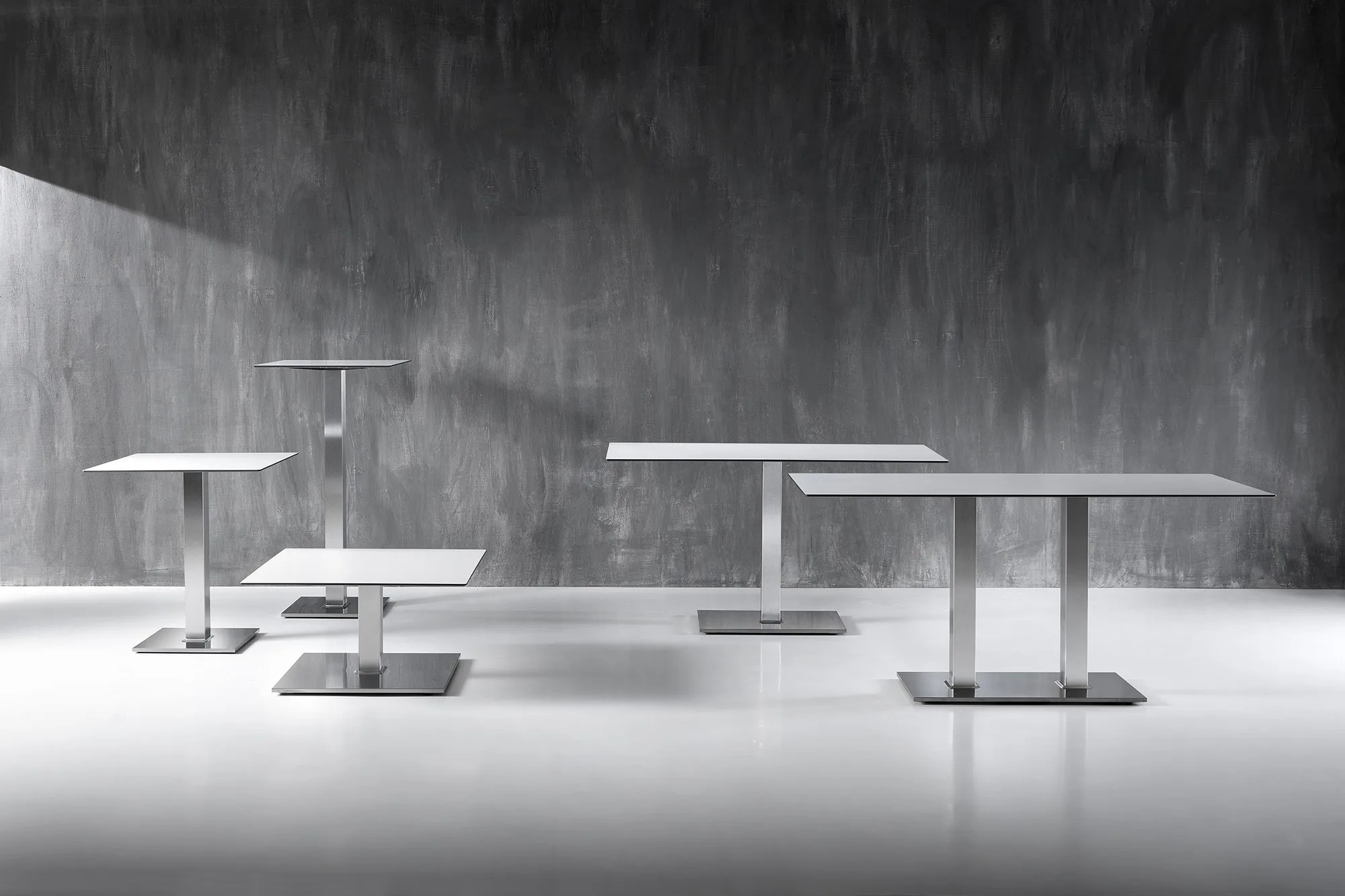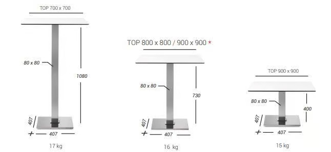 The BASE 400Q is crafted from stainless steel Aisi 441 and features four ABS feet, ensuring stability and durability. It includes a cast iron counterweight coated with epoxy powder and a die-cast aluminum "Star" top fixing cross, making it a reliable choice for furniture manufacturers and designers. This high-quality furniture fitting is adaptable to various tabletop shapes and colors, offering versatility for diverse environments such as restaurants, bistros, bars, and cafes. Its sleek design, characterized by stainless steel covers and squared columns, complements both indoor and outdoor settings. The flat surface of the cover enhances its suitability for modern furniture assembly, providing customizable components for furniture projects. Ideal for those seeking durable furniture hardware, adjustable hinges, and screws, the BASE 400Q serves as an excellent replacement part for chairs and tables.