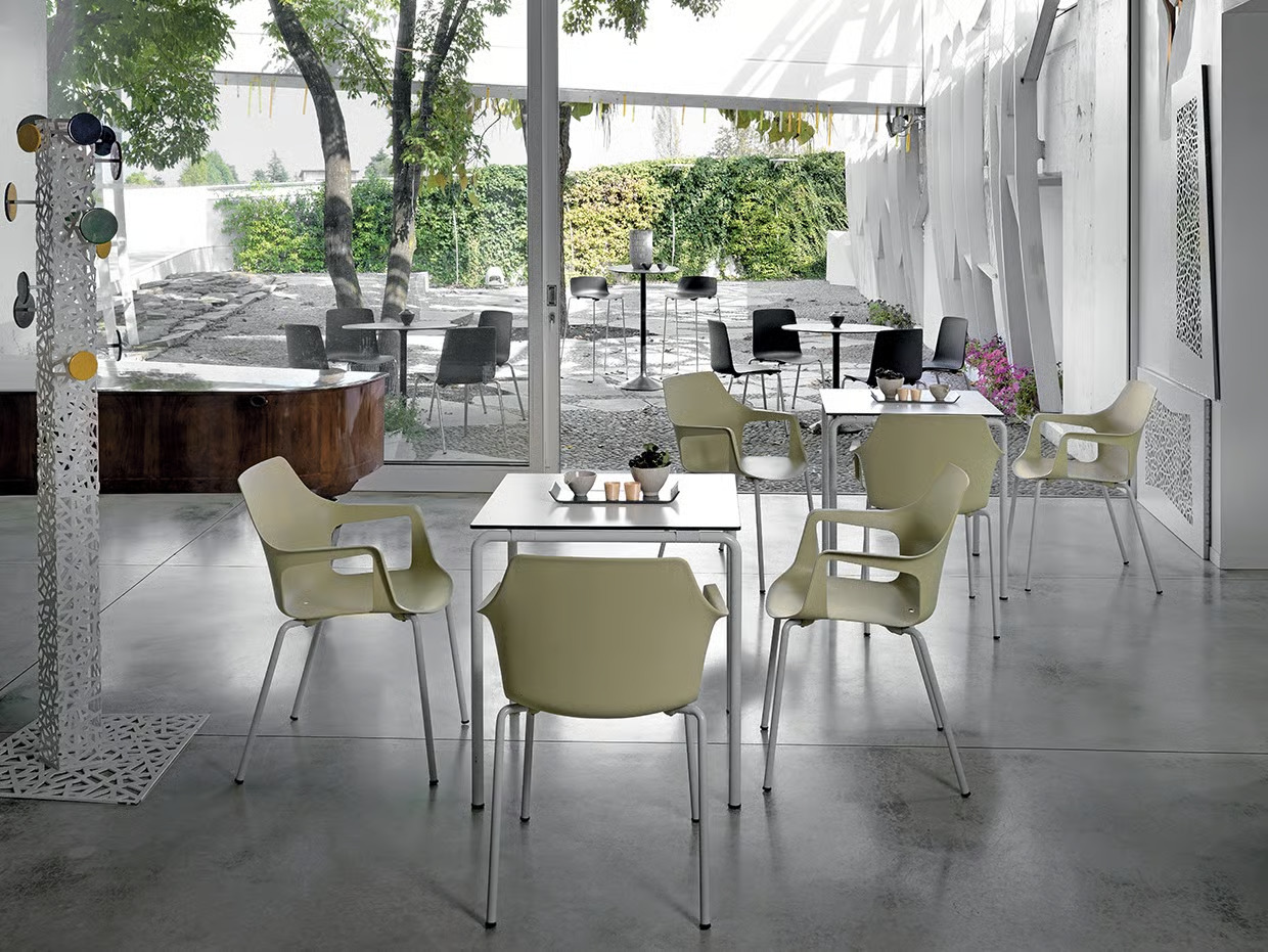 The VESPER 2 collection offers a versatile range of seating solutions, including chairs, armchairs, and stools, designed for diverse environments such as restaurants, conference rooms, coworking spaces, cafés, event venues, and educational institutions. Featuring fiberglass polypropylene shells and sturdy metal frames, these modern design tables and café chairs are available in both chromed and varnished finishes, making them suitable for indoor and outdoor use. The ergonomic chairs can be enhanced with optional panels in fabric or eco-leather, providing additional comfort. With their stackable design, these durable seating options are ideal for spaces requiring flexible arrangements. The collection's minimalist aesthetic and variety of color combinations ensure seamless integration into any setting, making it a practical choice for conference room furniture and beyond.