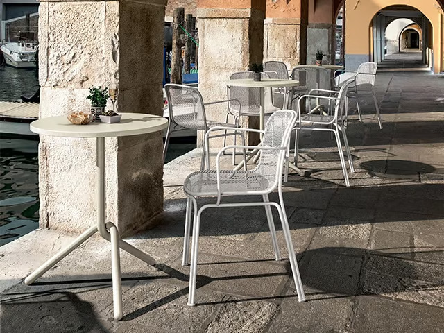 VILLA 2 offers a blend of classic elegance and modern aesthetics, crafted entirely from metal. Drawing inspiration from the iconic outdoor seating of Parisian terraces, this chair features a refined steel rod frame and a wire metal mesh for body contact, ensuring both visual lightness and structural strength. Its ergonomic design includes a shell that is slightly elevated from the legs, enhancing mobility. Ideal for restaurants, conference rooms, coworking spaces, cafés, event venues, and educational institutions, VILLA 2 provides durable seating solutions. The stackable design makes it a practical choice for various settings, particularly for outdoor environments. This versatile piece complements modern design tables and serves as an excellent addition to conference room furniture, dining tables, and café chairs.