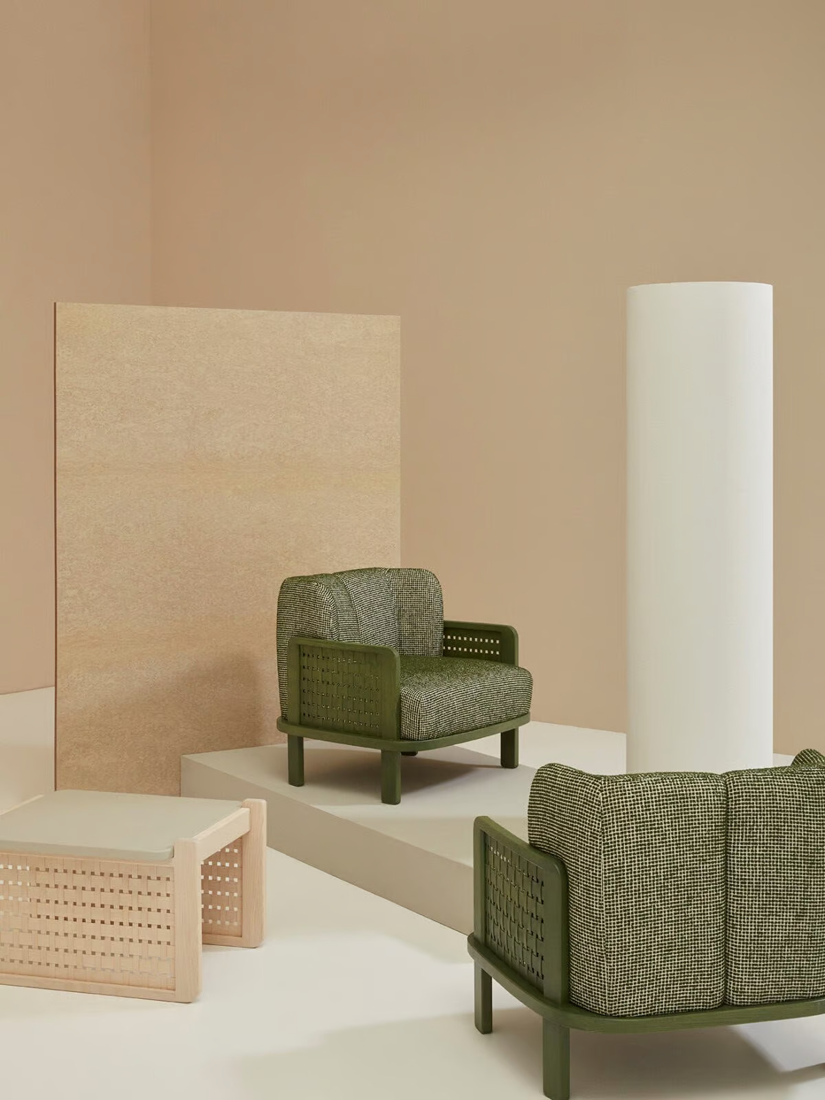 The RAQUETTE Armchair, designed by Cristina Celestino, features a solid ash wood frame and fabric-upholstered seat, making it an ideal choice for hotels, cafés, lounges, and waiting rooms. This luxury armchair draws inspiration from tennis, with its sides resembling racquet strings through intricate latticework. The design seamlessly integrates the wooden structure with soft, organic cushioning, offering a modern lounge seating solution. Its ergonomic design ensures comfort, while the customizable upholstery options allow for tailored aesthetics. Suitable for both residential interior designers and commercial spaces, this piece exemplifies modern lounge furniture, providing a compact yet luxurious seating option.