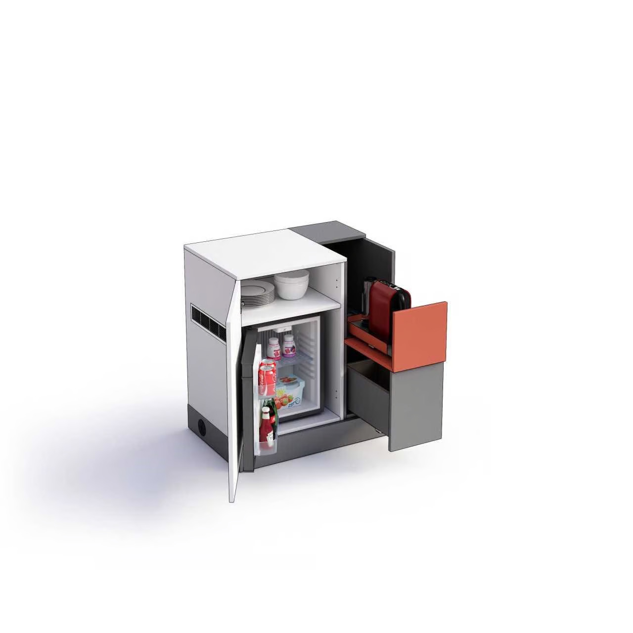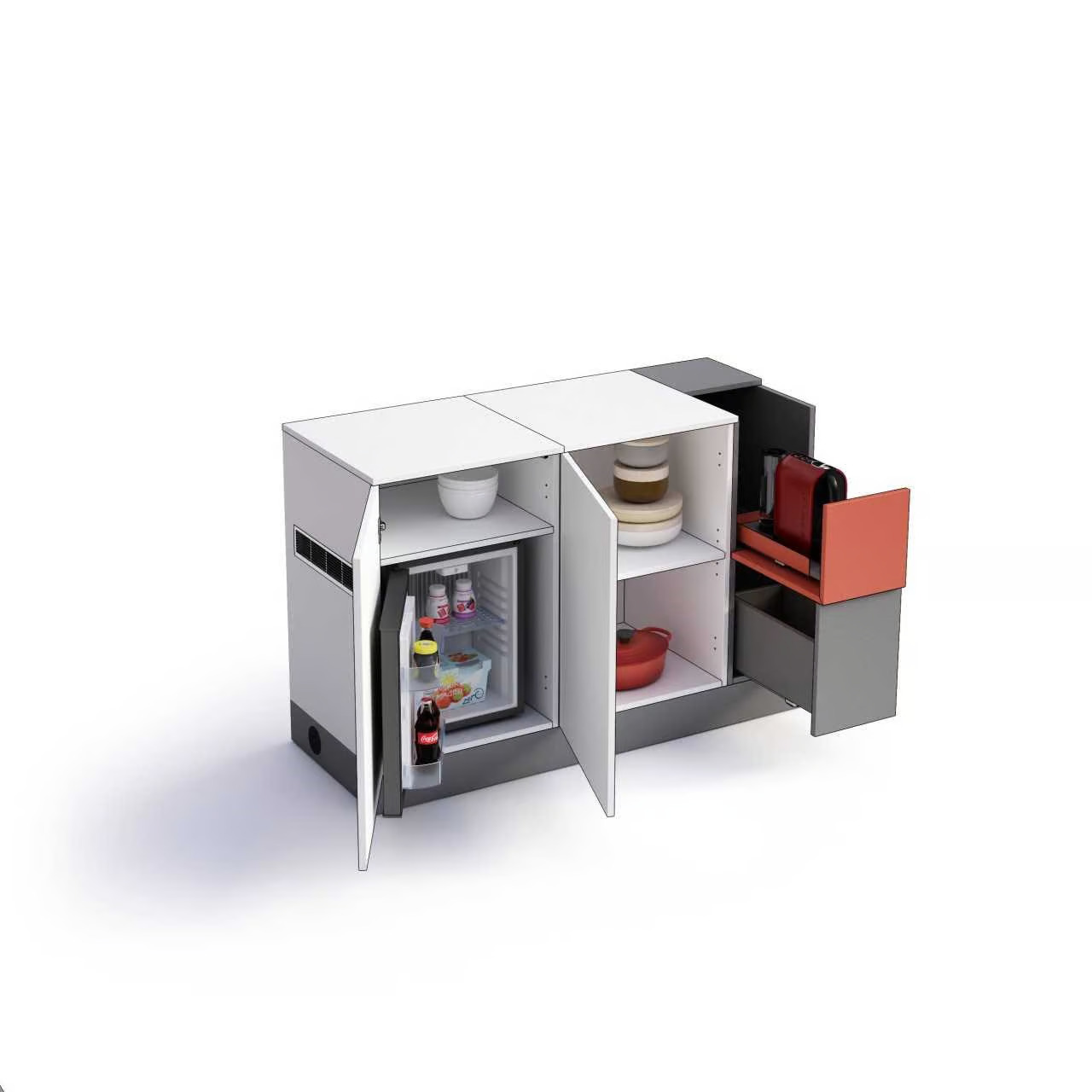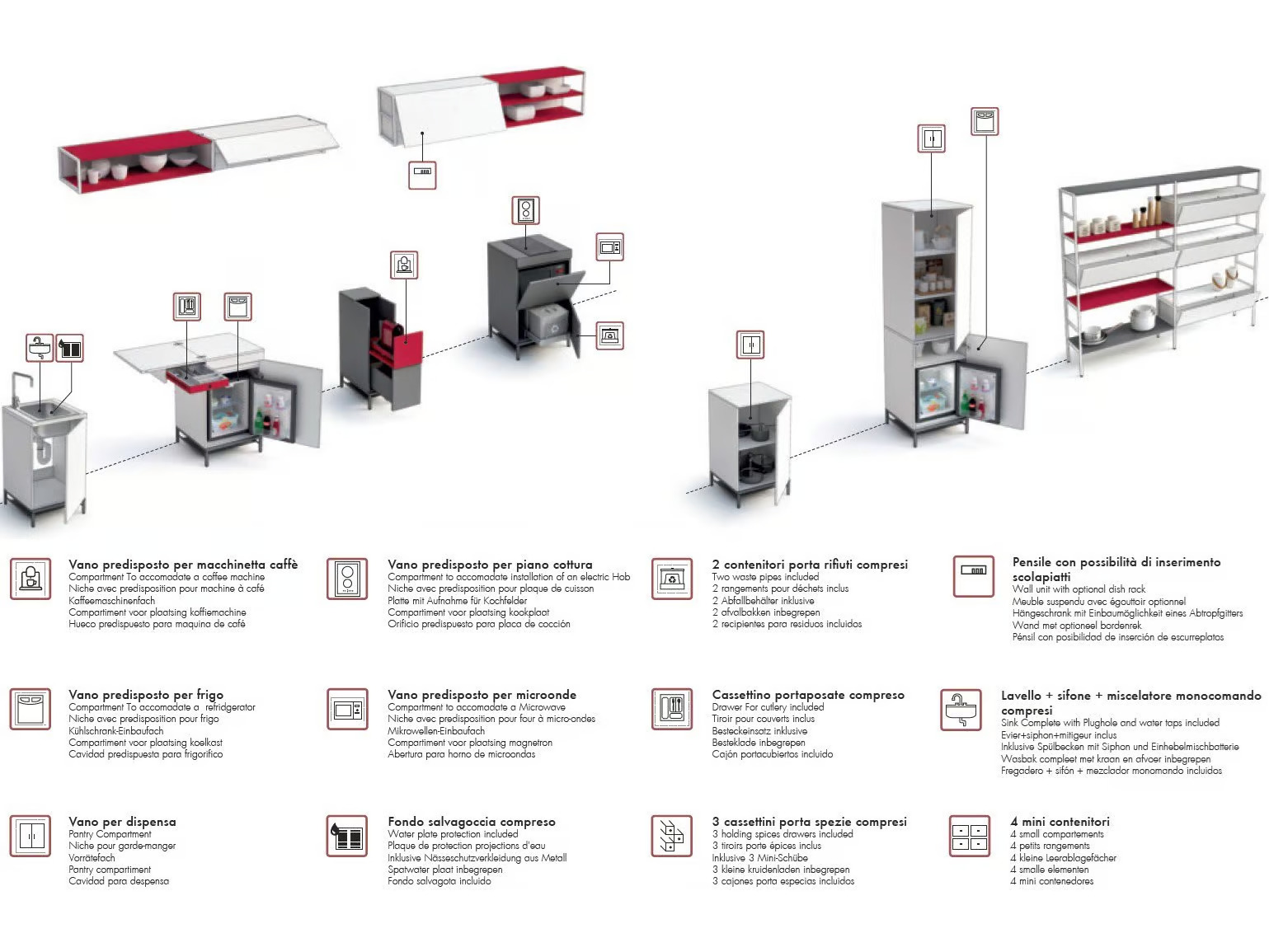 The DOMOMAG Mini Kitchen with Peninsula offers a versatile solution for restaurants, boutique hotels, catering businesses, residential kitchens, and culinary schools. This modular kitchen system is designed for space efficiency, featuring compartments for a coffee machine, refrigerator, electric hob, and microwave. A dedicated pantry compartment and a cutlery drawer enhance organization. Constructed with durable stainless steel, this luxury kitchen design includes two waste pipes and water plate protection for added functionality. The wall unit can be customized with an optional dish rack, providing additional storage. This space-efficient kitchen solution is complete with electrification, ensuring seamless integration into any commercial kitchen furniture setup. Its compact and mobile design allows for easy repositioning, making it an ideal choice for dynamic culinary environments.