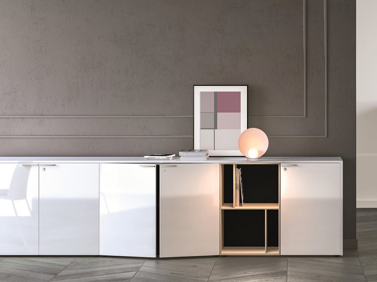 The JET EVO Acrylic Office Storage Unit combines glossy white acrylic with natural oak melamine, offering a sophisticated storage solution for corporate offices, coworking spaces, and educational institutions. This unit is part of the Jet Evo range, which features a harmonious blend of glossy and matte finishes, enhancing the aesthetic of modern office desks and collaborative workspace furniture. Designed to complement ergonomic office chairs and modular workstation furniture, the storage unit includes versatile options such as freestanding and integrated wheeled drawers and cabinets, available in various heights and widths. The emphasis on high-quality materials ensures a stylish and functional addition to any professional environment, seamlessly integrating with adjustable height desks and other contemporary office furnishings.