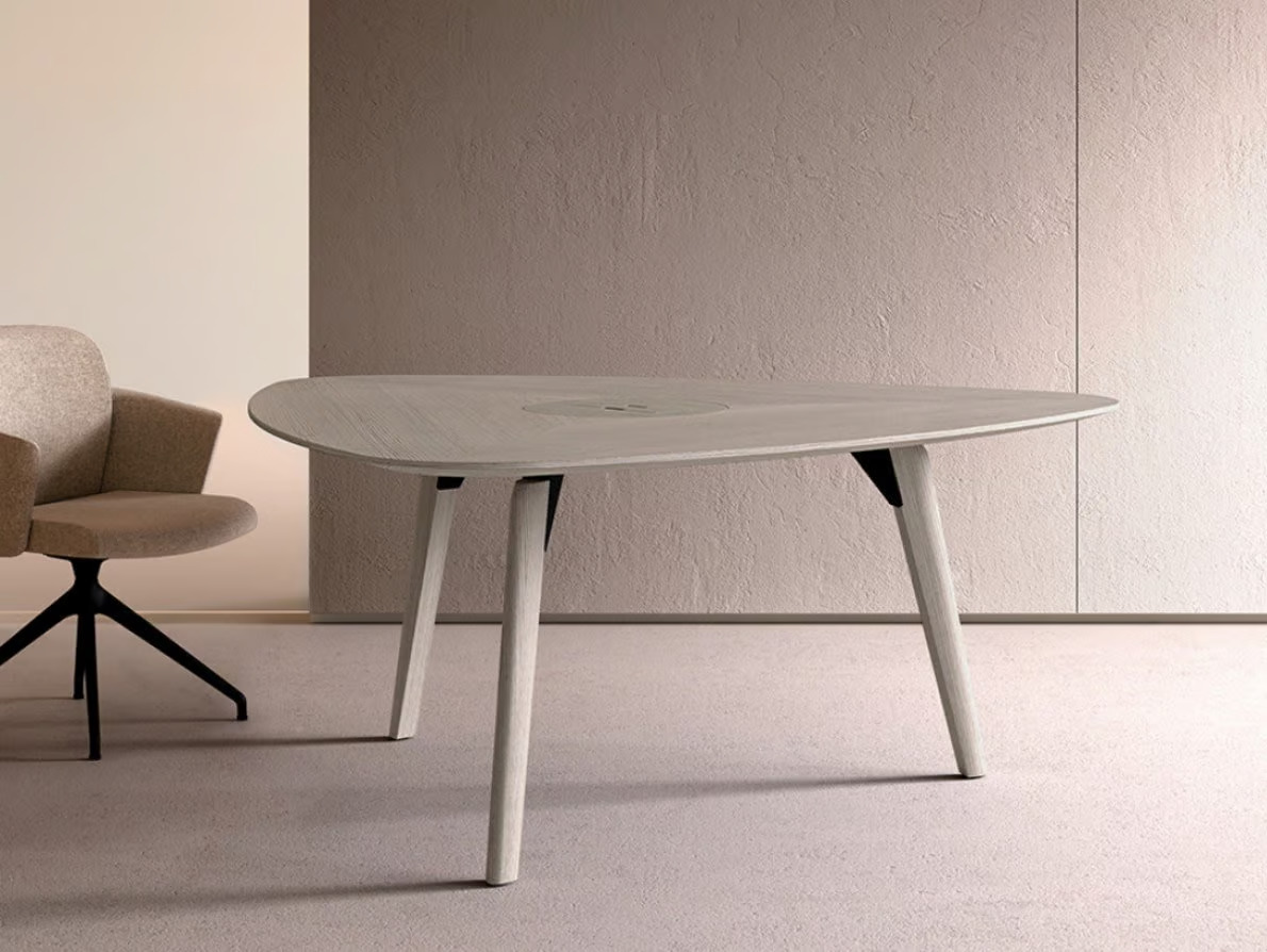 The RAIL Triangular Meeting Table, crafted in Italy, exemplifies the distinctive quality of Made in Italy products. Designed for versatility, it seamlessly adapts to various professional environments, from executive offices to coworking spaces. Its innovative triangular shape serves dual purposes, functioning as both an executive desk and a conference table. This modern meeting room table enhances spatial organization, promoting interaction and collaboration. Available in four configurations, it offers a clear glass top with a choice of five materials paired with polished chrome-plated steel, or a wooden top, a combination of wood and eco-leather, or an eco-leather top in three finishes. The structure, in wooden, mixed, or leather versions, is complemented by matt black lacquered steel. Ideal for offices, clinics, and government buildings, it pairs well with comfortable meeting room chairs and modern waiting room seating, making it a durable choice for reception area furniture.