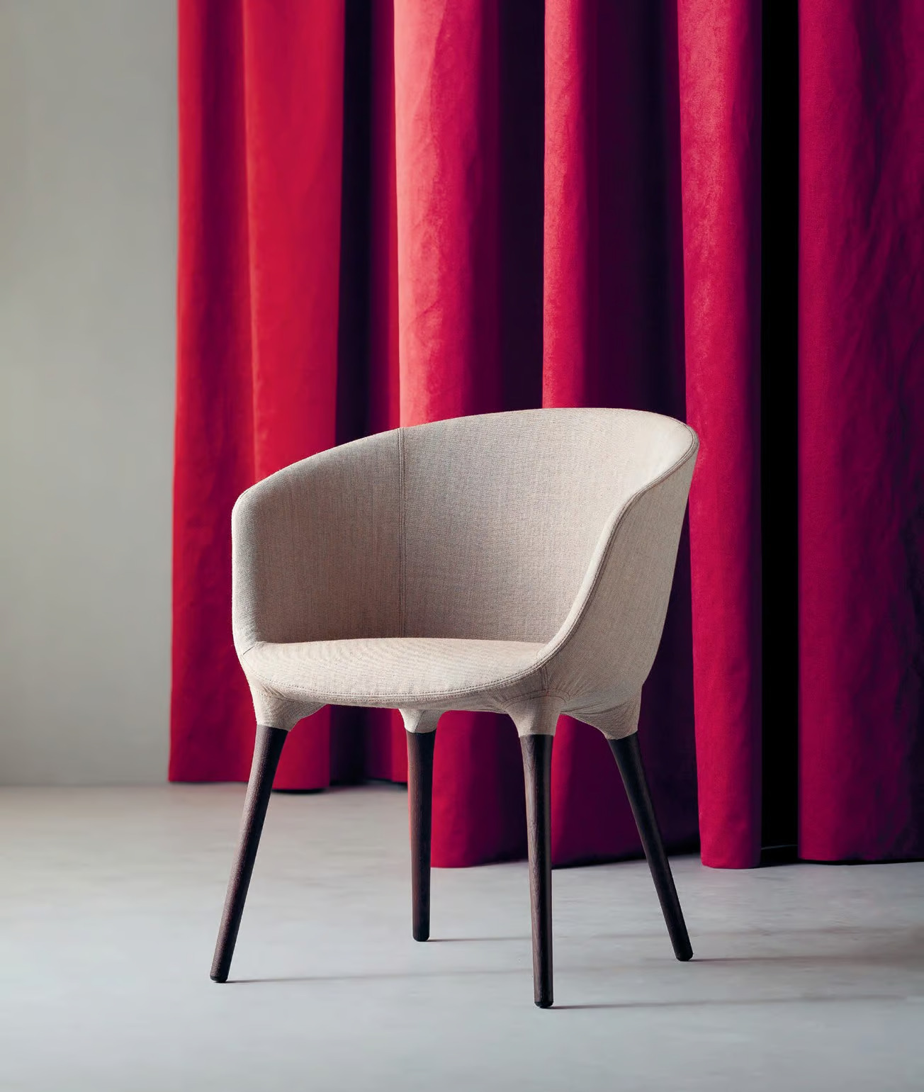 The SPRING Easy Chair combines soft, inviting lines with meticulous attention to detail, highlighted by visible stitching that showcases its custom upholstery craftsmanship. Its standout feature is the seamless integration of the shell with elegant legs, available in various materials, forming a cohesive design. This luxury armchair complements modern lounge furniture with its versatile design, suitable for hotels, cafés, lounges, and waiting rooms. The chair is part of a broader collection that includes four table models, featuring surfaces made from Fenix-NTM®, a cutting-edge material known for its water repellency and resistance to scratches and light-induced aging. Depending on the frame and top shape, these tables fit seamlessly into both residential and commercial settings, serving as coffee or side tables.