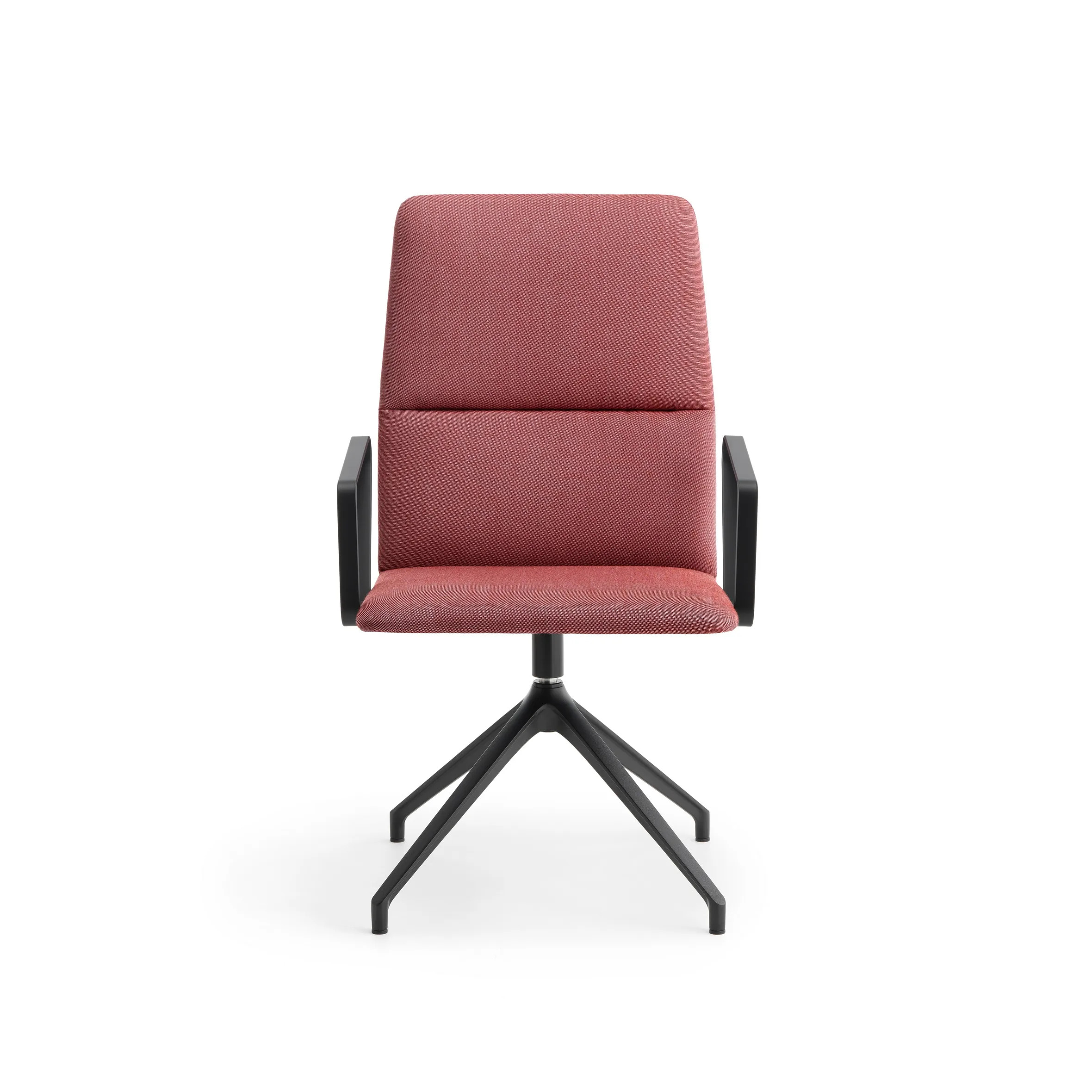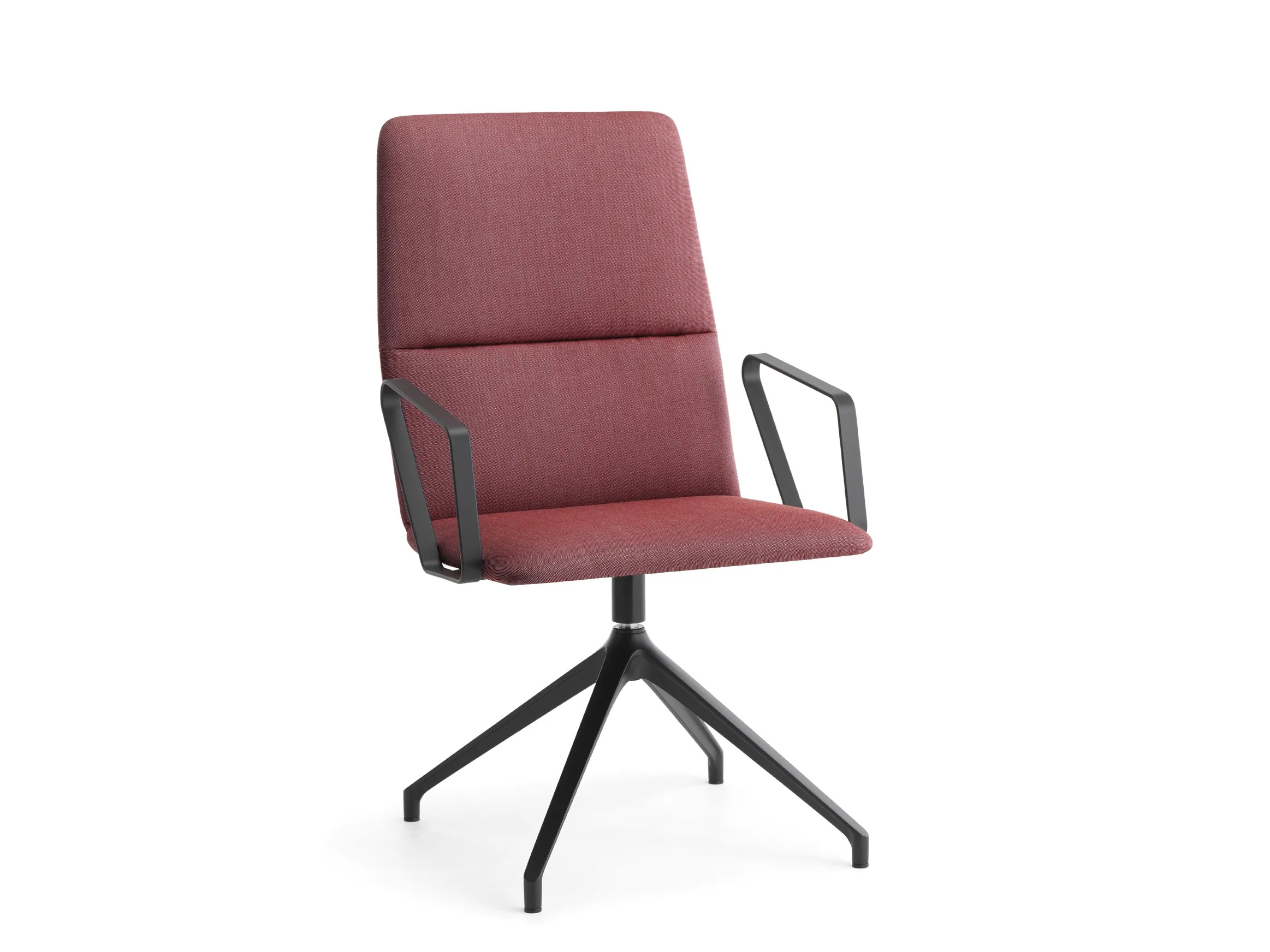 The AURA PC PB Executive Chair is crafted for diverse professional environments, including corporate offices, coworking spaces, and educational institutions. This ergonomic office chair features a swivel design with a plywood seat and back, upholstered in flame-retardant foam for safety and comfort. Its pedestal base is constructed from powder-coated aluminum, offering durability and a sleek appearance. The chair's design is both severe and harmonious, catering to the needs of modern office desks and collaborative workspace furniture. Available in various configurations, it includes options such as a small armchair, lounge chair, and desk chair with two back height choices and metal or padded arms. The stool variant comes in 65 or 82 cm heights with two back height options. A selection of bases and finishes is offered, including four oak legs or a swivel trestle base in oak or aluminum, with optional castors. The version with five aluminum spokes is specifically tailored for modular workstation furniture and adjustable height desks.