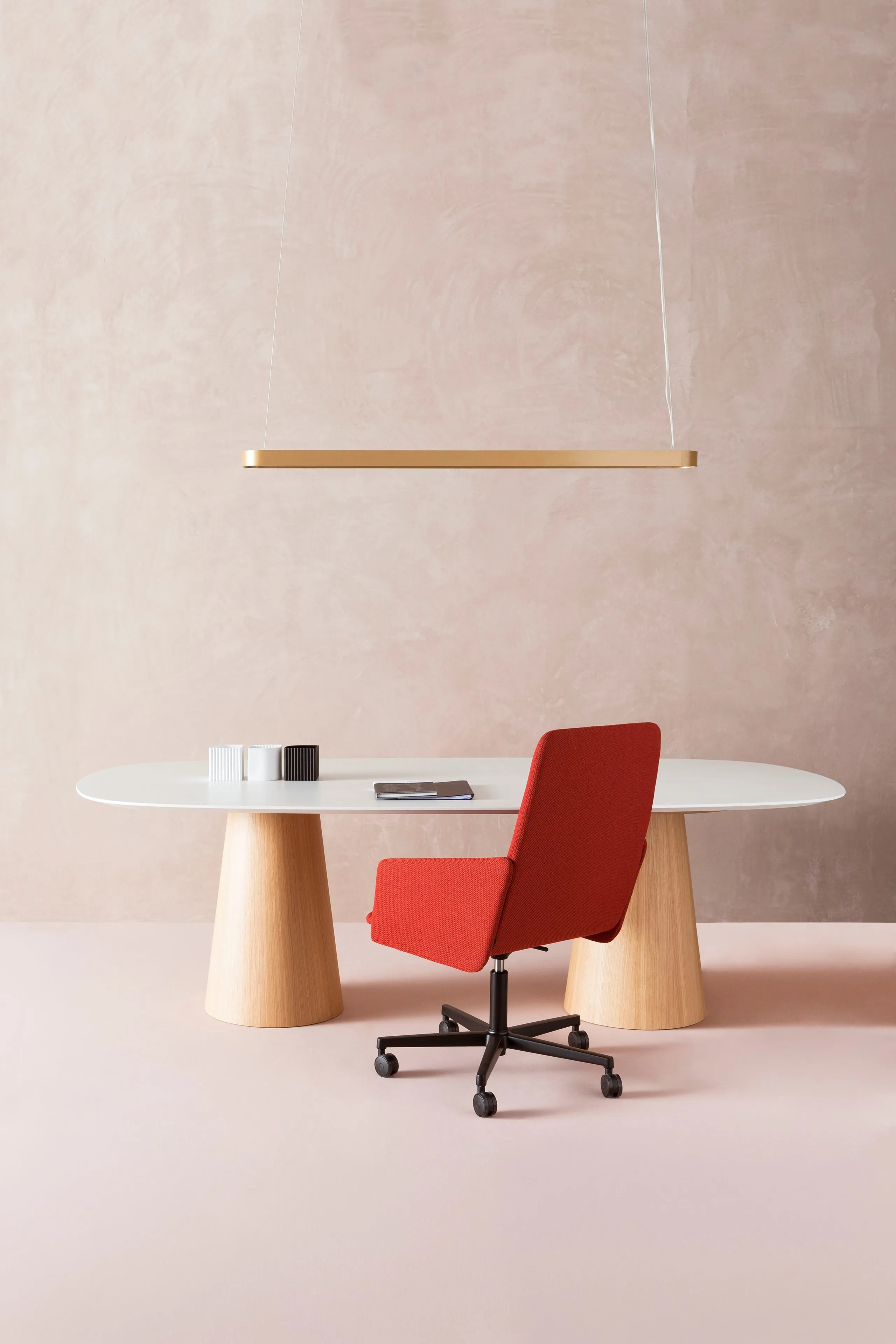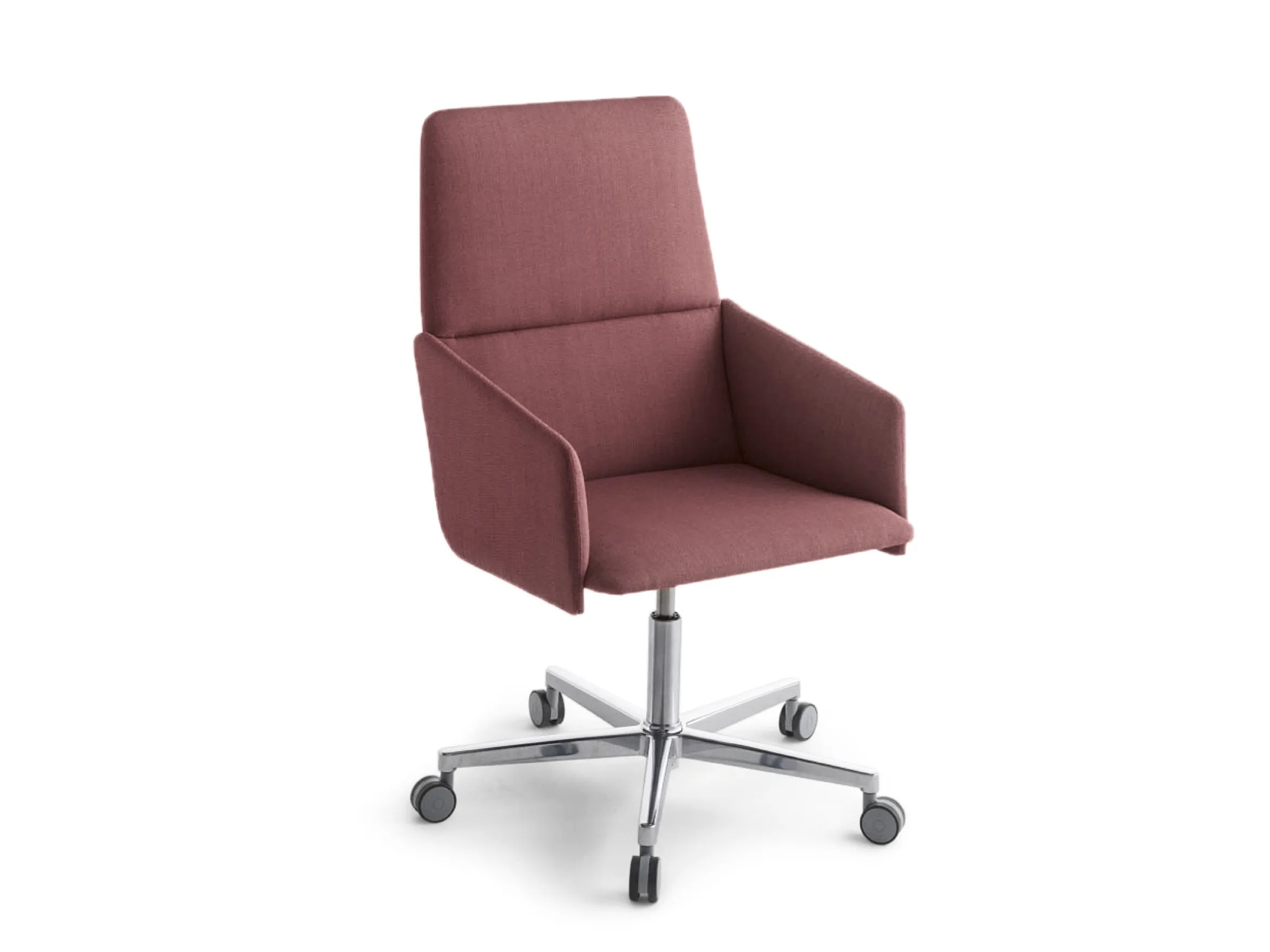 The AURA PC SW Executive Chair is crafted for diverse professional environments, including corporate offices, coworking spaces, and educational institutions. This ergonomic office chair features a plywood seat and back, upholstered with flame-retardant foam for enhanced safety and comfort. Its swivel base, made from die-cast aluminum, is height-adjustable and available with optional castors, making it a versatile addition to modern office desks and collaborative workspace furniture. The chair's design offers a range of options, including small armchairs, lounge chairs, and desk chairs with varying back heights and arm styles. Additionally, stools are available in two heights, with multiple base and finish choices, such as oak legs or aluminum trestle bases. The version with five aluminum spokes, with or without castors, is particularly suited for modular workstation furniture and adjustable height desks.