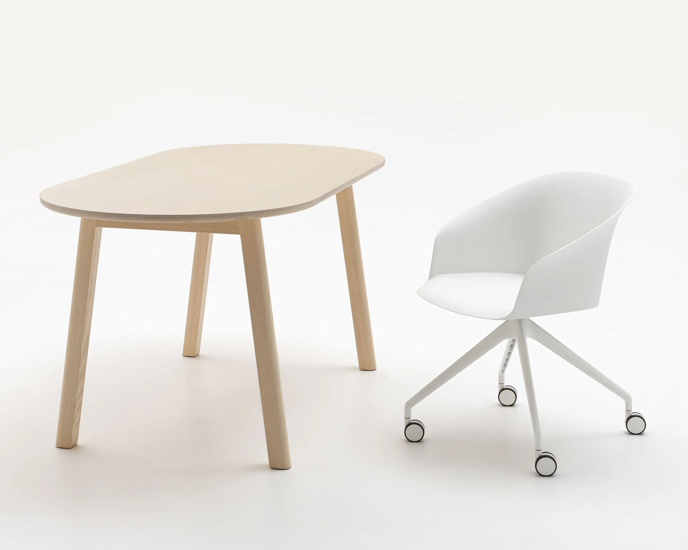 FOLIO offers a versatile solution for dining tables and café chairs, ideal for restaurants, conference rooms, coworking spaces, and more. Crafted with a solid ash wood structure, its wooden top exemplifies a modern design that seamlessly integrates into various environments. The focus on functionality is evident in its adaptable design, suitable for both common areas and workspaces. Made from European solid wood, FOLIO is easily disassembled and transported, aligning with sustainable practices through its FSC certification. Available in different heights, the table top can be customized in size and finish, including options like solid wood, laminate, HPL, and Fenix. This range of ergonomic and stackable chairs complements the table, providing durable seating for educational institutions and event venues.