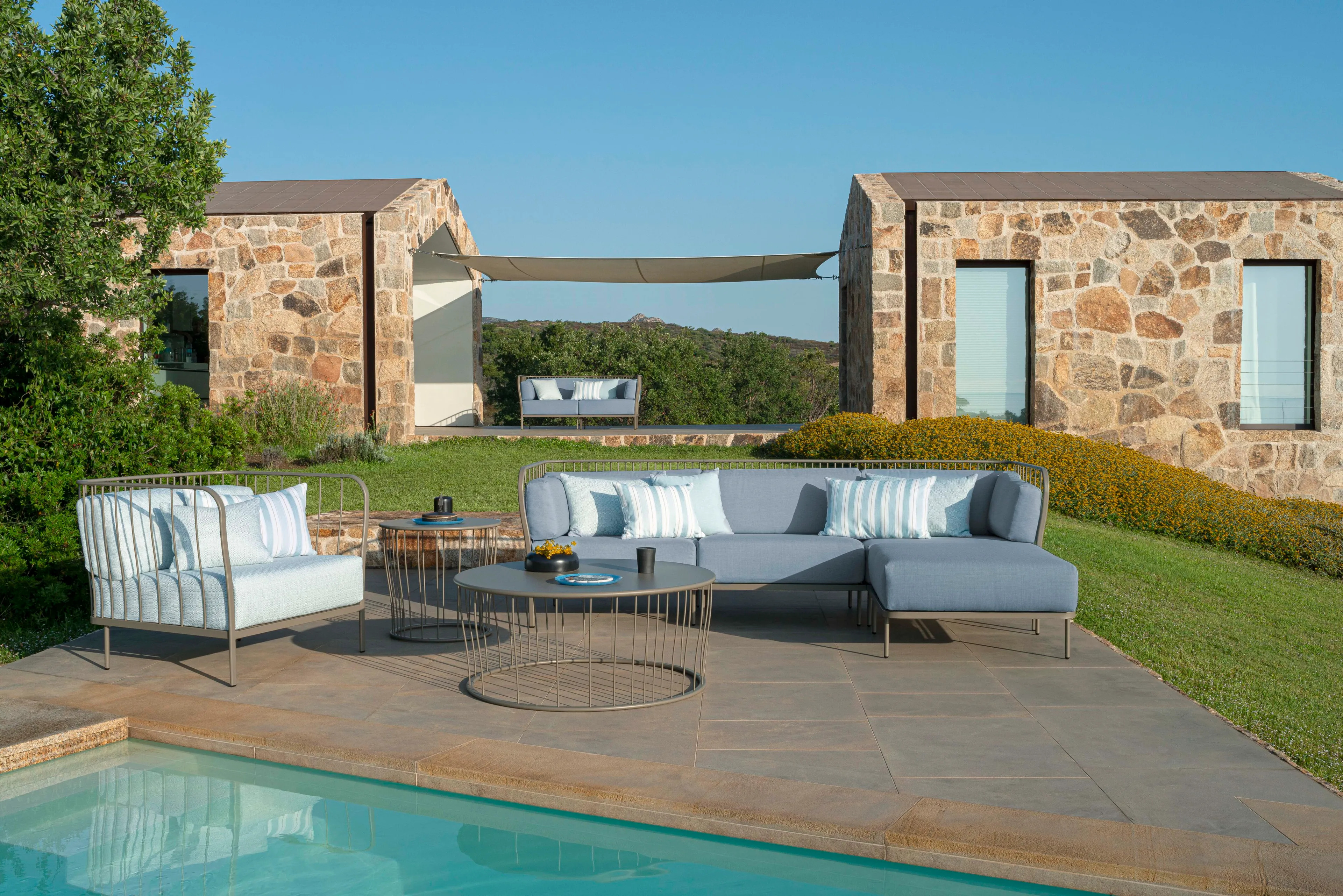 The Cannolè collection offers a versatile range of durable outdoor furniture, ideal for resorts, cafés, restaurants, outdoor event planners, and beachside hotels. Designed by Anton Cristell and Emanuel Gargano, this modular outdoor seating system features a robust steel structure with a fabric covering. The fully welded frame is crafted from internally and externally galvanized steel tubes, ensuring longevity and resistance to the elements. The seating includes a galvanized rod grid welded onto a rod frame, supported by tubular steel legs. The collection comprises corner and linear module sofas, a pouf, a low armchair, and a low table. Cannolè cushions are crafted from polyurethane rubber with an added polyester fiber resin layer, encased in a waterproof polyamide pillowcase. Available in a variety of colors, the structure comes in antique iron, matt white, black, maple red, Indian brown, and sand, while the cushions are offered in a selection of basic, standard, and premium fabrics.