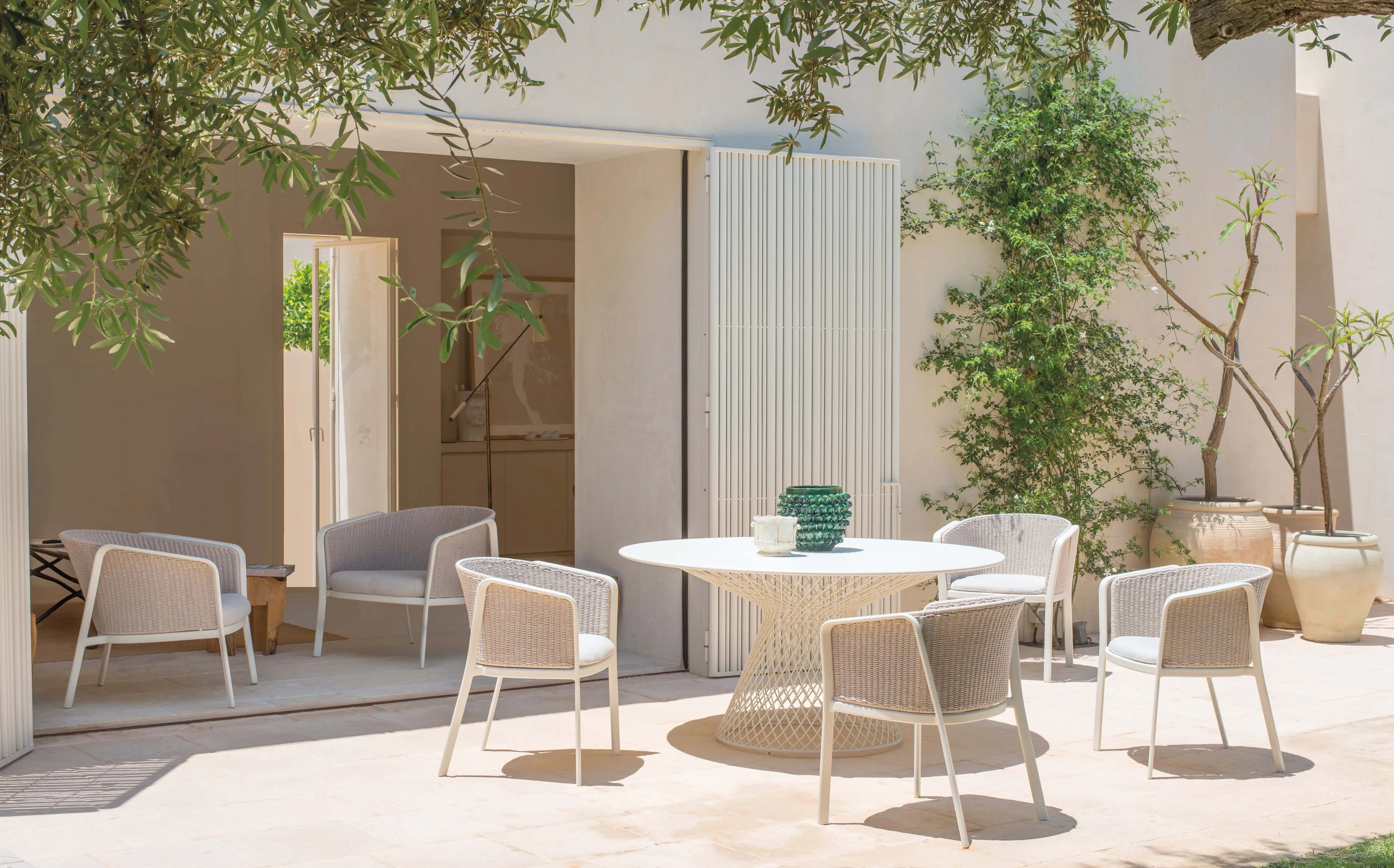 The Carousel 1214 armchair combines industrial design with a handcrafted appeal, showcasing EMU's technical and manufacturing expertise. Its aluminum frame, known for durability and outdoor performance, is adorned with a variety of materials and colors, offering versatility for diverse settings. The technical fabric version, suitable for outdoor use, is crafted through a special pressure molding process, ensuring comfort and mechanical strength. The interwoven version features natural, warm tones, enhancing its adaptability across environments. The armrest, made from a unique aluminum profile, mimics the geometry of handmade wood, adding an elegant touch. The collection includes dining and lounge armchairs, with the dining version featuring a water-repellent technical fabric. Made in Italy, the Carousel collection is ideal for restaurants, conference rooms, coworking spaces, cafés, event venues, and educational institutions, providing durable seating and modern design.