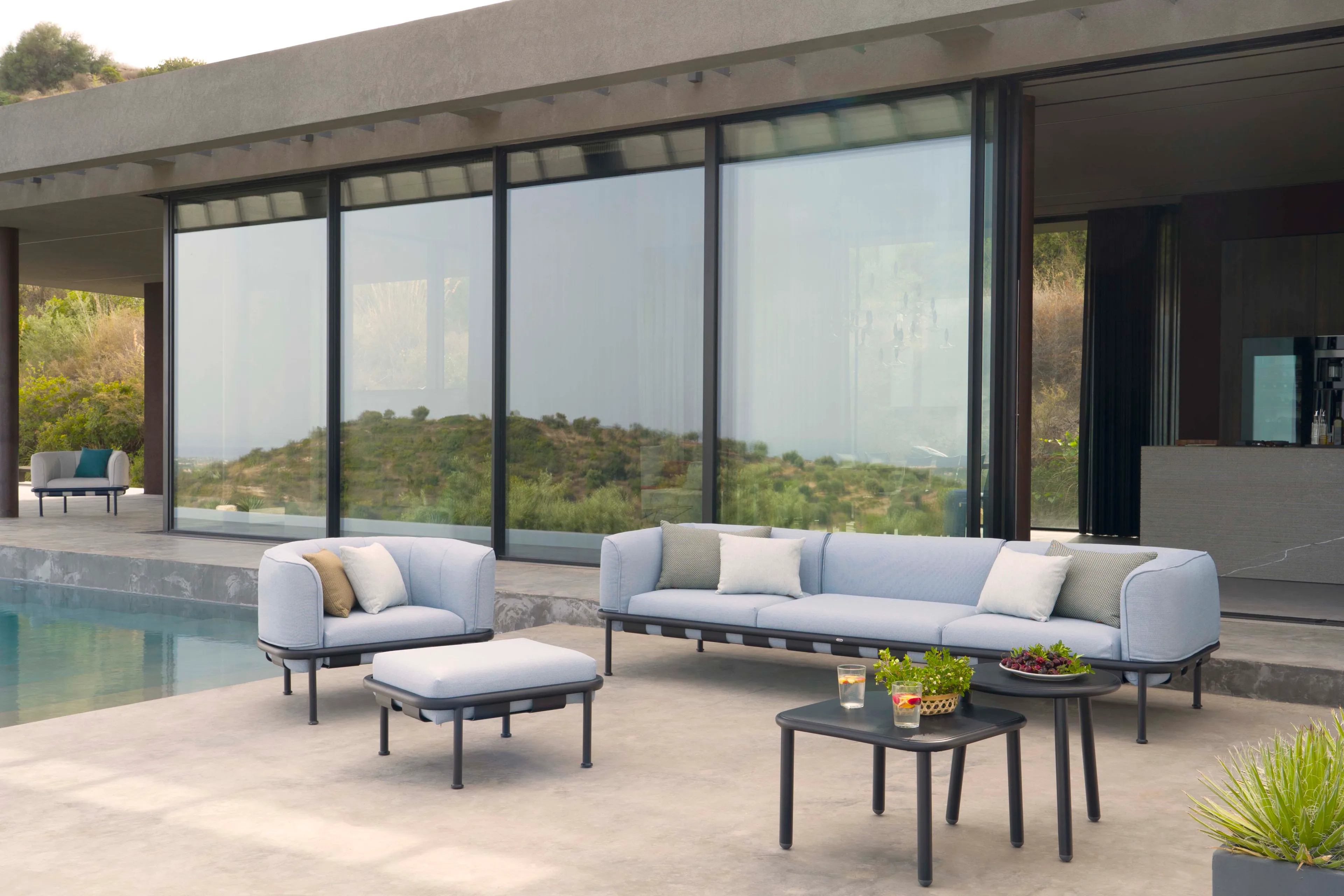 The DOCK Pouf offers a versatile modular seating solution, ideal for resorts, cafés, restaurants, outdoor event planners, and beachside hotels. Its design allows for effortless assembly, creating a range of configurations from day beds to various sofa sizes. Constructed with a durable aluminum frame, it ensures longevity and stability. The cushions, crafted from foam rubber and covered in Ferrarì Batyline outdoor fabric, provide comfort and resilience against weather conditions. This all-weather outdoor furniture is easy to maintain, with a light and flexible fabric that resists atmospheric agents. A convenient inside pocket allows the cushions to be securely positioned on the backrest, enhancing the functionality of this durable patio seating option.