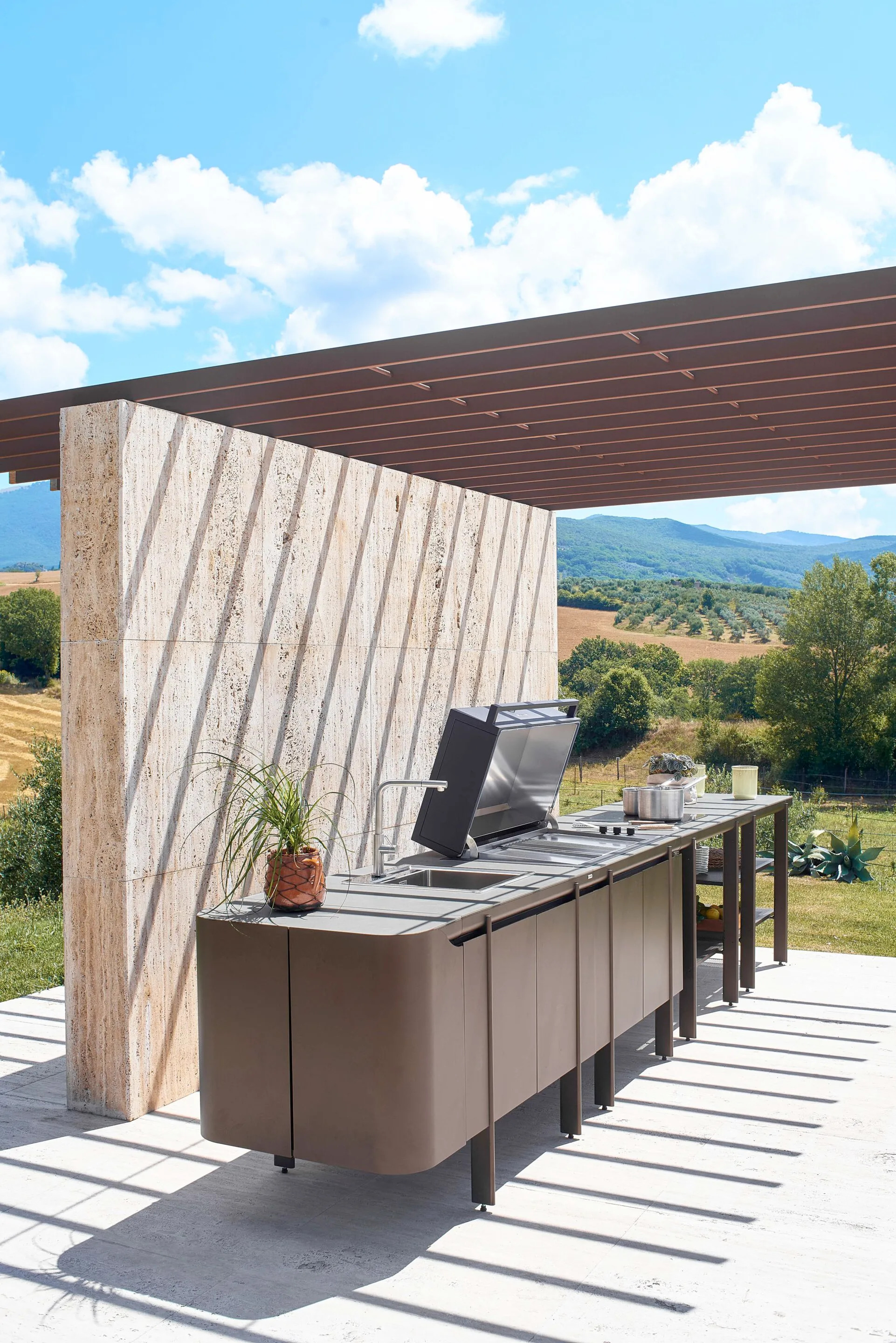 Emily by EMU D&S Lab offers a sophisticated modular outdoor kitchen system crafted from durable aluminum with a sleek stoneware top. This versatile setup includes a variety of components that can be arranged individually or combined to form comprehensive and functional configurations. The modules are available in both open and closed designs, featuring intermediate shelves and side containers. These elements cater to diverse cooking, washing, and barbecuing requirements, providing practical support surfaces. Ideal for luxury resorts, high-end restaurants, and boutique hotels, Emily integrates seamlessly with stainless steel outdoor cooking units and built-in grills, ensuring a weather-resistant and elegant solution for outdoor dining.