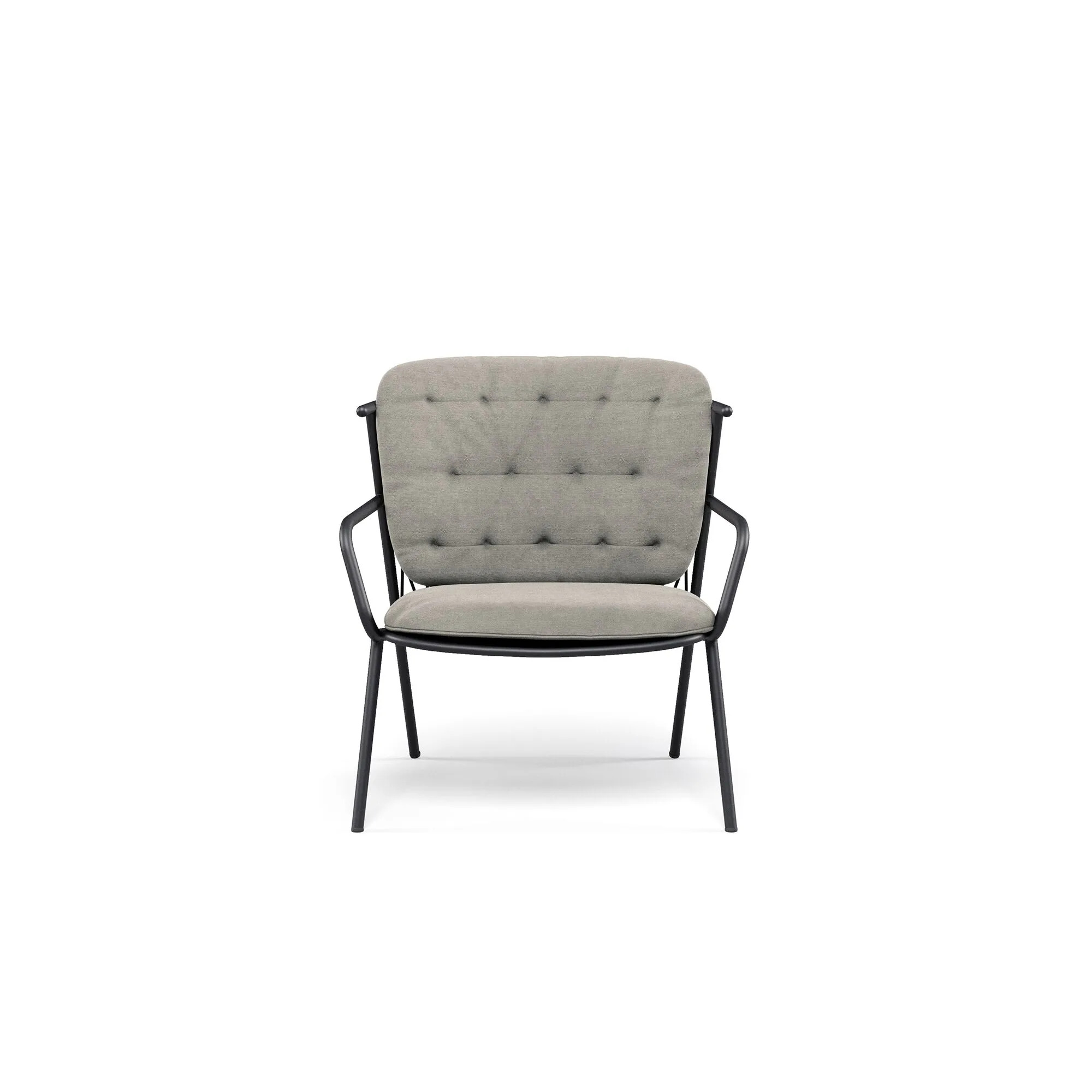 Designed by Patrick Norguet for EMU, the NEF collection offers a sophisticated blend of eclectic style and visual lightness, crafted entirely from aluminum. This modern lounge furniture features a tubular frame paired with a pressed sheet metal seat, enhanced by interwoven polyester cords secured with aisi316 stainless steel clips. The ergonomic design provides a natural sense of comfort and warmth, with generous dimensions that offer both protection and openness. NEF's diverse range includes luxury sofas and armchairs suitable for hotels, cafés, lounges, and waiting rooms, with options for dining and lounge seating. The collection's modular sofas and customizable designs cater to various interior needs, including compact furniture solutions for small spaces. Available in several color combinations: grey/green frame with charcoal grey cord, black frame with black cord, and white frame with grey rope.