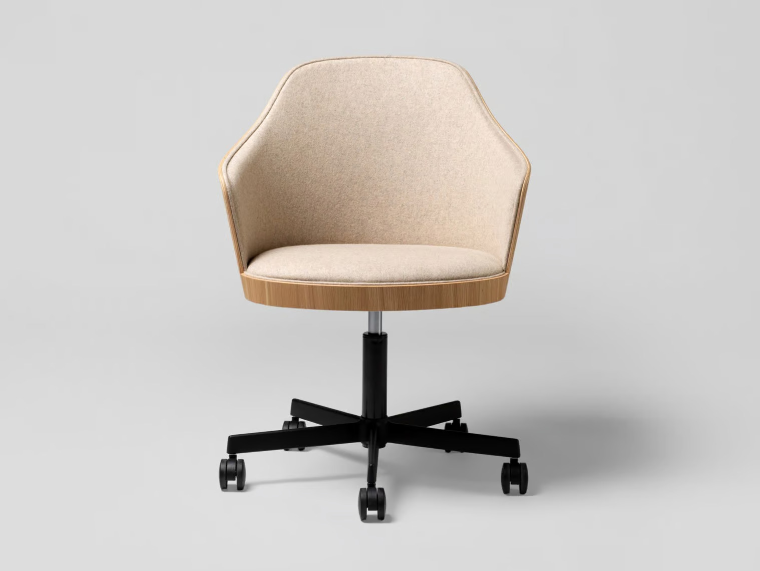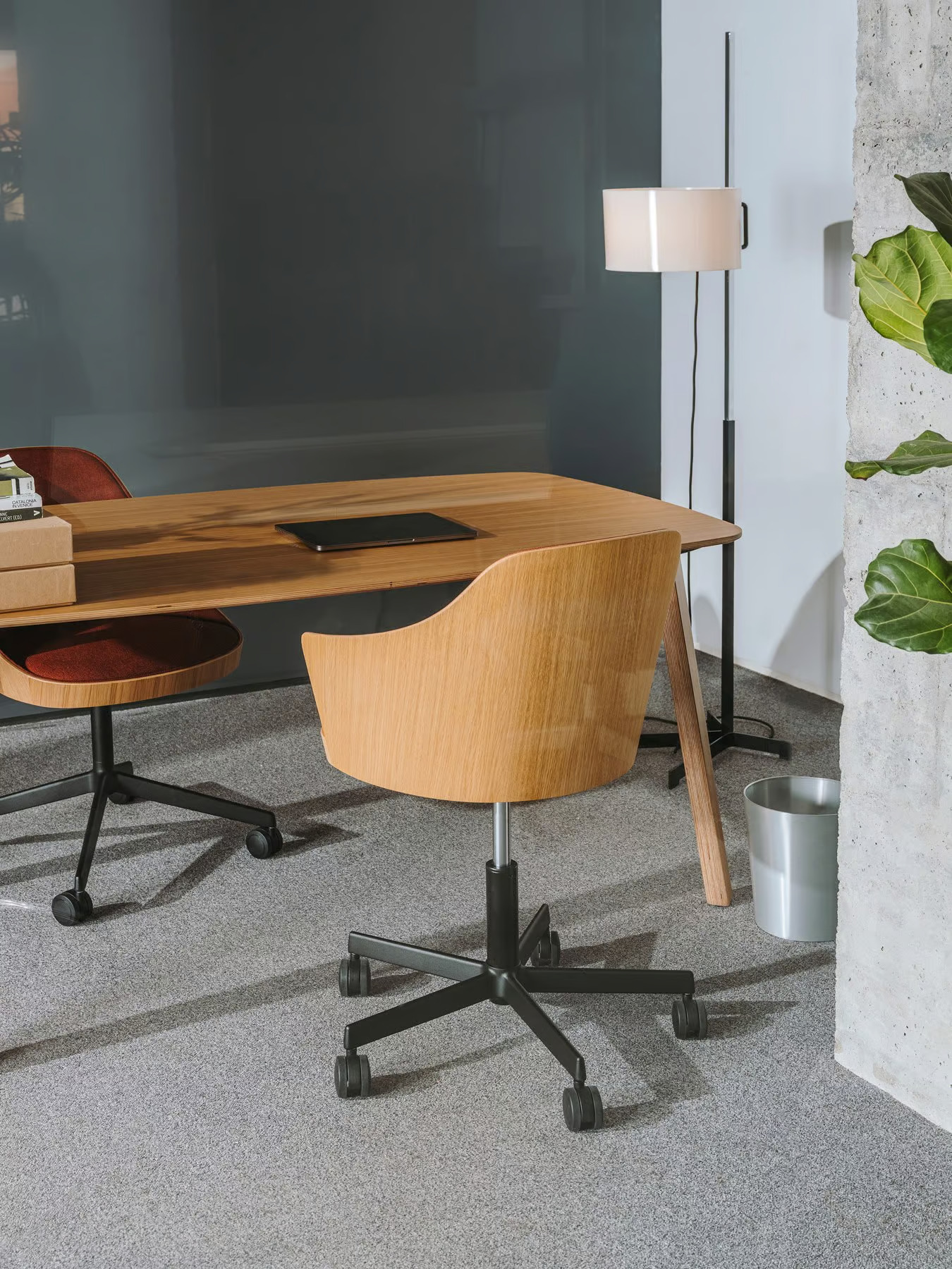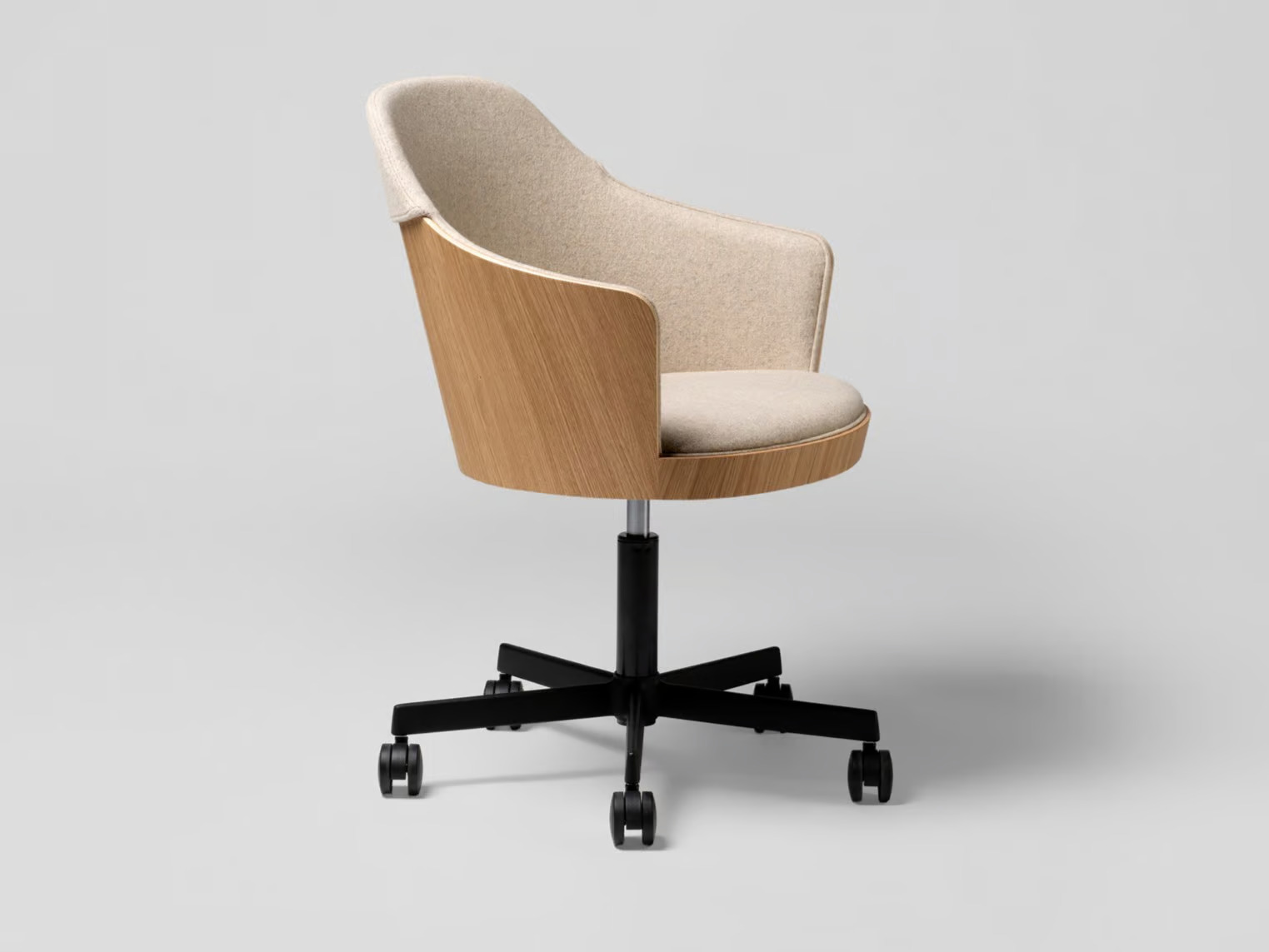 The KAIAK OFFICE chair, designed for corporate offices, coworking spaces, and educational institutions, features a versatile shell crafted from natural or stained oak wood. Available with or without armrests, it offers a variety of upholstery options, including fully upholstered, seat-only, three-quarters, and inside upholstery. Its 5-star base can be customized with any of Enea's color options, making it a perfect fit for modern office desks and collaborative workspace furniture. The chair's design seamlessly blends the elegance of oak with the comfort of upholstery, making it an ideal choice for ergonomic office chairs and modular workstation furniture. Suitable for both public and professional environments, the KAIAK OFFICE chair enhances any setting with its adaptable style and functionality.