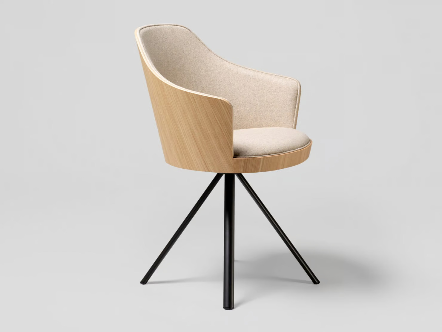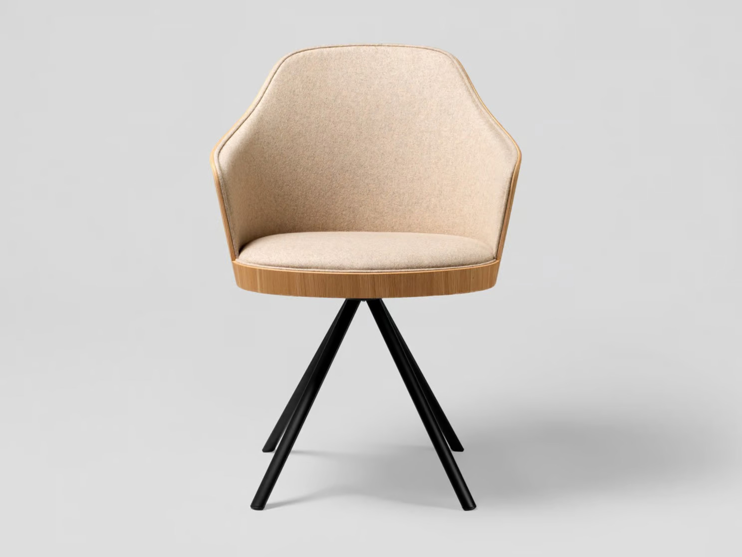 The KAIAK SPIN chair features a versatile design with a shell crafted from natural or stained oak wood, offering a variety of upholstery options including fully upholstered, seat-only, three-quarters, and inside upholstery. Its 4-legged lacquered steel structure provides the flexibility of a swivel or fixed position, making it ideal for dining tables, conference rooms, and café settings. This chair seamlessly blends the elegance of oak with the comfort of ergonomic seating, suitable for both public and professional environments. Its modern design and durable construction make it a practical choice for educational institutions, coworking spaces, and event venues. The stackable feature enhances its functionality, ensuring easy storage and adaptability in various settings.