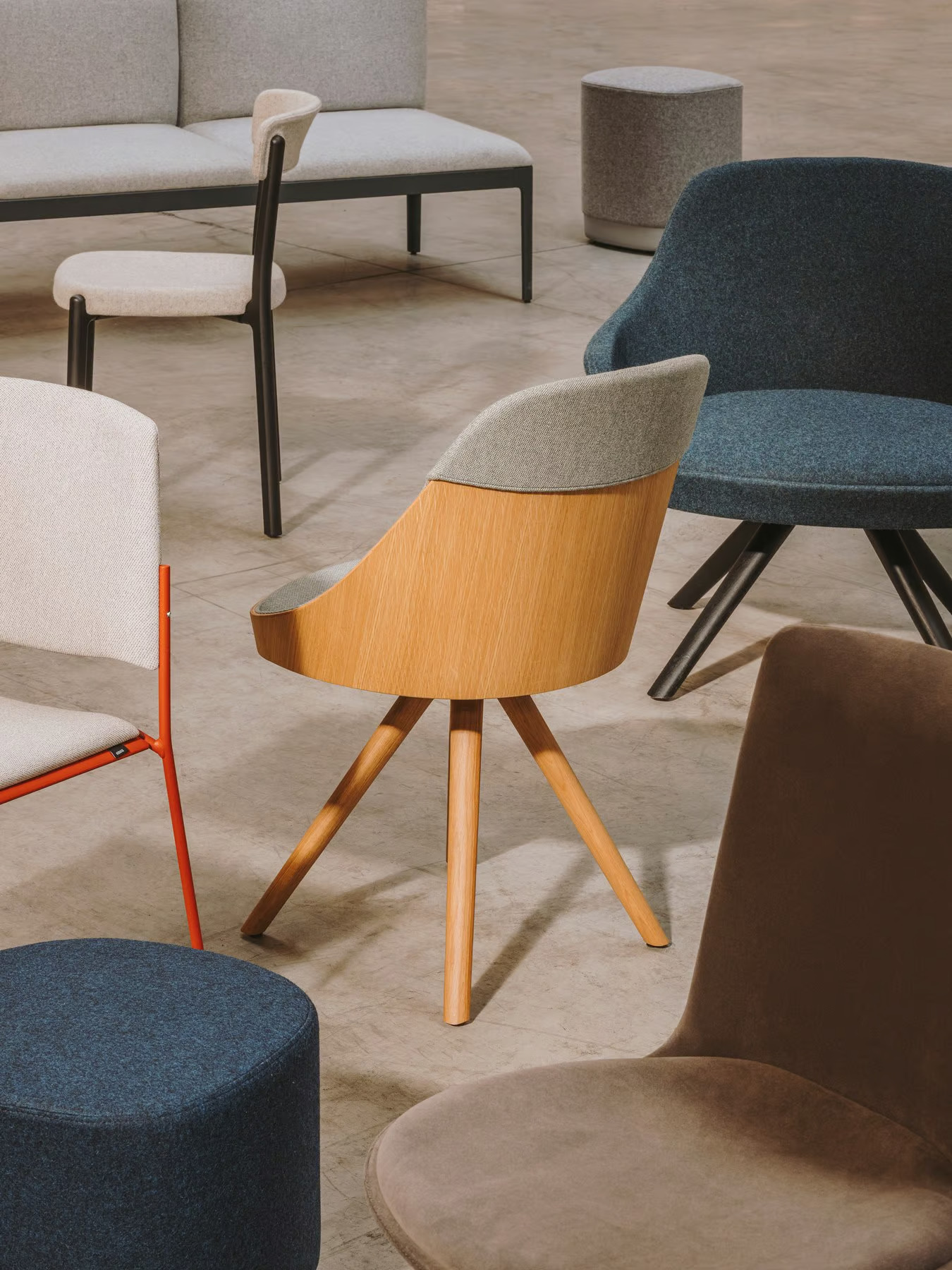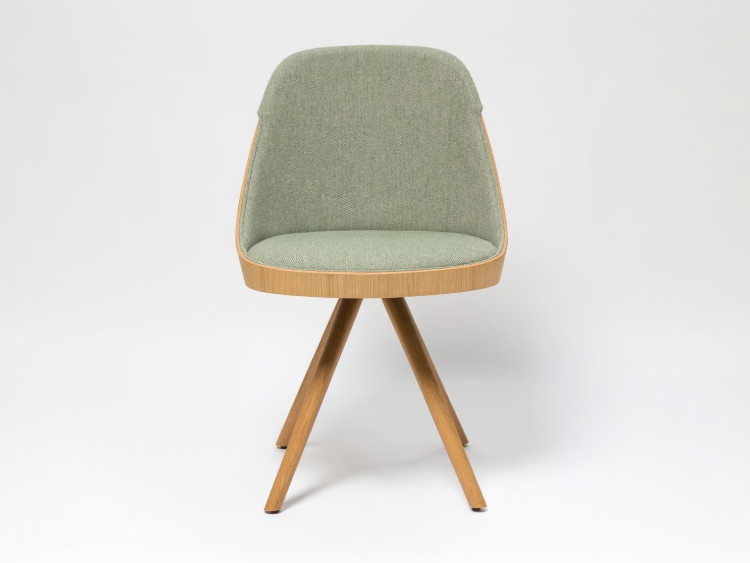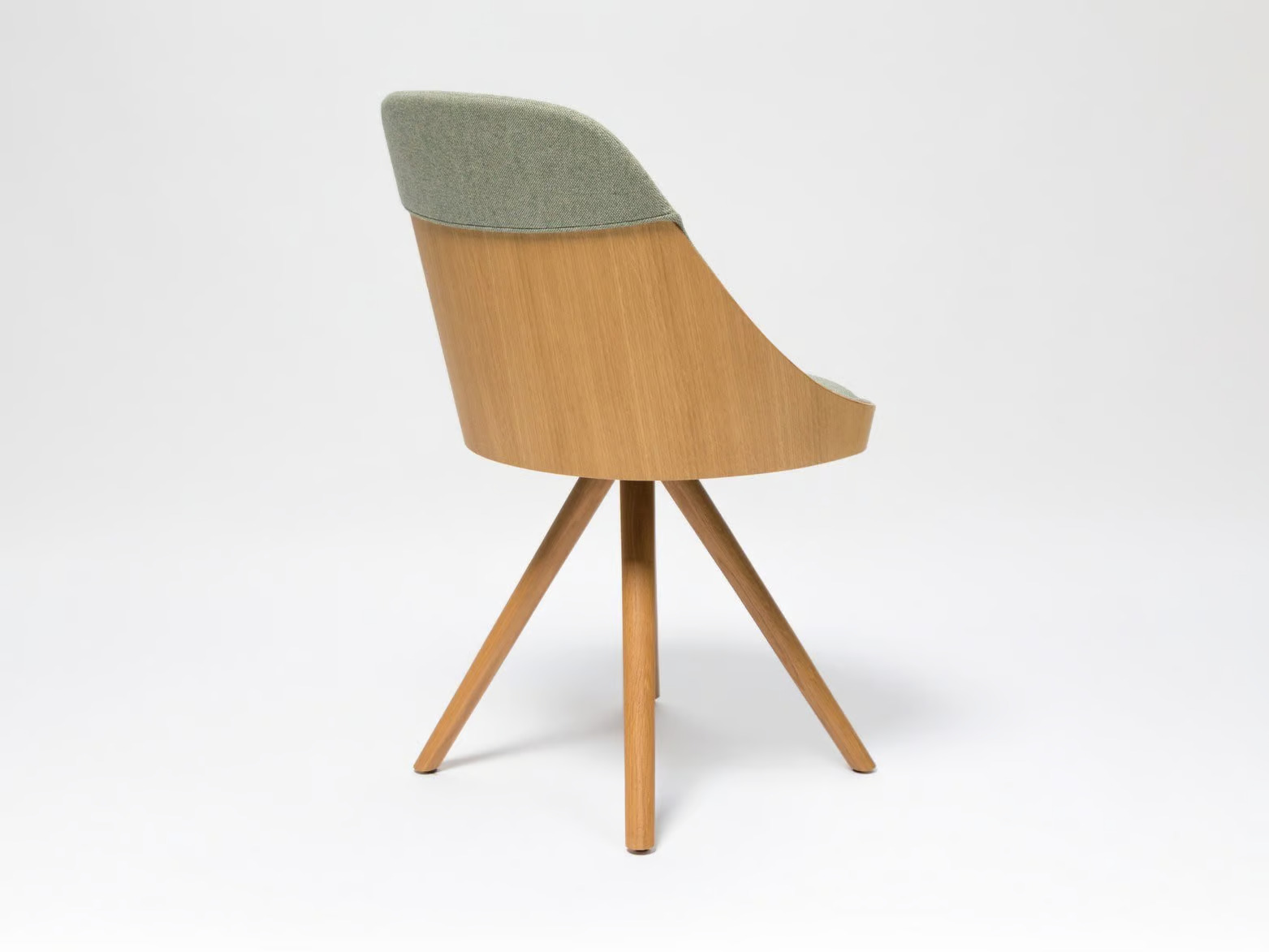 The KAIAK SPIN WOOD chair features a gracefully curved shell crafted from natural or stained oak, paired with sturdy wooden legs. It offers a variety of upholstery options, including fully upholstered, seat-only, three-quarters, and inside upholstery, making it adaptable for diverse environments. This model is designed to provide warmth and comfort, ideal for settings such as restaurants, conference rooms, coworking spaces, cafés, event venues, and educational institutions. The Kaiak collection seamlessly blends the elegance of oak wood with versatile upholstery, creating durable seating solutions that suit both public and professional spaces. Its modern design and ergonomic features make it a practical choice for dining tables, café chairs, and conference room furniture.