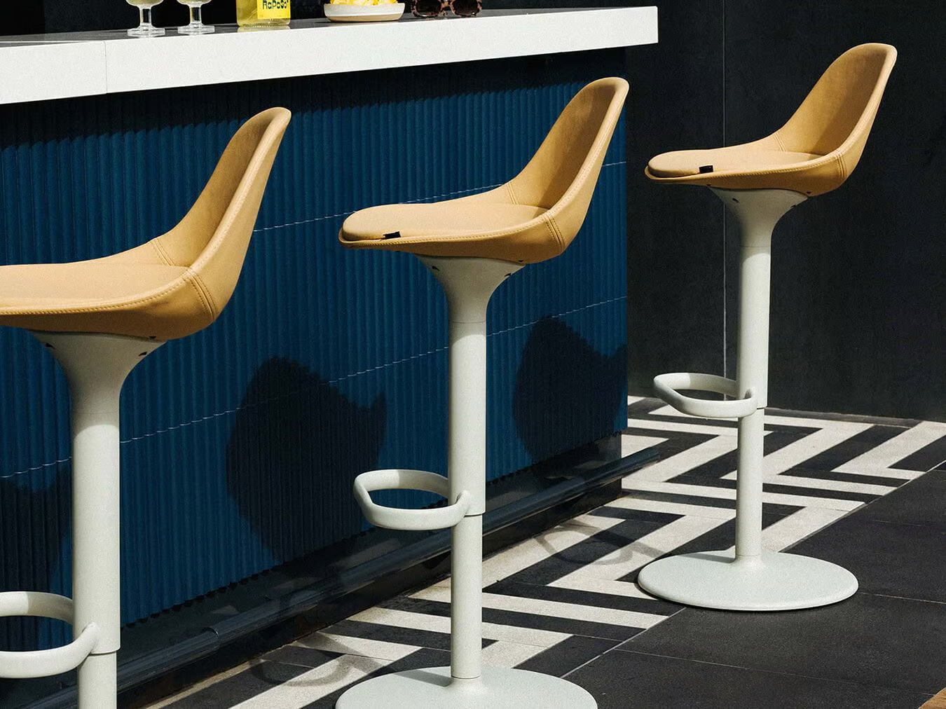 The MATE LIFT stool offers versatility with options for a low or high backrest. Its swivel frame, crafted from aluminum and steel, can be lacquered in a variety of enea colors. Customization extends to numerous finishes, including a polypropylene shell, with choices for a polypropylene or upholstered seat pad, and a fully upholstered version. Its adjustable design makes it suitable for diverse environments such as restaurants, conference rooms, coworking spaces, cafés, event venues, and educational institutions. The MATE collection embodies adaptability, allowing for multiple configurations to suit various settings. This durable seating solution complements modern design tables and café chairs, providing ergonomic and stackable options for conference room furniture.