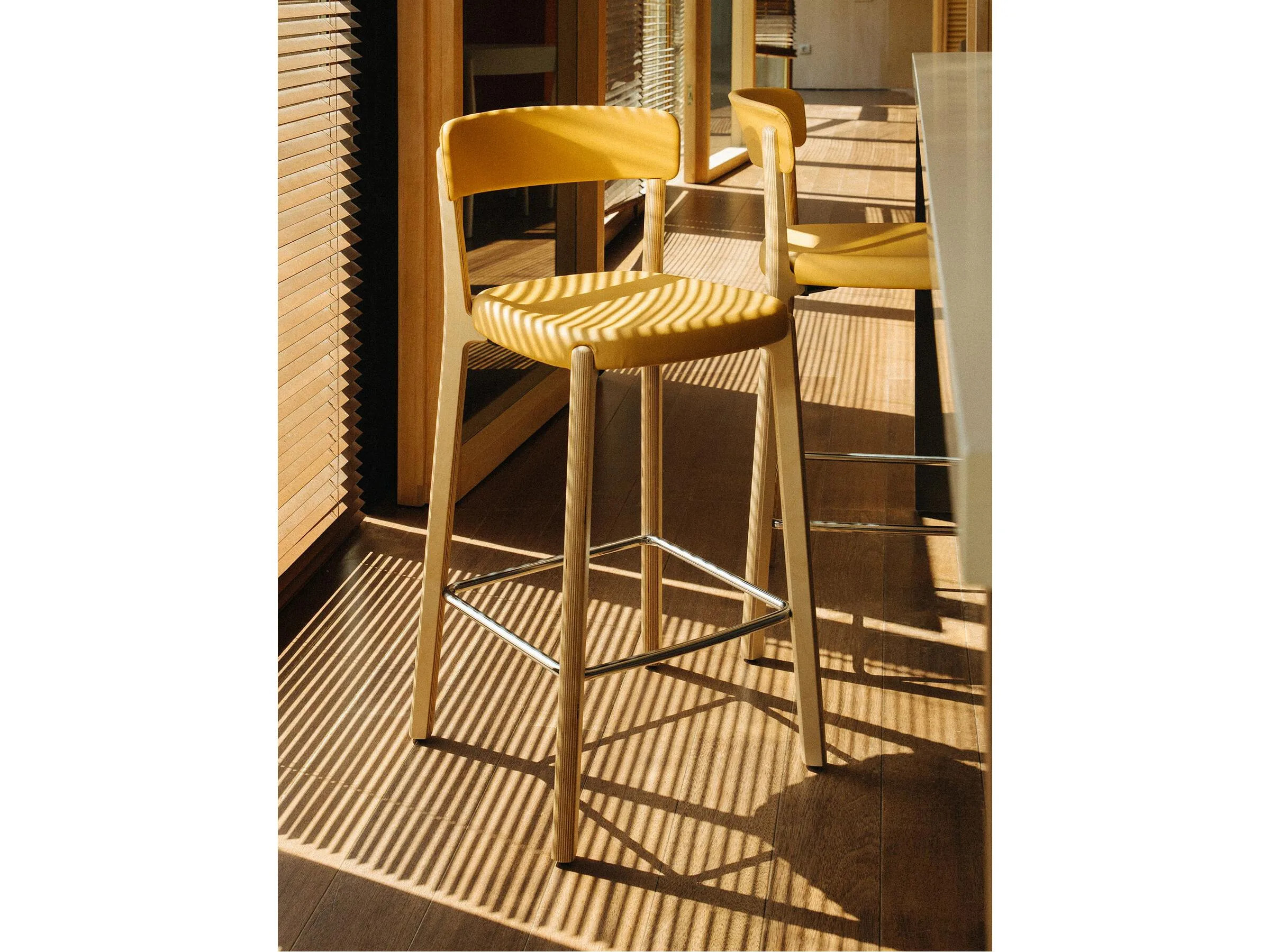 The NOA stool combines a laminated natural birch frame with polypropylene for enhanced flexibility. Its seat and backrest offer customization options, including single-color polypropylene, a polypropylene or upholstered seat pad, and full upholstery. Available in two heights, 65 and 75 centimeters, the NOA collection reimagines the classic Bistro chair with a contemporary twist. Crafted from lightweight yet durable materials, these stools are stackable and easy to handle, making them ideal for dining tables, café chairs, and conference room furniture. The modern design and inviting lines of the NOA stool make it a versatile choice for various settings, from restaurants and coworking spaces to educational institutions and event venues.