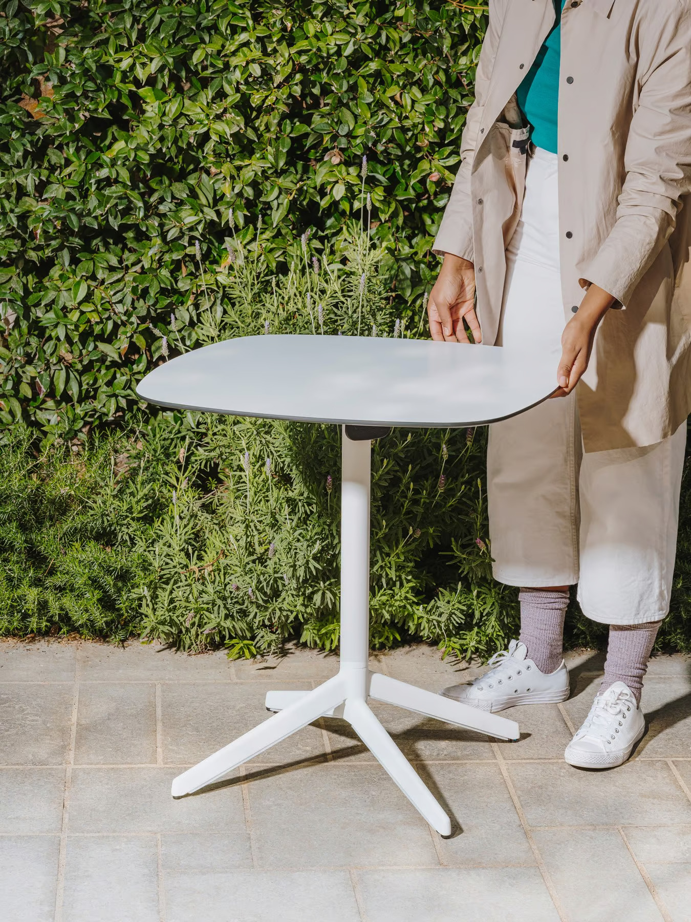 The PILE table features a square drop-leaf design with an aluminum base and a choice of HPL or FENIX NTM tops. Its innovative folding mechanism allows for intuitive folding and storage, making it ideal for dynamic environments. The 4-star aluminum structure, available in polished or lacquered finishes in various Enea Design colors, enhances its stackability. Suitable for both indoor and outdoor settings, PILE is available in two heights and offers circular, square, and rounded square tops with various finishes. This versatile piece is well-suited for restaurants, conference rooms, coworking spaces, cafés, event venues, banquet halls, and educational institutions, providing modern design tables and durable seating solutions.