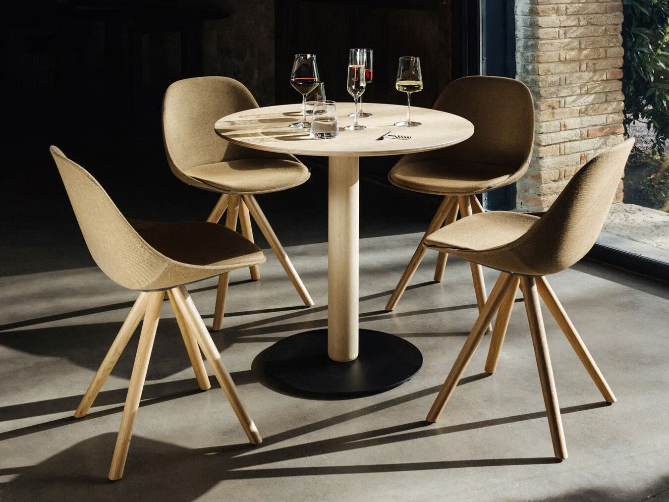 The TABER table combines a distinctive wooden structure with a steel base, available in a range of lacquered colors. Offered in multiple finishes and two height options, it caters to diverse settings such as restaurants, conference rooms, and educational institutions. The base and tabletop come in various shapes, enhancing its adaptability. This modern design table is suitable for dining areas, cafés, and coworking spaces, providing a stylish yet functional solution. Complementing the table, ergonomic and stackable café chairs offer durable seating, making it an ideal choice for event venues and banquet halls. The TABER collection seamlessly integrates into any environment, offering a blend of style and practicality for conference room furniture and beyond.