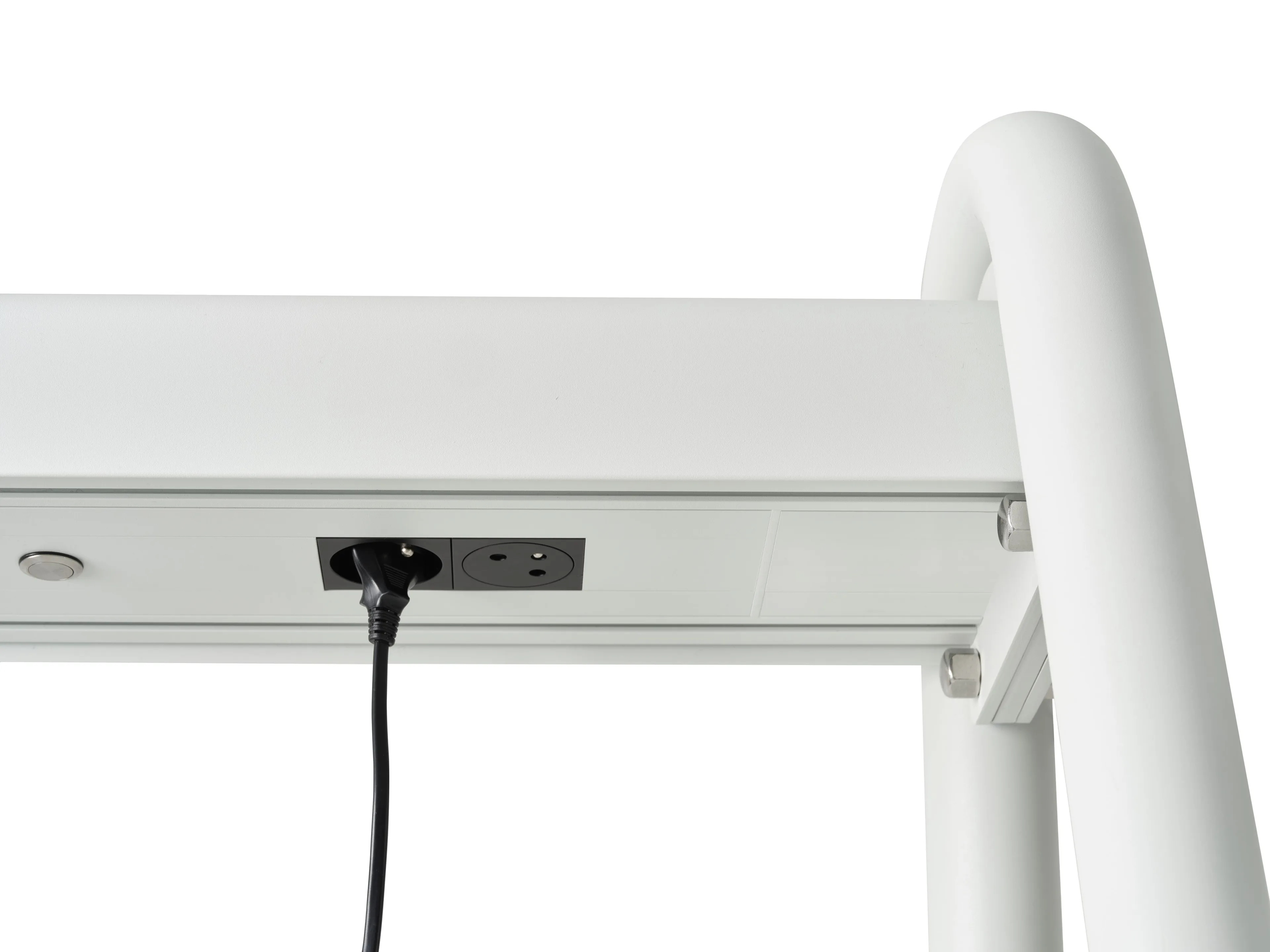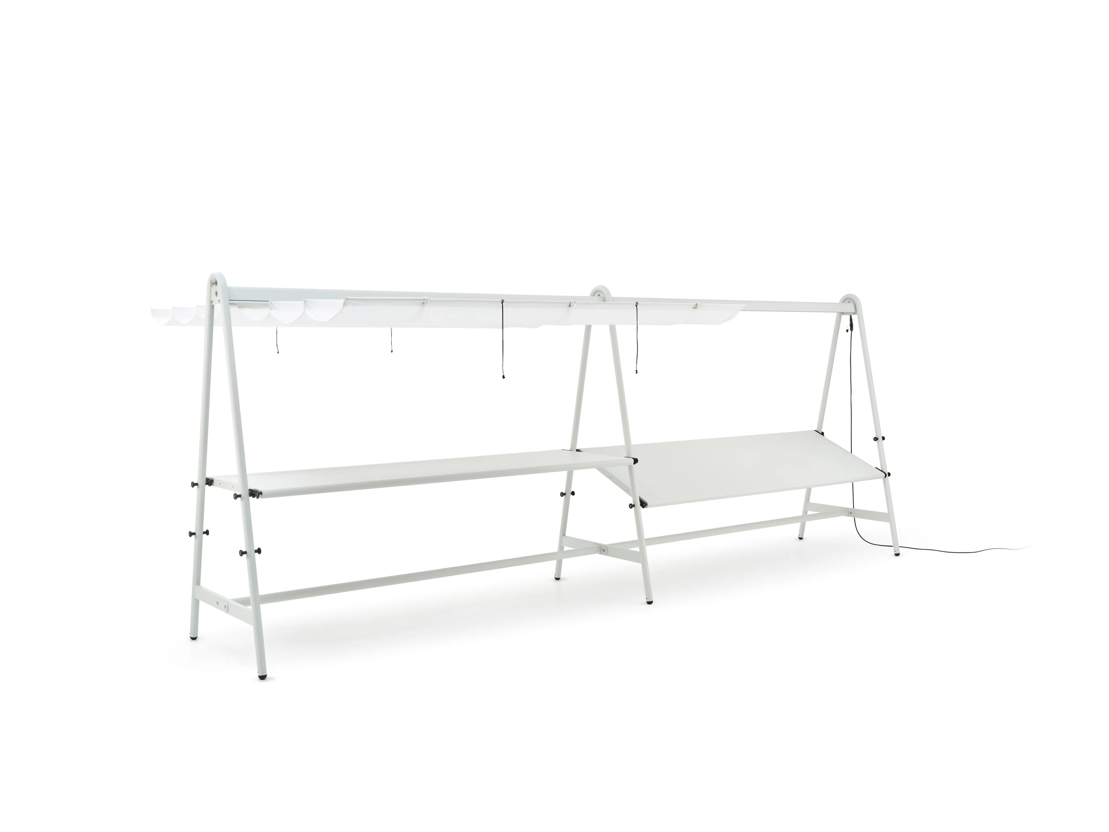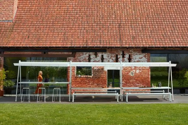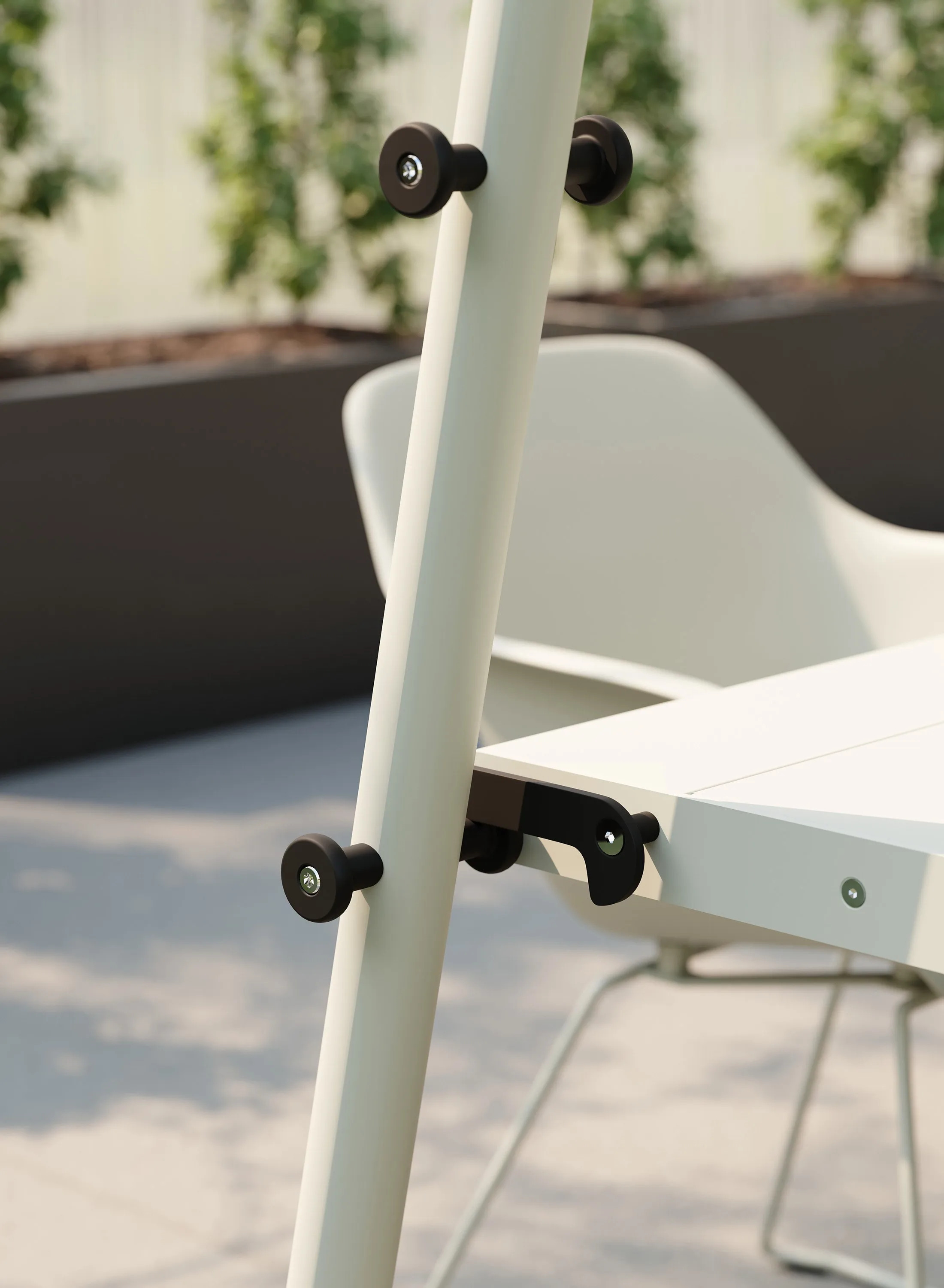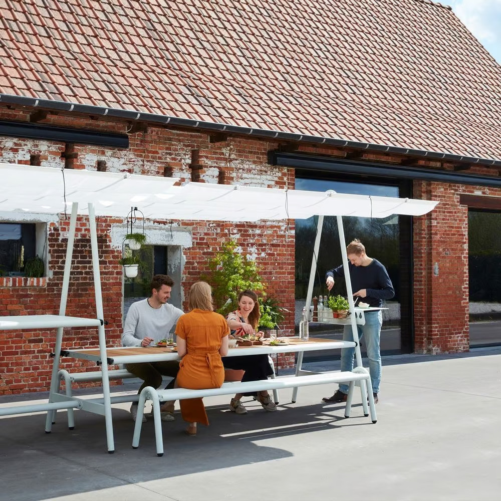 The AMAi table offers versatile functionality for restaurants, conference rooms, coworking spaces, cafés, event venues, and educational institutions. Its robust A-shaped side frames ensure a stable construction, allowing the tabletop to be adjusted between standard and high positions with ease. This modern design table accommodates both dining and standing arrangements, making it suitable for various settings. The table can be customized with different finishes and accessories, including optional LED lights and power outlets for enhanced connectivity. For outdoor use, an optional shade provides protection from the elements. Each AMAi unit comfortably seats eight, with the potential to expand by adding more A-frames, making it ideal for larger gatherings. This durable seating solution combines ergonomic and stackable café chairs, offering a seamless blend of style and practicality. The AMAi table's unique, patented design embodies flexibility and innovation, catering to diverse communal experiences.