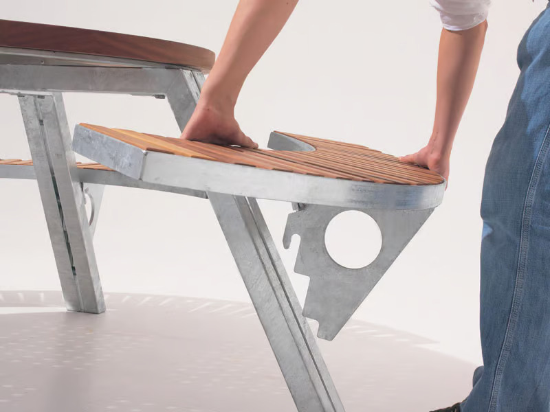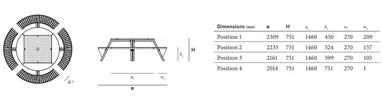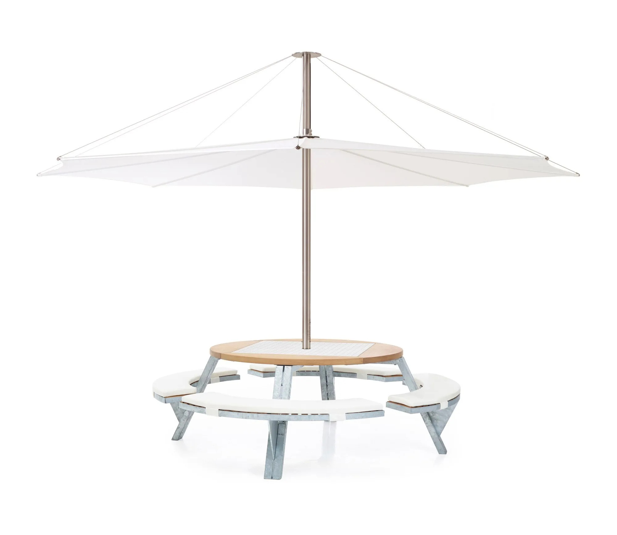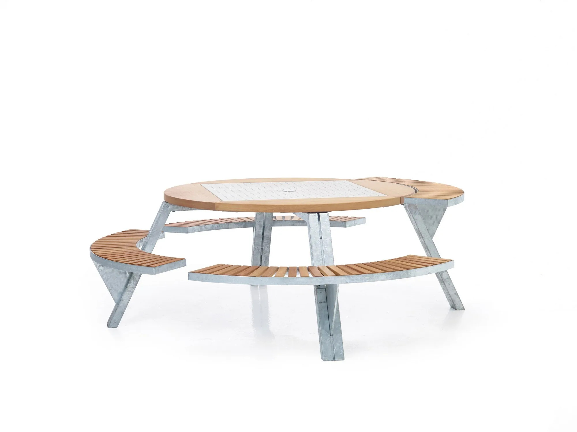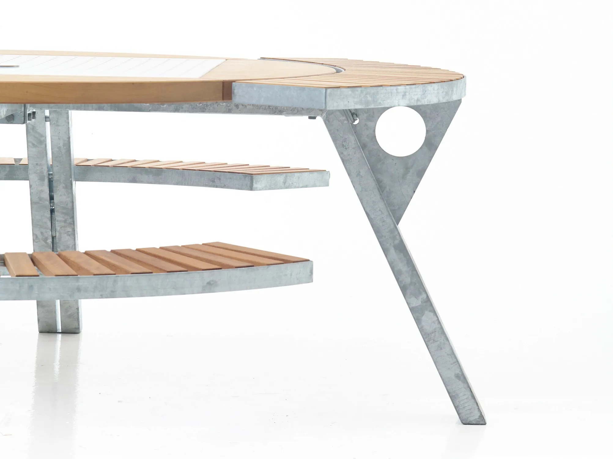 Designed by Dirk Wynants in 1994, the Gargantua table remains a hallmark of innovation and durability. Its robust construction is ideal for restaurants, conference rooms, coworking spaces, cafés, event venues, and educational institutions. With a seating capacity of eight to twelve, it is crafted to withstand extreme temperatures ranging from -50°C to +70°C. The table features FSC-labeled Iroko hardwood for areas in contact with users, ensuring comfort without cold surfaces. The center of the tabletop is made from punched stainless steel, facilitating easy cleaning as rainwater washes away dirt. Galvanized steel legs and frame provide additional strength. Optional backrests, cushions, and a ground anchor kit enhance its versatility. Gargantua pairs seamlessly with the Inumbra parasol, making it a practical choice for both indoor and outdoor settings.