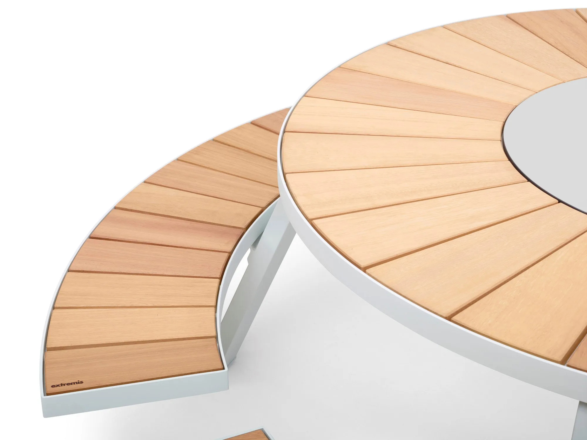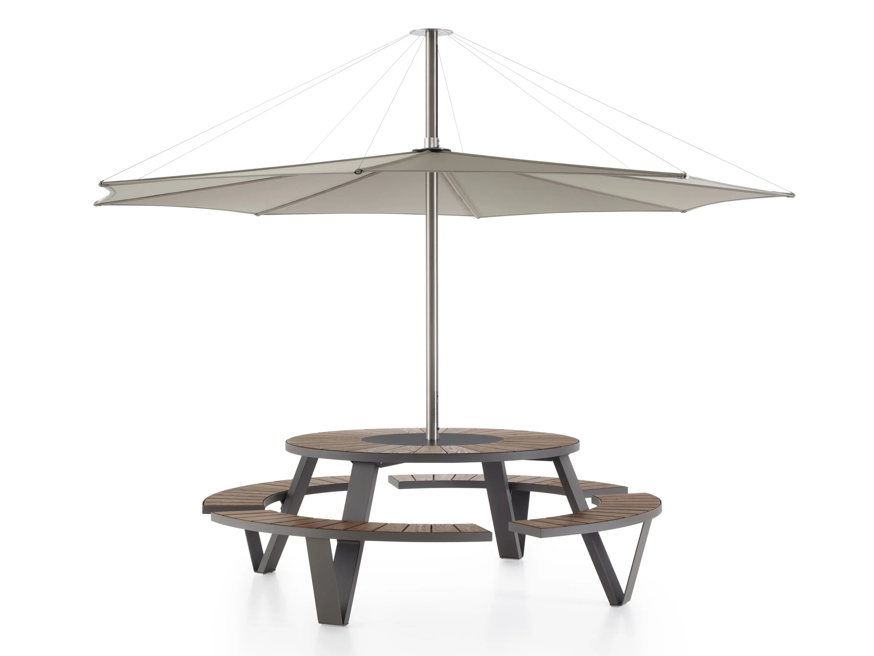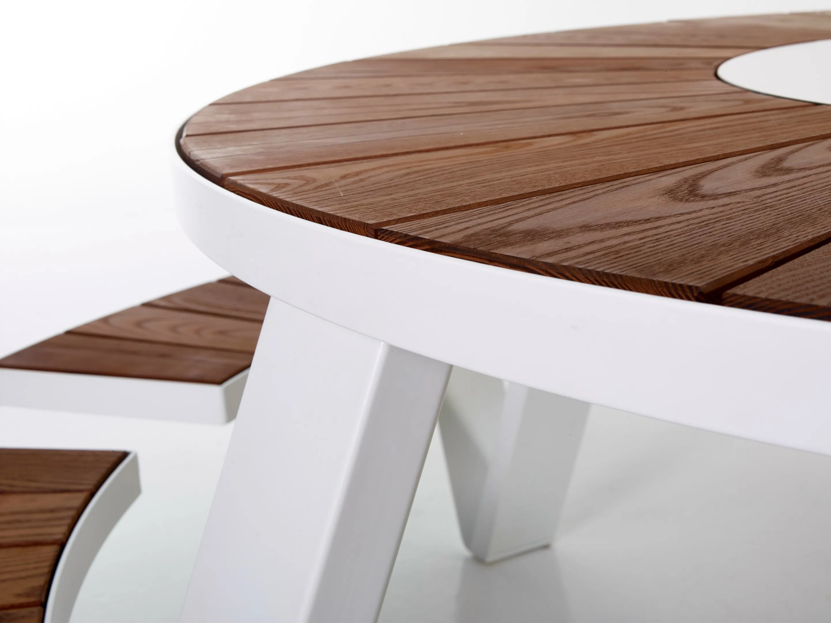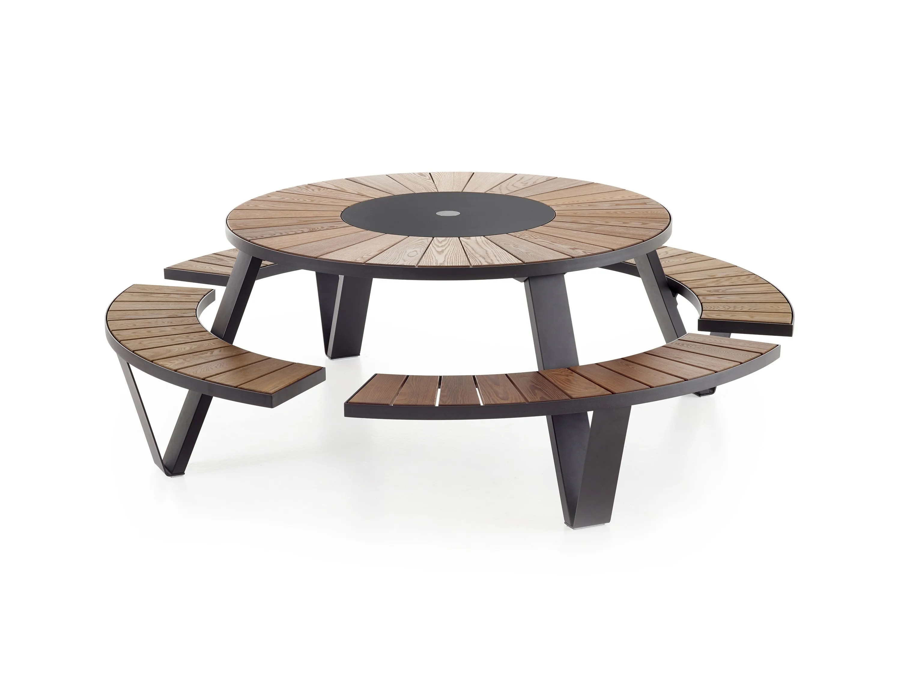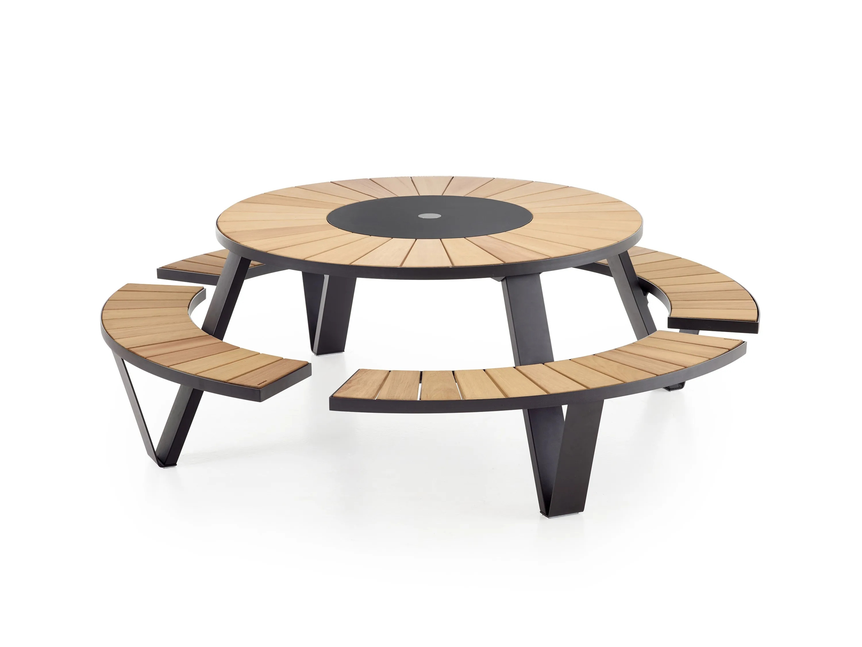 The Pantagruel Picnic table, inspired by Rabelais' literary character, offers a modern twist on traditional dining tables. Its round tabletop features a central Lazy Susan, enhancing functionality in conference rooms, cafés, and event spaces. The table's frame is available in either a powder-coated or galvanized finish, providing durability and a sleek appearance. Unlike its predecessor, the Gargantua, the Pantagruel's seats are fixed, offering a more refined aesthetic while maintaining robust construction. Ideal for restaurants and educational institutions, this table pairs seamlessly with ergonomic, stackable café chairs, ensuring versatile and durable seating solutions. The Pantagruel's design accommodates various materials for the benches and tabletop, making it a versatile choice for diverse settings.