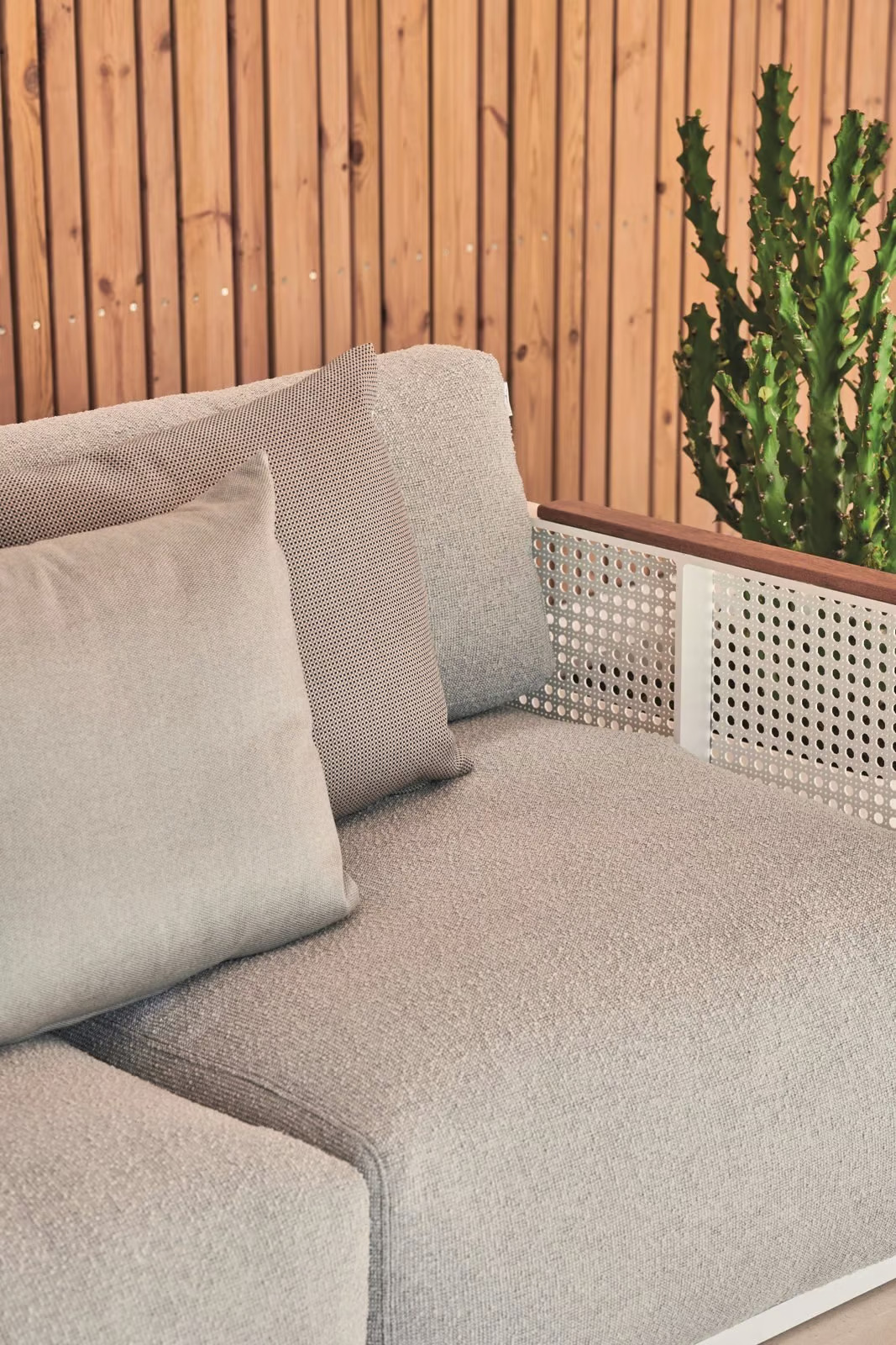 The BOSC 2-seater garden sofa embodies the essence of Mediterranean tradition with a modern twist. Crafted from durable, all-weather materials, this piece is designed for resorts, cafés, restaurants, outdoor event planners, and beachside hotels seeking reliable outdoor furniture. The sofa features a thermo-lacquered aluminum frame, subtly echoing traditional weaving techniques, and is complemented by iroko wood armrests. Available in a variety of colors, including white, agate grey, and bottle green, it seamlessly integrates into any garden furniture set. This modular outdoor seating option offers both style and comfort, making it ideal for use as comfortable poolside loungers or durable patio chairs. Its robust construction ensures longevity, even in challenging weather conditions, making it a prime choice for those in need of all-weather outdoor furniture.