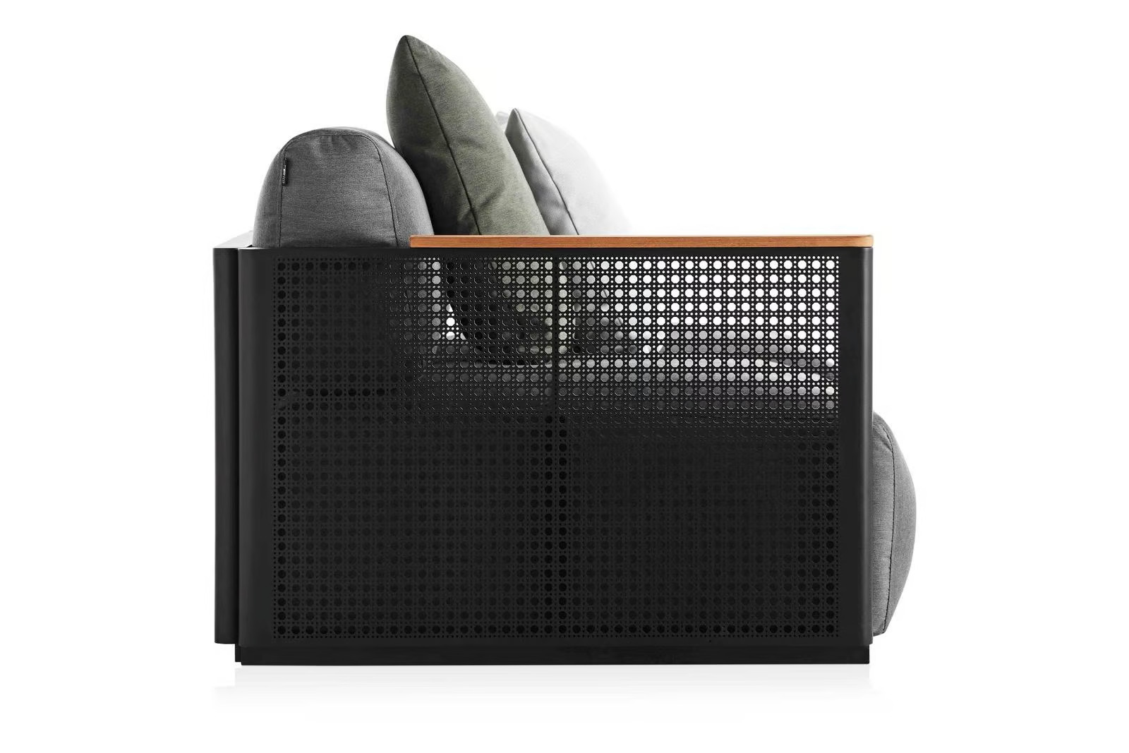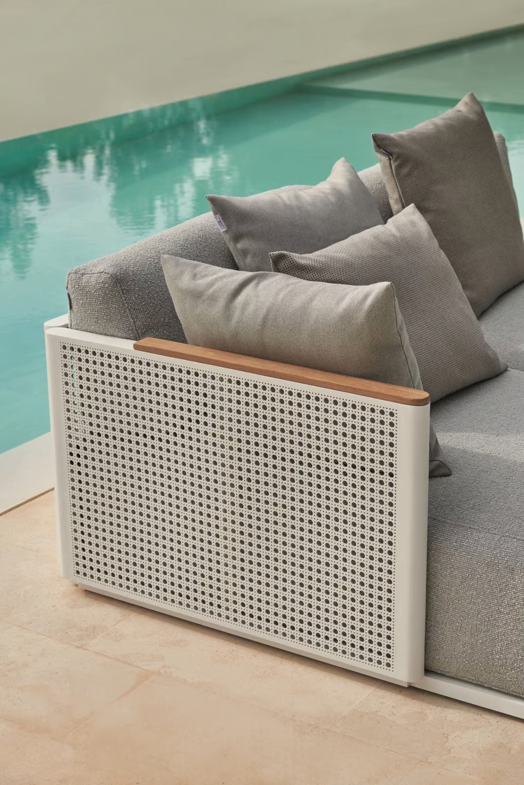 The BOSC 3-seater garden sofa embodies the essence of Mediterranean tradition with a modern twist. Crafted from durable, all-weather materials, this piece is ideal for resorts, cafés, restaurants, outdoor event planners, and beachside hotels. The sofa features a robust thermo-lacquered aluminum frame, complemented by iroko wood armrests, ensuring longevity and style. Its design pays homage to traditional weaving techniques, reimagined in a contemporary form. Available in a variety of colors, including white, agate grey, and bottle green, it seamlessly integrates into any outdoor setting. This modular outdoor seating option is perfect for creating comfortable poolside loungers or as part of a larger garden furniture set, offering both durability and elegance in any environment.