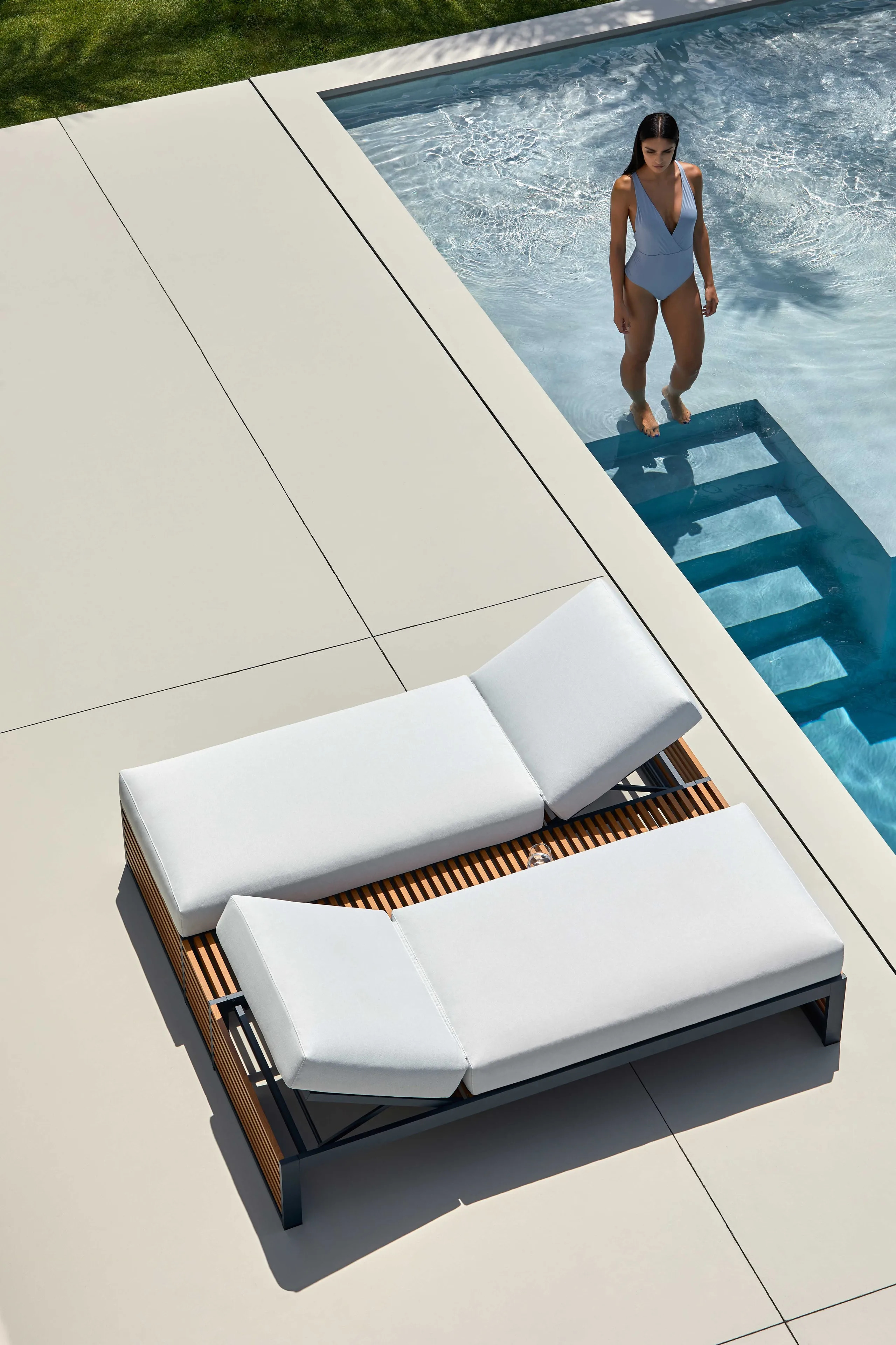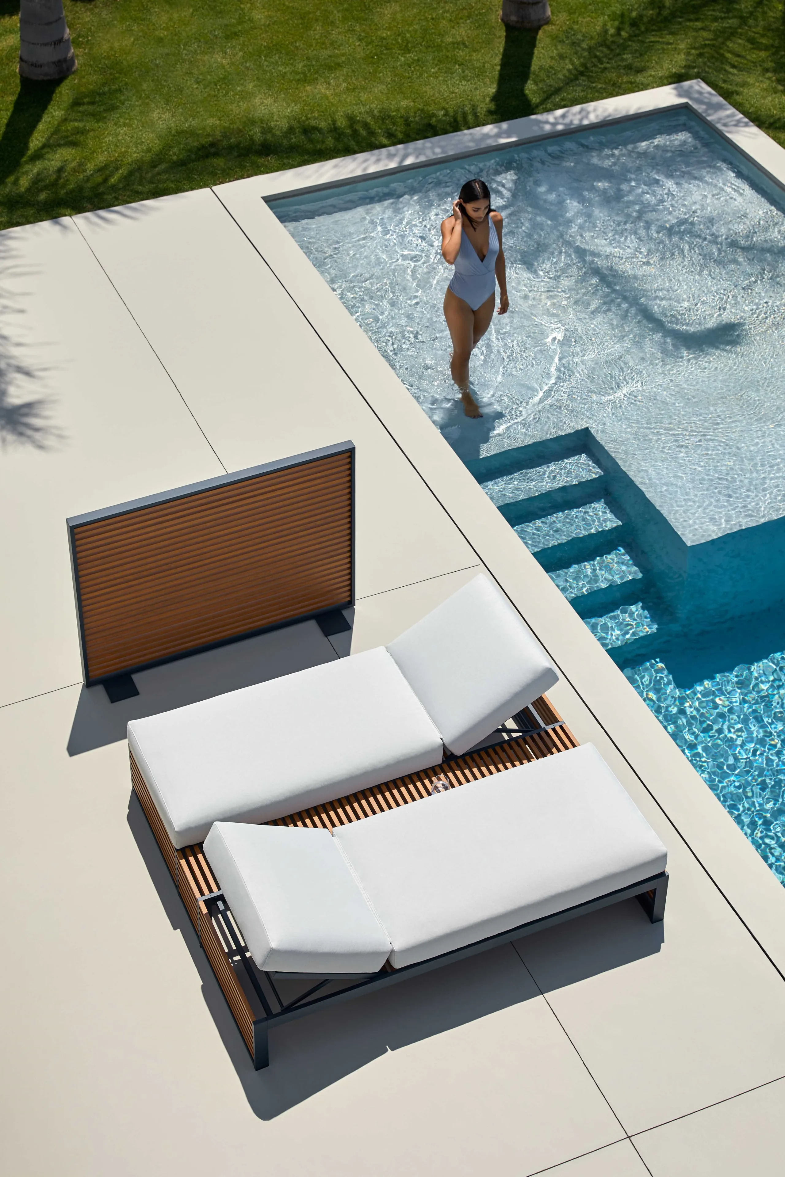 The DNA collection offers a sophisticated blend of design influences, drawing inspiration from the interplay of light and shadow seen in Mediterranean shutters and the minimalist elegance of Japanese architecture. This range of durable outdoor furniture is crafted from anodized or thermo-lacquered aluminum profiles, ensuring longevity and resilience in various weather conditions. The modular outdoor seating and comfortable poolside loungers feature polyurethane foam rubber, enveloped in water-repellent fabric with removable covers for easy maintenance. Available in a diverse palette, including anodized, white, agate grey, and more, these all-weather chairs and garden furniture sets are ideal for resorts, cafés, restaurants, and beachside hotels seeking stylish and functional all-weather outdoor furniture.