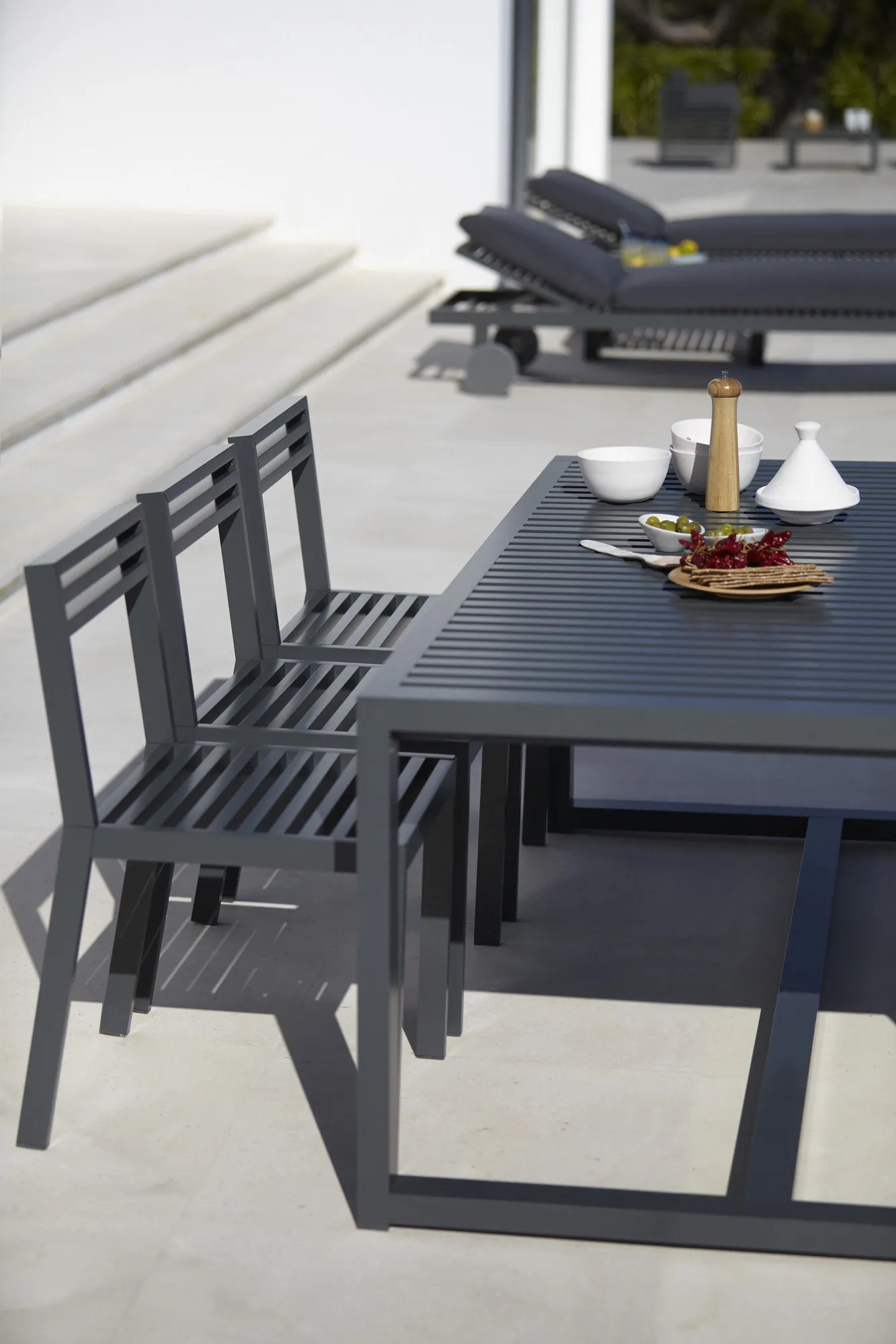 The DNA collection offers a sophisticated blend of modern design tables and ergonomic chairs, ideal for restaurants, conference rooms, coworking spaces, cafés, event venues, and educational institutions. Inspired by the interplay of light and shadow seen in Mediterranean shutters and Japanese architecture, this furniture line emphasizes simplicity and elegance. Constructed from anodized or thermo-lacquered aluminum profiles, the pieces are designed for durability and style. The seating features polyurethane foam rubber, covered with water-repellent fabric, ensuring comfort and resilience. The removable fabric covers are available in a range of colors, including anodized, white, agate grey, and more. The stackable chairs provide practical, durable seating solutions, making them perfect for dynamic environments.
