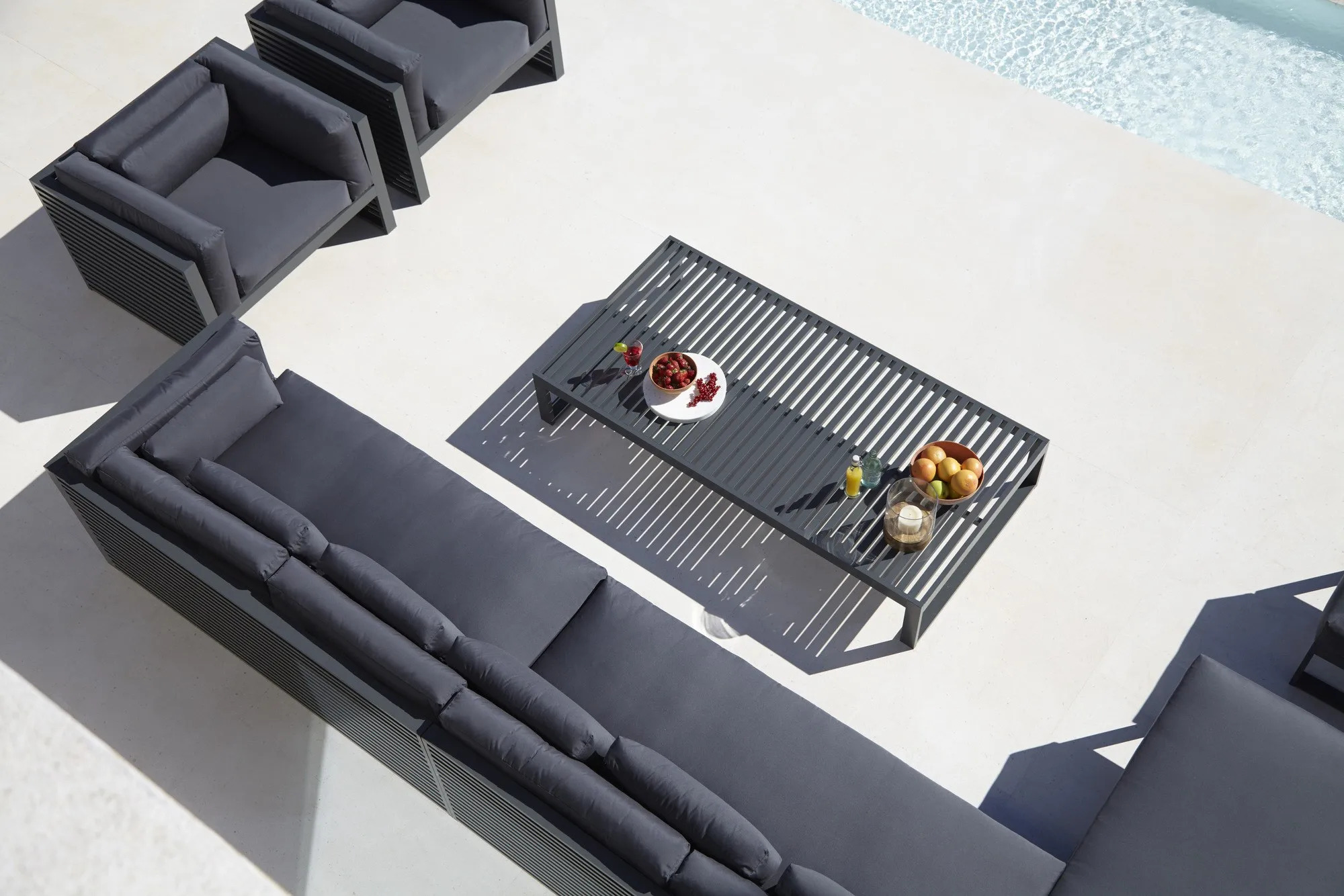 The DNA 6 collection offers a sophisticated blend of design and functionality, ideal for resorts, cafés, restaurants, outdoor event planners, and beachside hotels. This durable outdoor furniture line draws inspiration from the interplay of light and shadow seen in Mediterranean shutters and Japanese architectural aesthetics. Crafted from anodized or thermo-lacquered aluminum profiles, these all-weather chairs and modular outdoor seating options are designed to withstand the elements. The polyurethane foam rubber cushions are covered with water-repellent fabric, ensuring comfort and longevity. The removable fabric covers are available in a range of colors, including anodized, white, agate grey, cement grey, sand, bronze, wine red, blue grey, grey blue, signal grey, anthracite, and black. DNA 6 seamlessly integrates into any setting, offering versatile and comfortable poolside loungers and garden furniture sets.