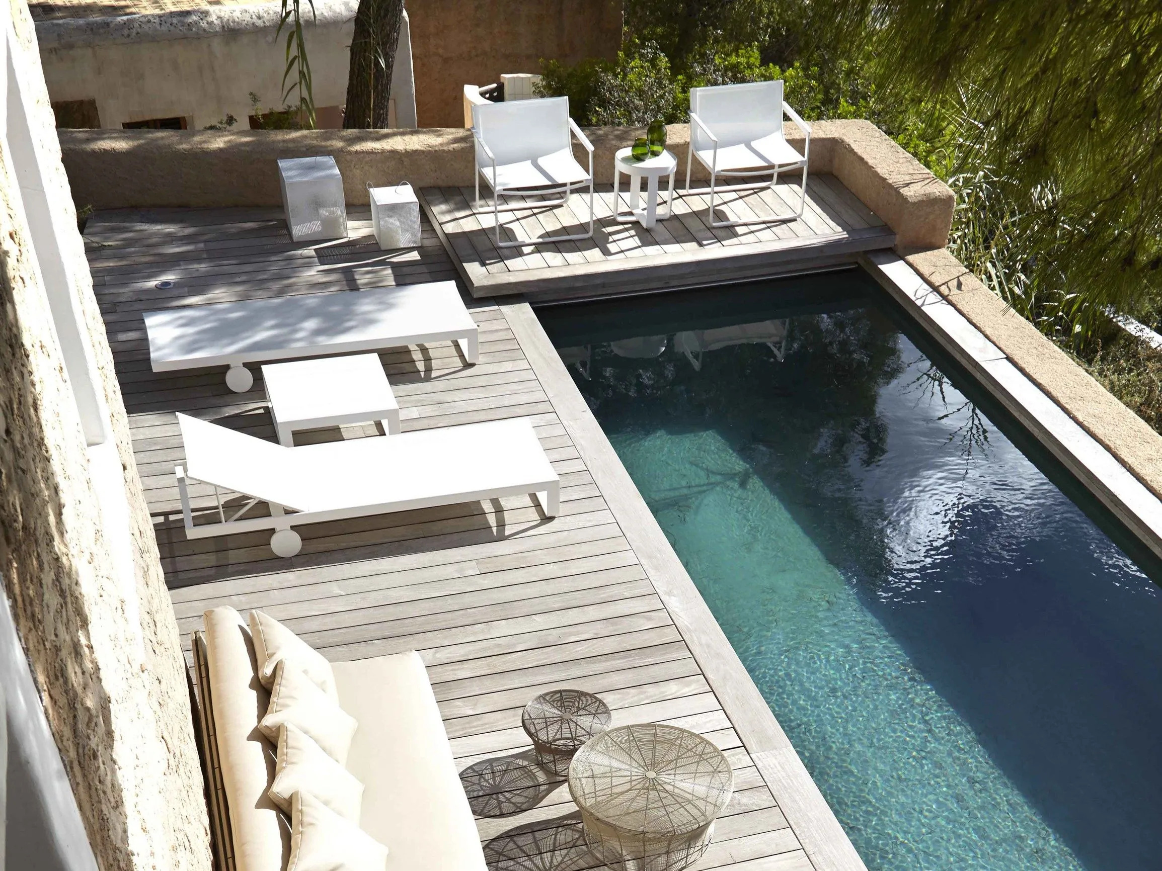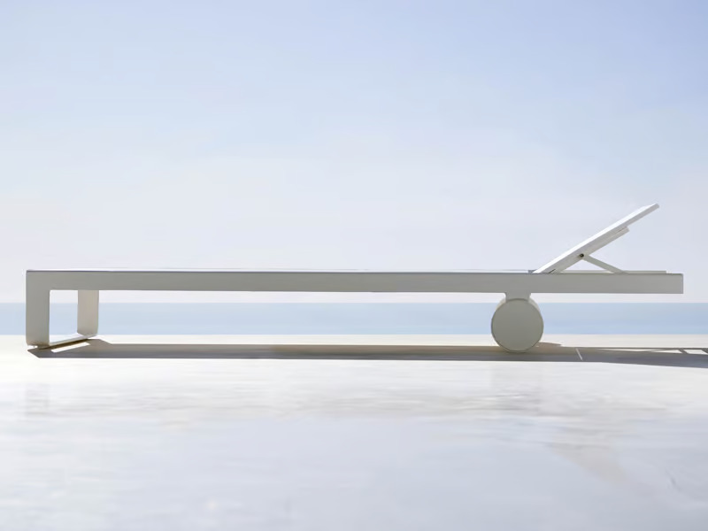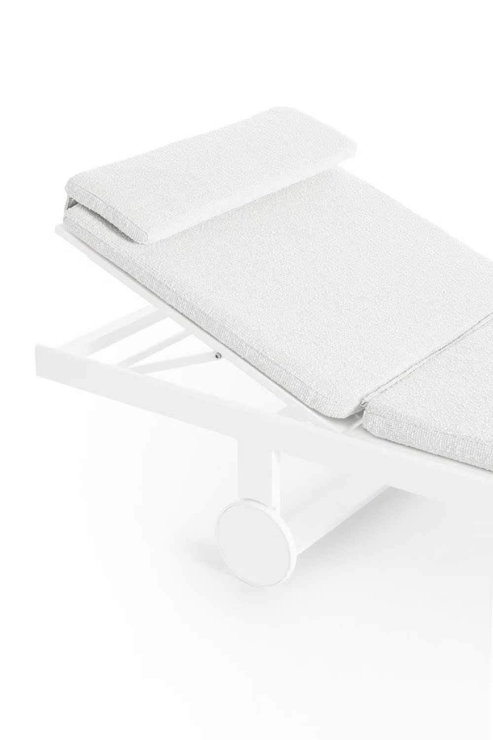 The FLAT Sun Lounger with castors is part of a versatile and enduring collection of durable outdoor furniture, crafted for environments like resorts, cafés, and beachside hotels. Designed with a focus on balance and flexibility, this modular outdoor seating option features a sleek, airy structure. Constructed from thermo-lacquered aluminum profiles and 100% recyclable polyethylene, it ensures longevity and sustainability. The lounger is equipped with polyurethane foam rubber, enveloped in a water-repellent fabric, offering comfort and resilience in all weather conditions. The removable fabric cover allows for easy maintenance. Available in a range of colors including white, agate grey, cement grey, sand, bronze, blue grey, and anthracite, this piece seamlessly integrates into various garden furniture sets, providing comfortable poolside lounging and enhancing any outdoor setting.