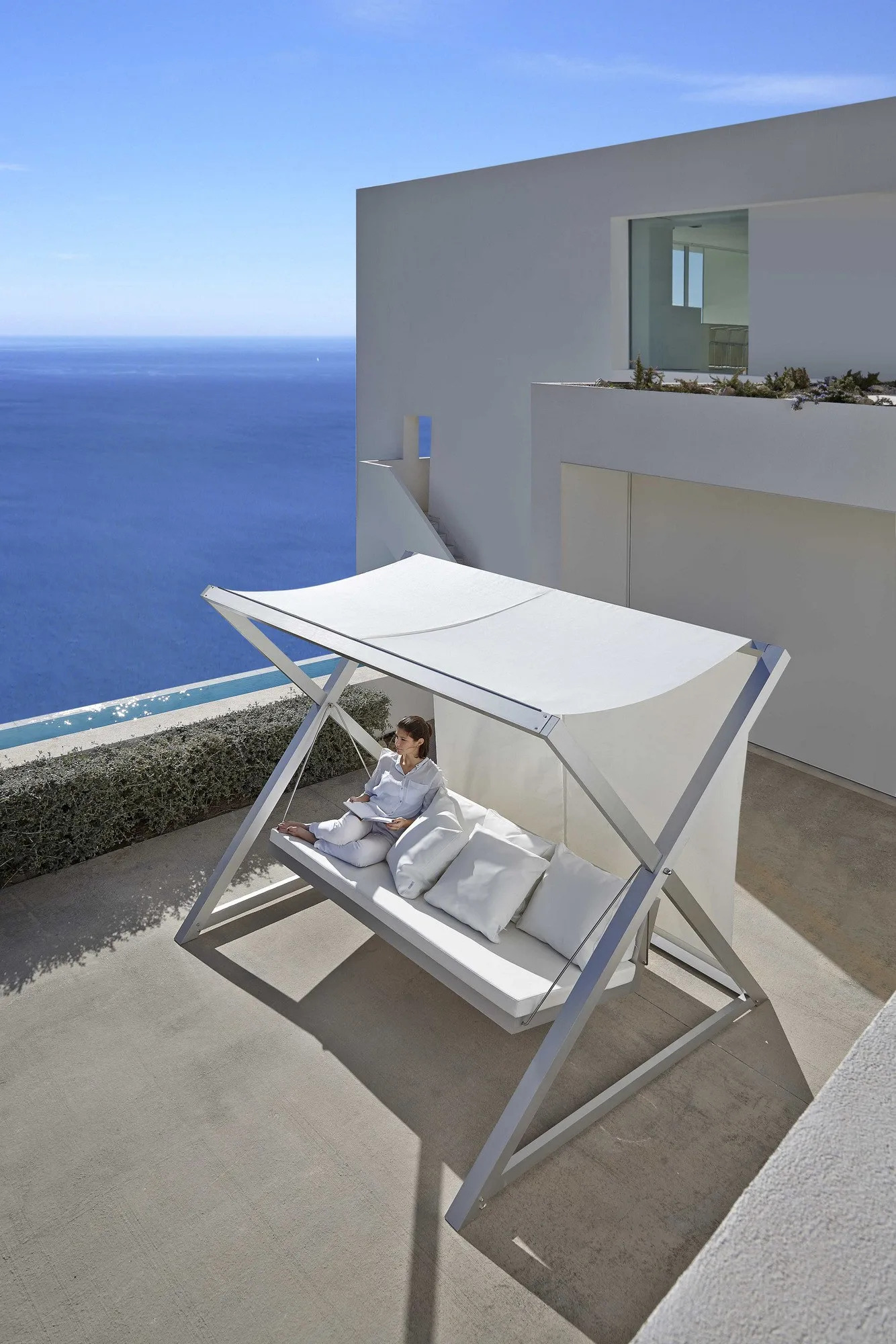 The NAO - NAO offers a fresh take on traditional seating with its innovative design and focus on form. Crafted from anodized or thermo-lacquered aluminum profiles, this piece is built to withstand the elements, making it an ideal choice for durable outdoor furniture. The canopy is made from resilient plastic fabric, while the seating area features polyurethane foam rubber covered with water-repellent fabric, ensuring comfort and longevity. The removable fabric cover adds convenience for maintenance. Designed to accommodate up to three people with a maximum load of 300 kg, this modular outdoor seating option is perfect for resorts, cafés, and beachside hotels. Available in a variety of colors, including anodized, white, agate grey, and more, it seamlessly integrates into any outdoor setting.
