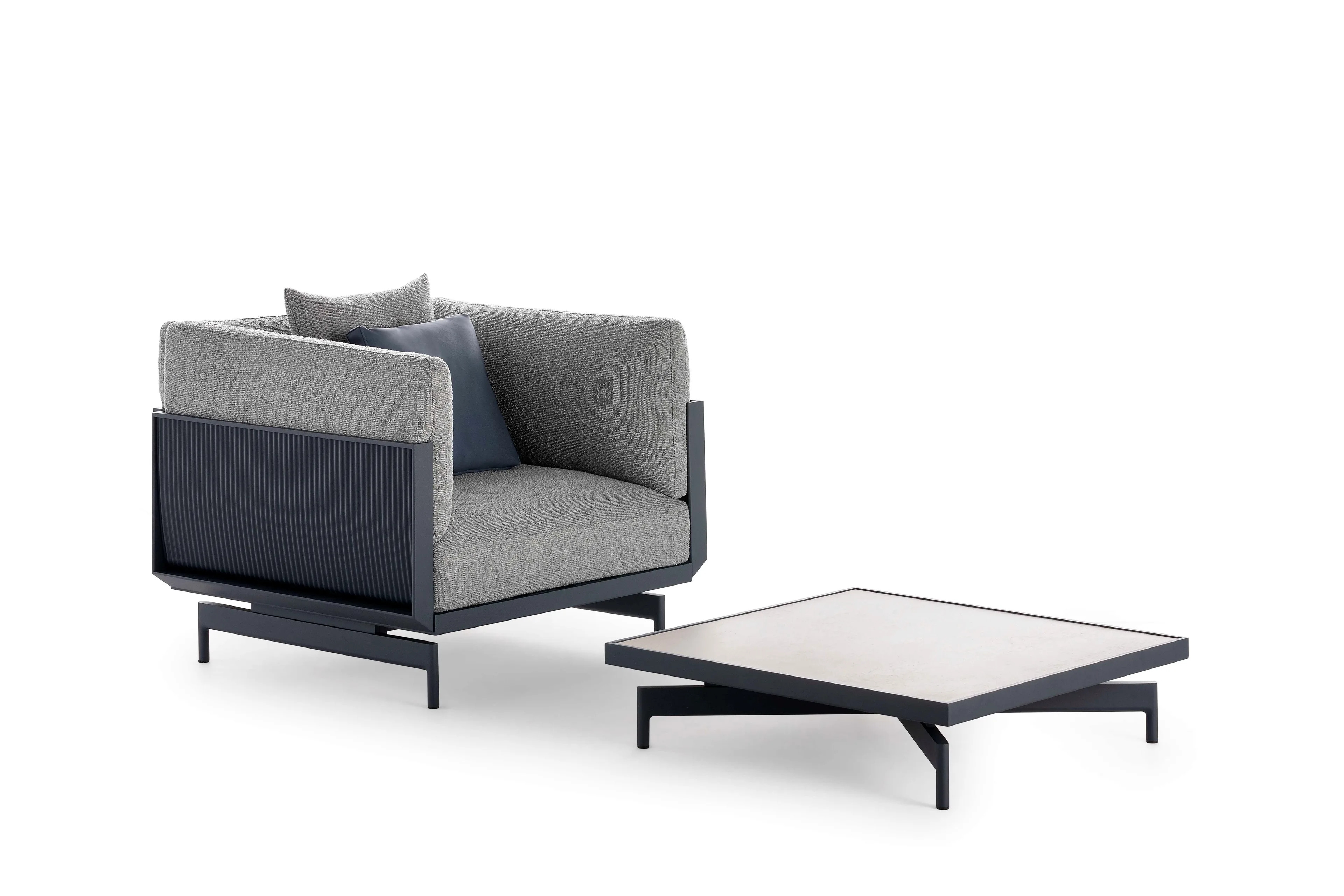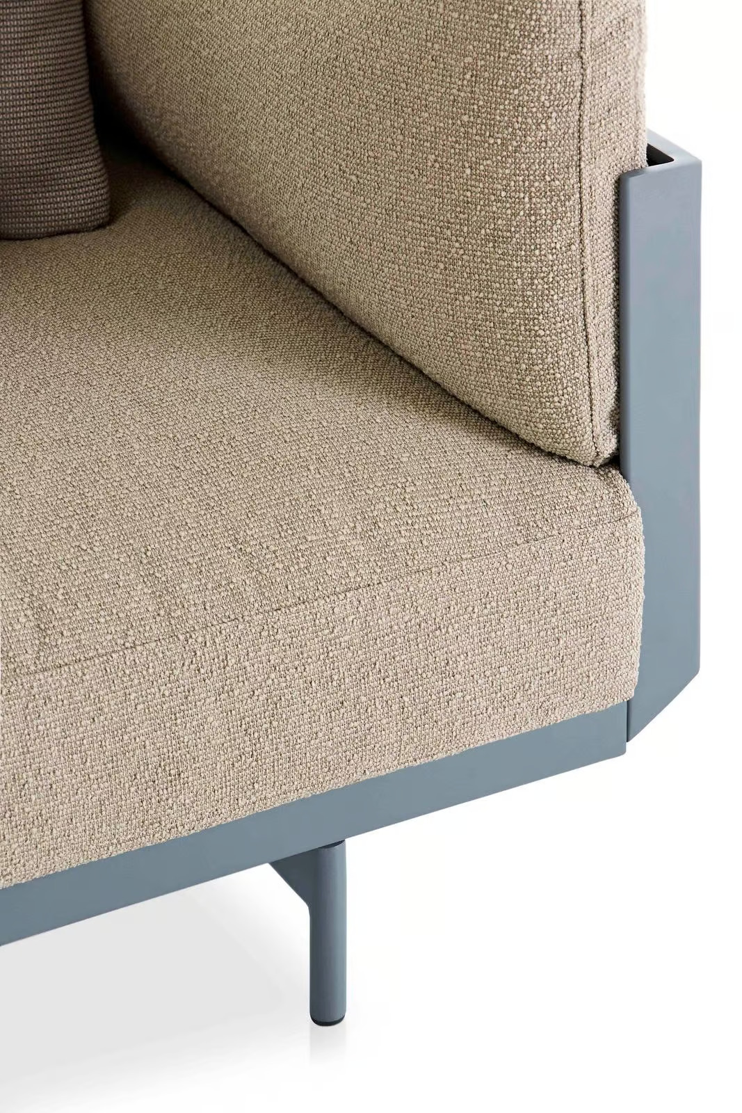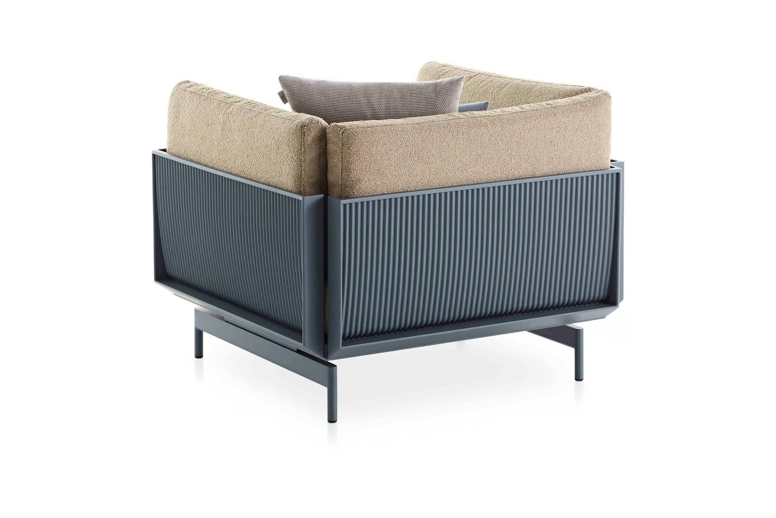The ONDE Garden Armchair combines fabric and thermo-lacquered aluminum to create a versatile seating solution. Designed with the evolving outdoor furniture market in mind, this piece offers flexibility and adaptability, making it ideal for resorts, cafés, restaurants, and beachside hotels. Its modular design allows for seamless integration into various garden furniture sets, providing durable outdoor furniture options that withstand all weather conditions. The armchair's construction ensures it functions as both a comfortable poolside lounger and a durable patio chair. Its aesthetic complements both outdoor and interior spaces, offering a cohesive look for any setting. This all-weather outdoor furniture piece is crafted to meet the demands of high-traffic environments, ensuring longevity and style.