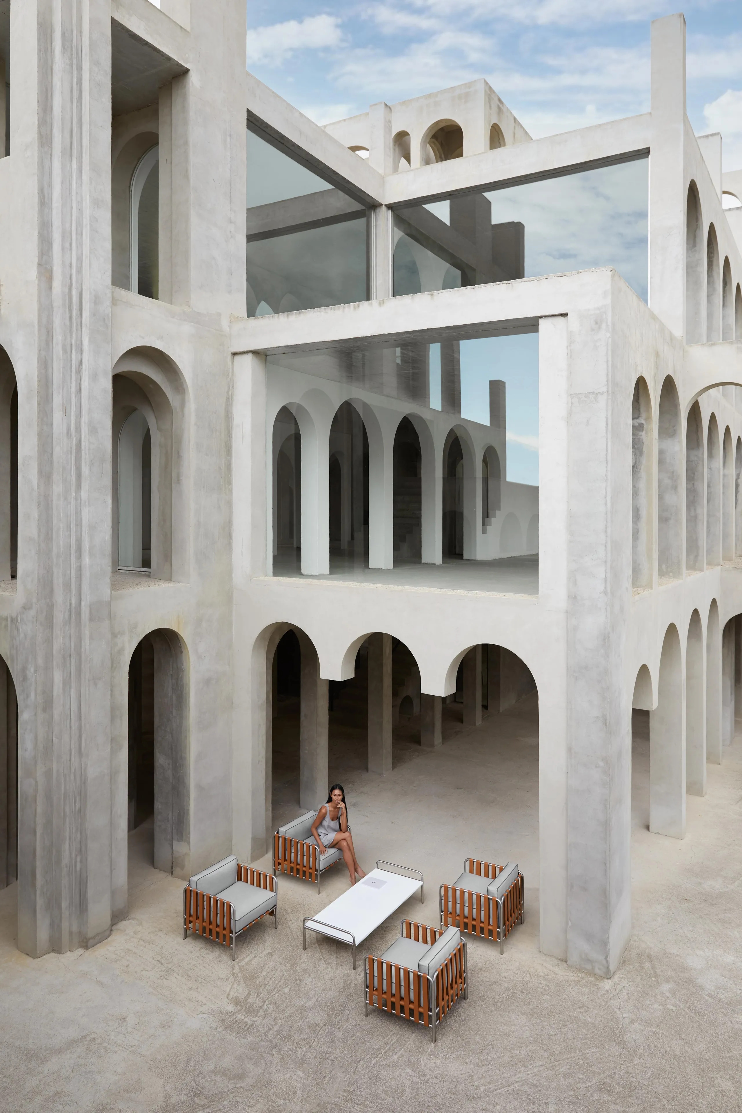 The ONSEN CLUB collection, crafted by Francesco Meda and David Quincoces in collaboration with GANDIABLASCO, offers a blend of timeless design and modern innovation. This range of durable outdoor furniture includes dining armchairs, sofas, lounge chairs, modular seating, and low tables, all designed to withstand various weather conditions. The collection features a harmonious mix of materials such as stainless steel, elastic straps, aluminum, and teak, ensuring both functionality and aesthetic appeal. The geometric and generous lines of the pieces provide versatility, making them suitable for both relaxed and formal settings. A unique aspect of the collection is the use of interlaced leather straps on a stainless steel frame, creating a striking contrast with the metal structure. This combination of lightness and warmth defines the identity of ONSEN, making it an ideal choice for resorts, cafés, restaurants, outdoor event planners, and beachside hotels seeking all-weather outdoor furniture.