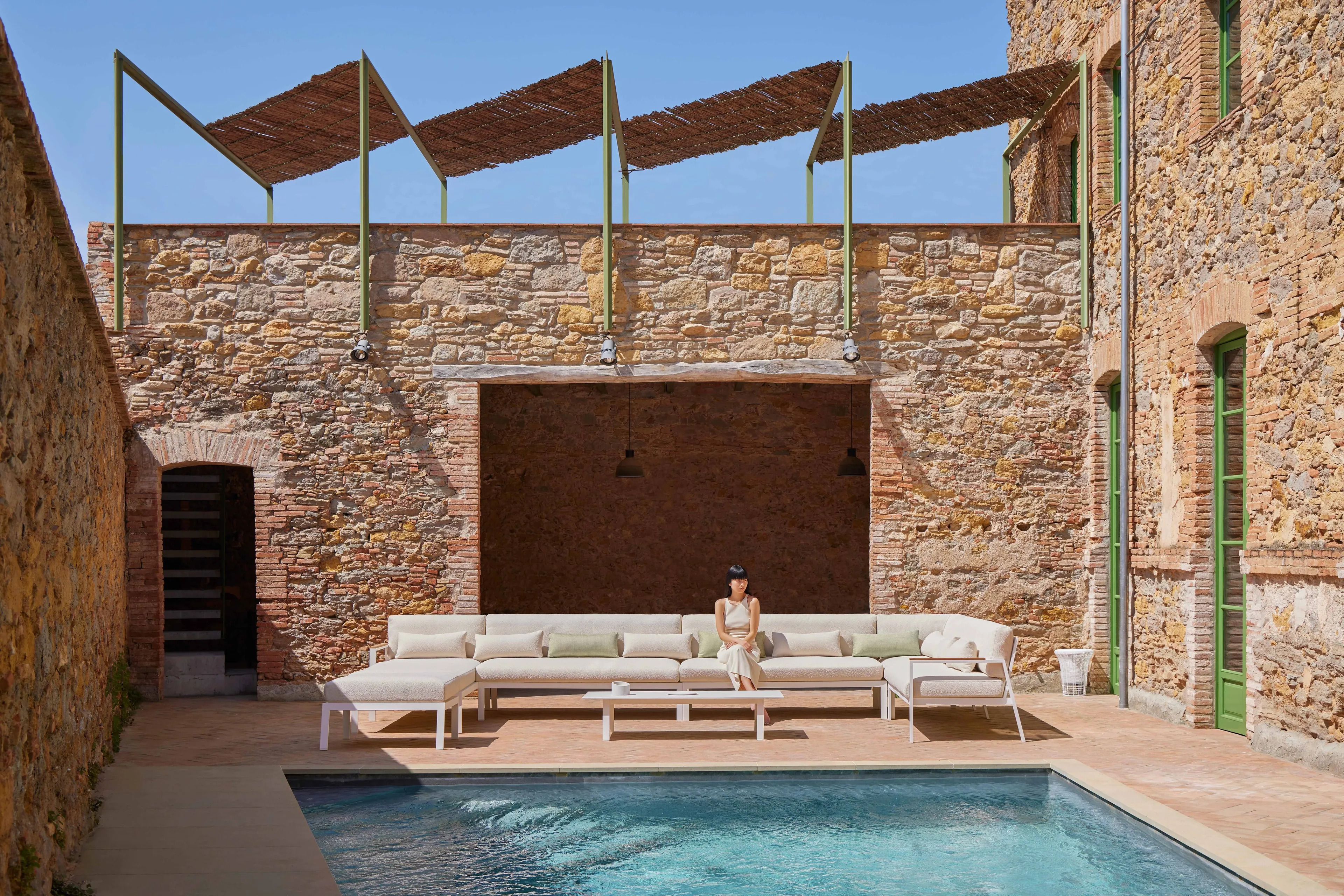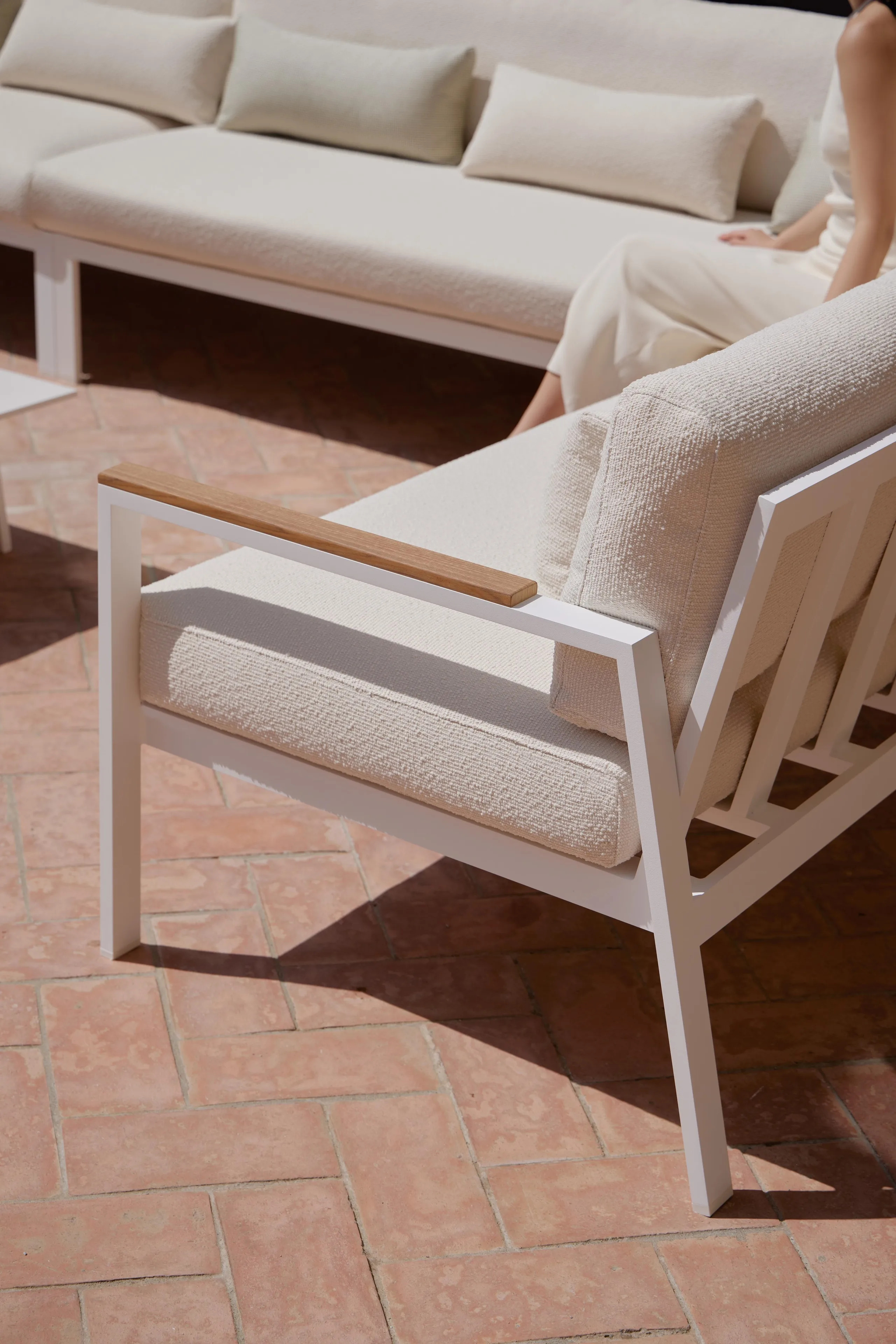 The TIMELESS 1 collection embodies the essence of early 20th-century architectural design, crafted by José A. Gandía-Blasco Canales and Borja García. This durable outdoor furniture set features a minimalist yet distinctive design, emphasizing structural integrity without superfluous decoration. The collection includes all-weather outdoor furniture, constructed from thermo-lacquered welded aluminum profiles, complemented by teak wood and options of phenolic plate or Dekton®. The seating is enhanced with polyurethane foam rubber, covered in water-repellent fabric, ensuring comfort and resilience. The modular outdoor seating and comfortable poolside loungers come with removable fabric covers, available in a palette of colors including white, agate grey, and anthracite. Ideal for resorts, cafés, and beachside hotels, these durable patio chairs and garden furniture sets offer a sophisticated solution for any outdoor setting.
