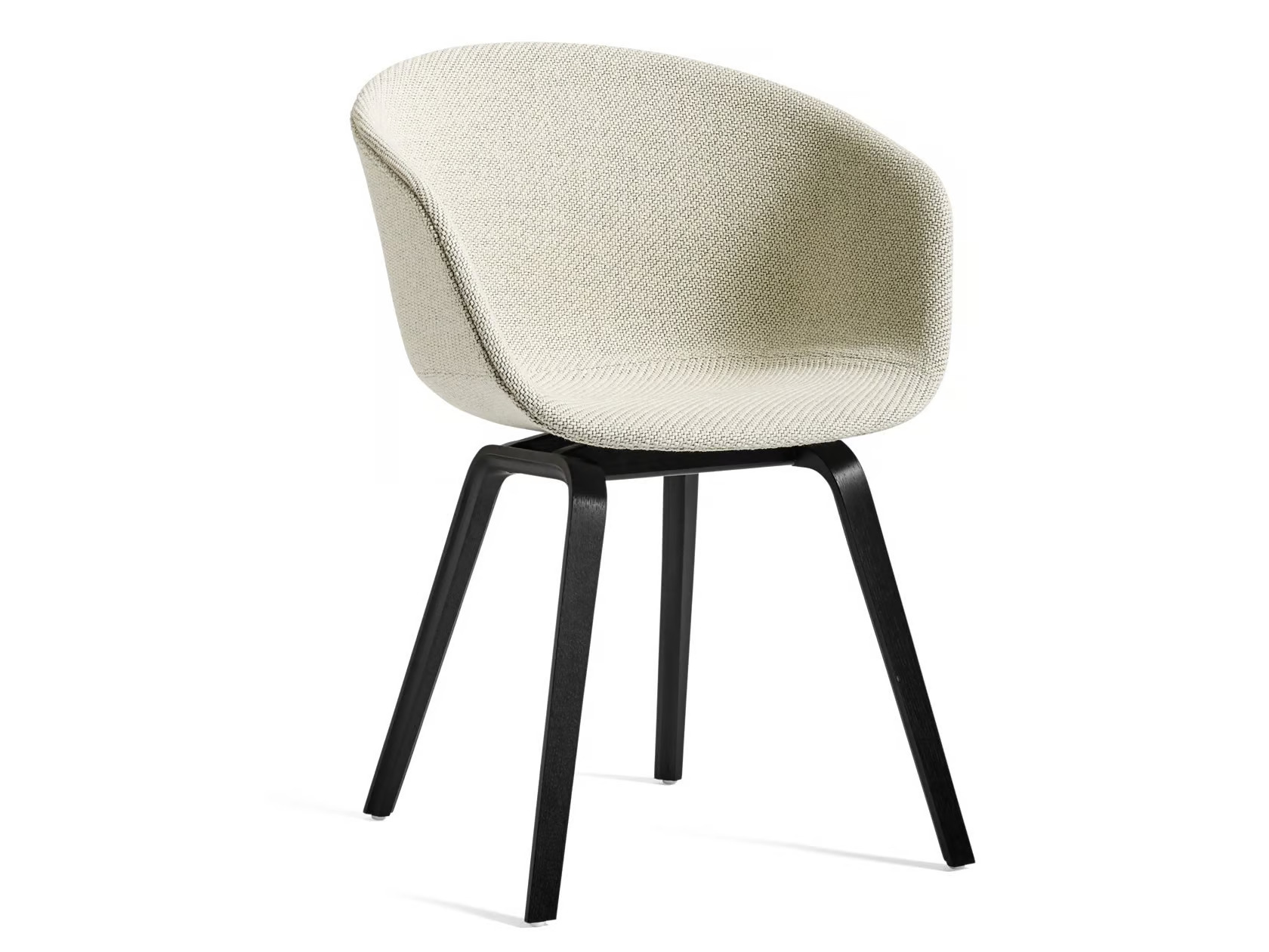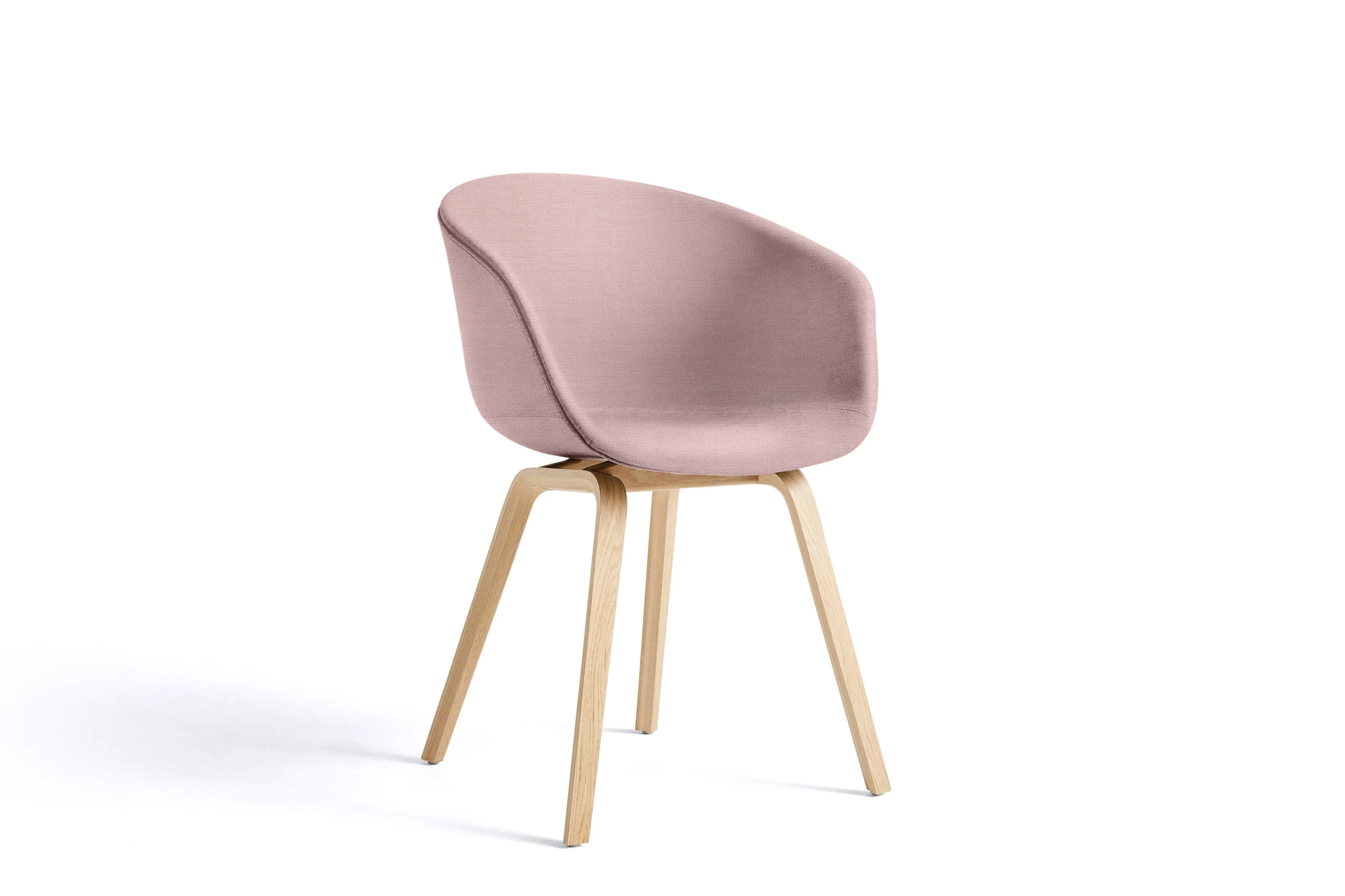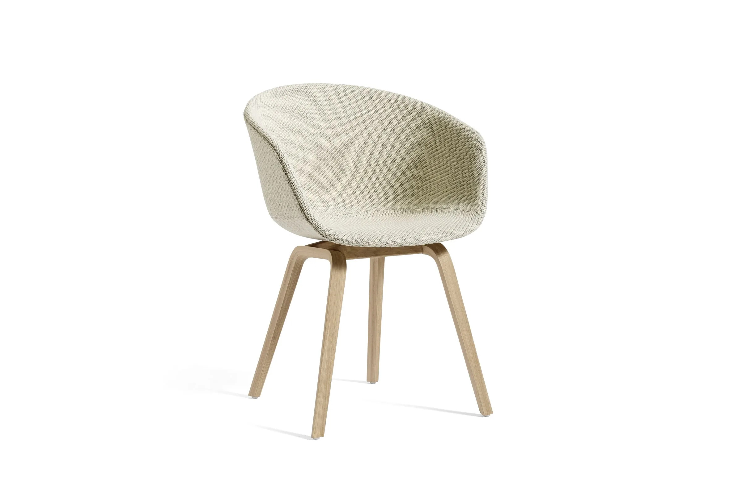The ABOUT A CHAIR AAC 23 is designed with functional simplicity, making it ideal for dining tables, café settings, and conference room furniture. Its fully upholstered shell features a curved back and armrests crafted from polypropylene, offering ergonomic support and a seamless silhouette. The four-legged wooden base provides stability and durability, suitable for high-traffic environments like coworking spaces and educational institutions. With a variety of colors, upholstery, and wood finishes, this chair allows for numerous design combinations. The seat is injection-molded with a 10 mm polypropylene shell and 10 mm foam, while the base is made from molded plywood with a beech inner layer and oak veneer. Available in four base finishes: soaped oak, black stained oak (RAL 9005), clear lacquered oak, and matt lacquered oak. Not stackable.