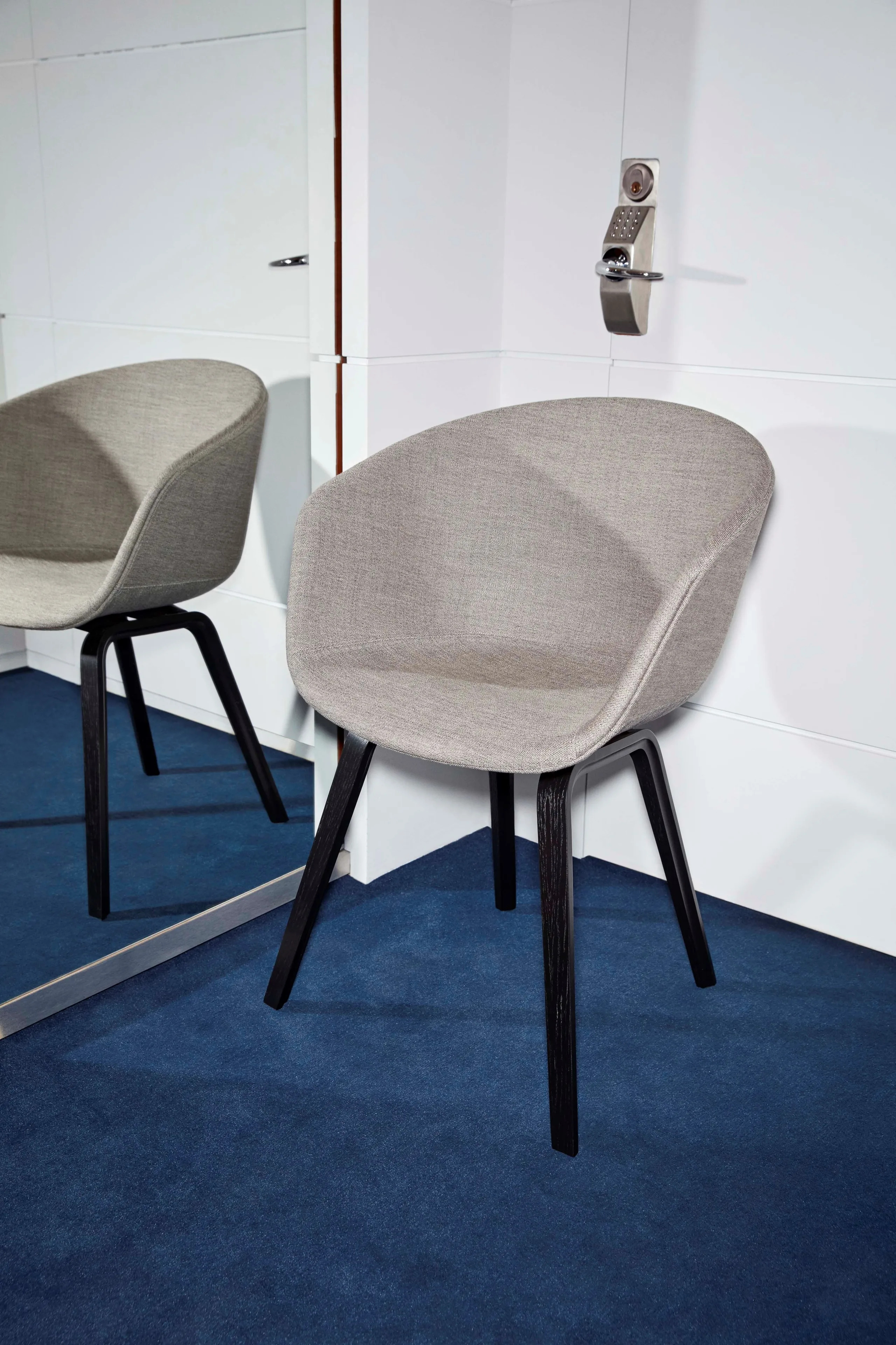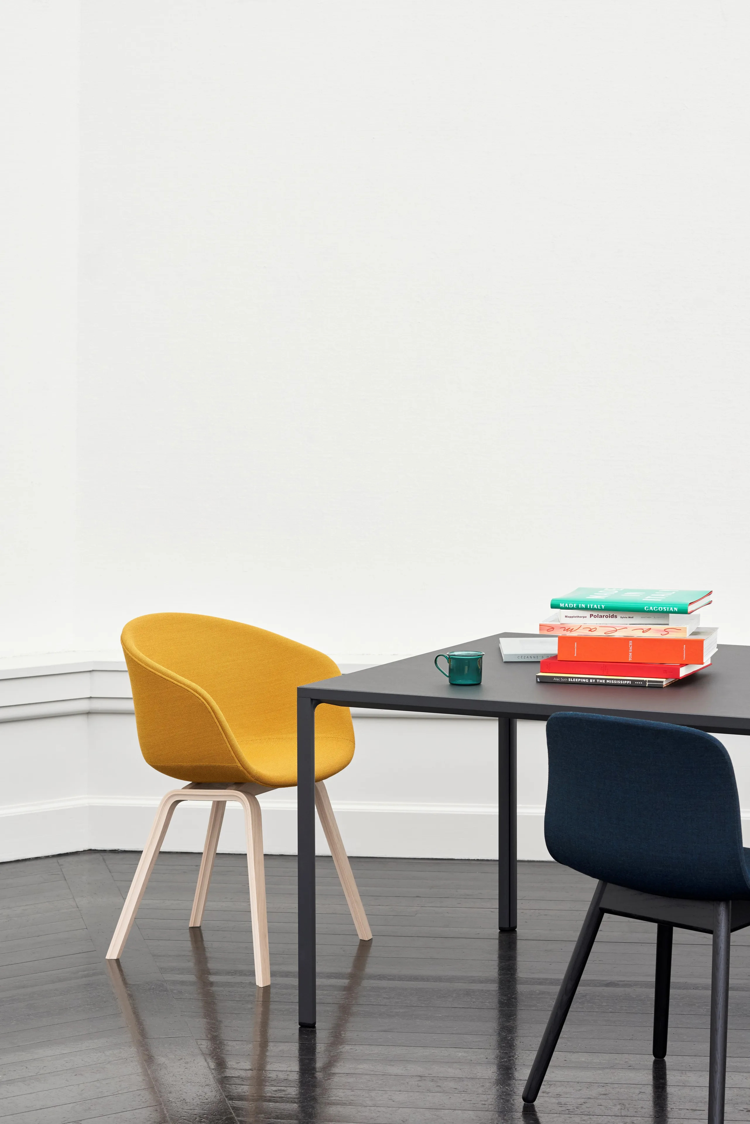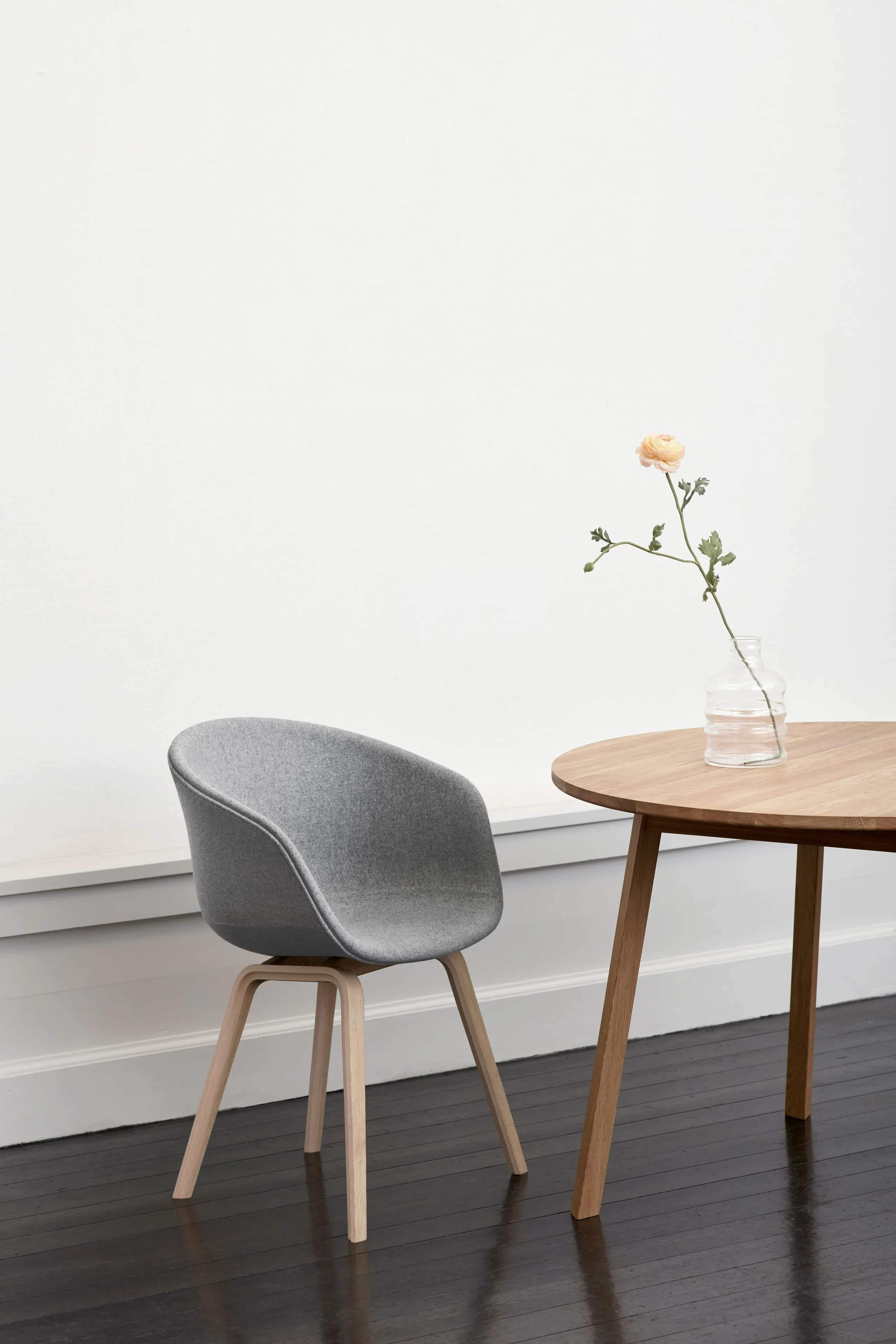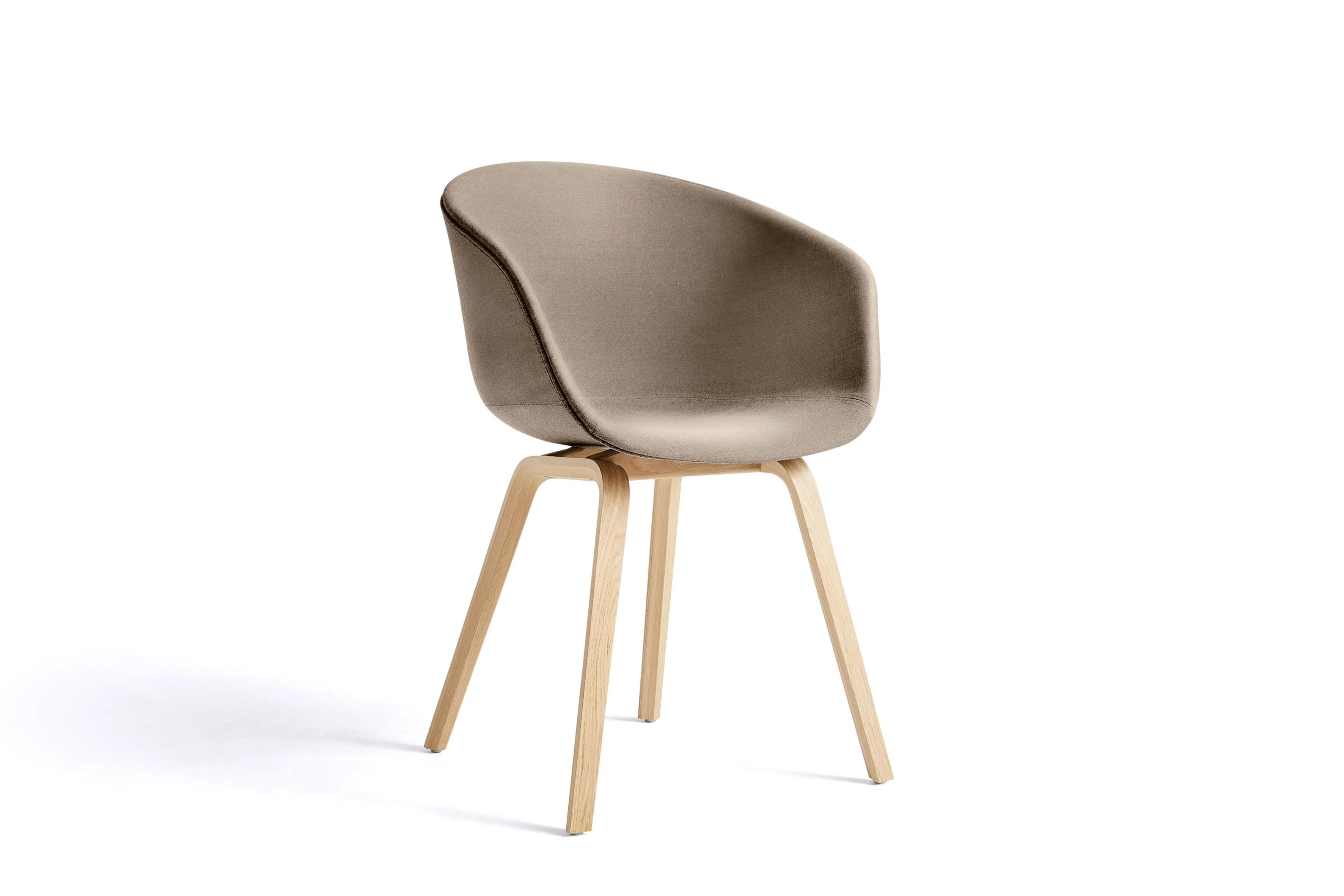 The ABOUT A CHAIR AAC 23 is designed with functional simplicity, making it ideal for dining tables, café settings, and conference room furniture. Its fully upholstered shell features a curved back and armrests crafted from polypropylene, offering ergonomic support and a seamless silhouette. The four-legged wooden base provides stability and durability, suitable for high-traffic environments like coworking spaces and educational institutions. With a variety of colors, upholstery, and wood finishes, this chair allows for numerous design combinations. The seat is injection-molded with a 10 mm polypropylene shell and 10 mm foam, while the base is made from molded plywood with a beech inner layer and oak veneer. Available in four base finishes: soaped oak, black stained oak (RAL 9005), clear lacquered oak, and matt lacquered oak. Not stackable.