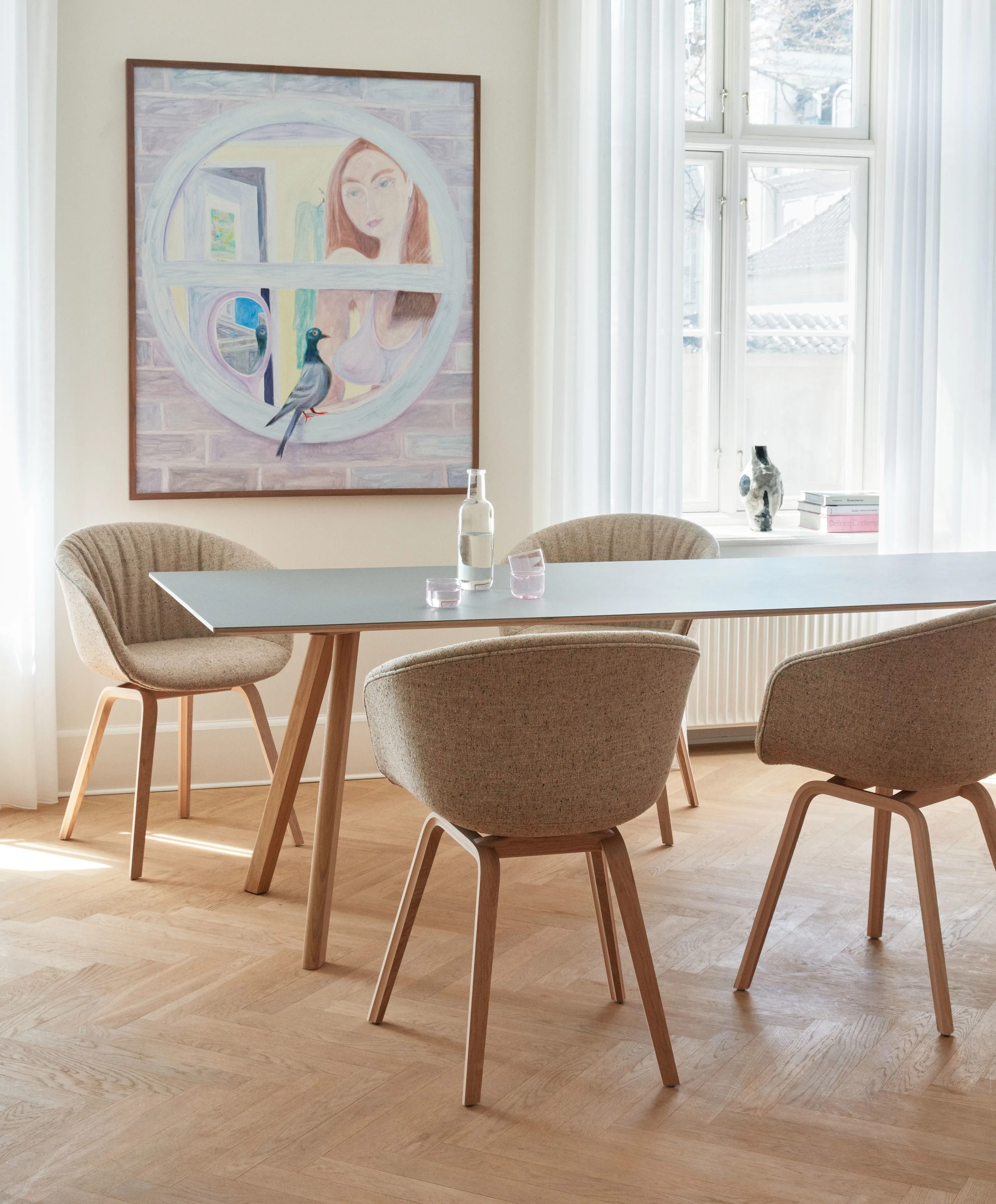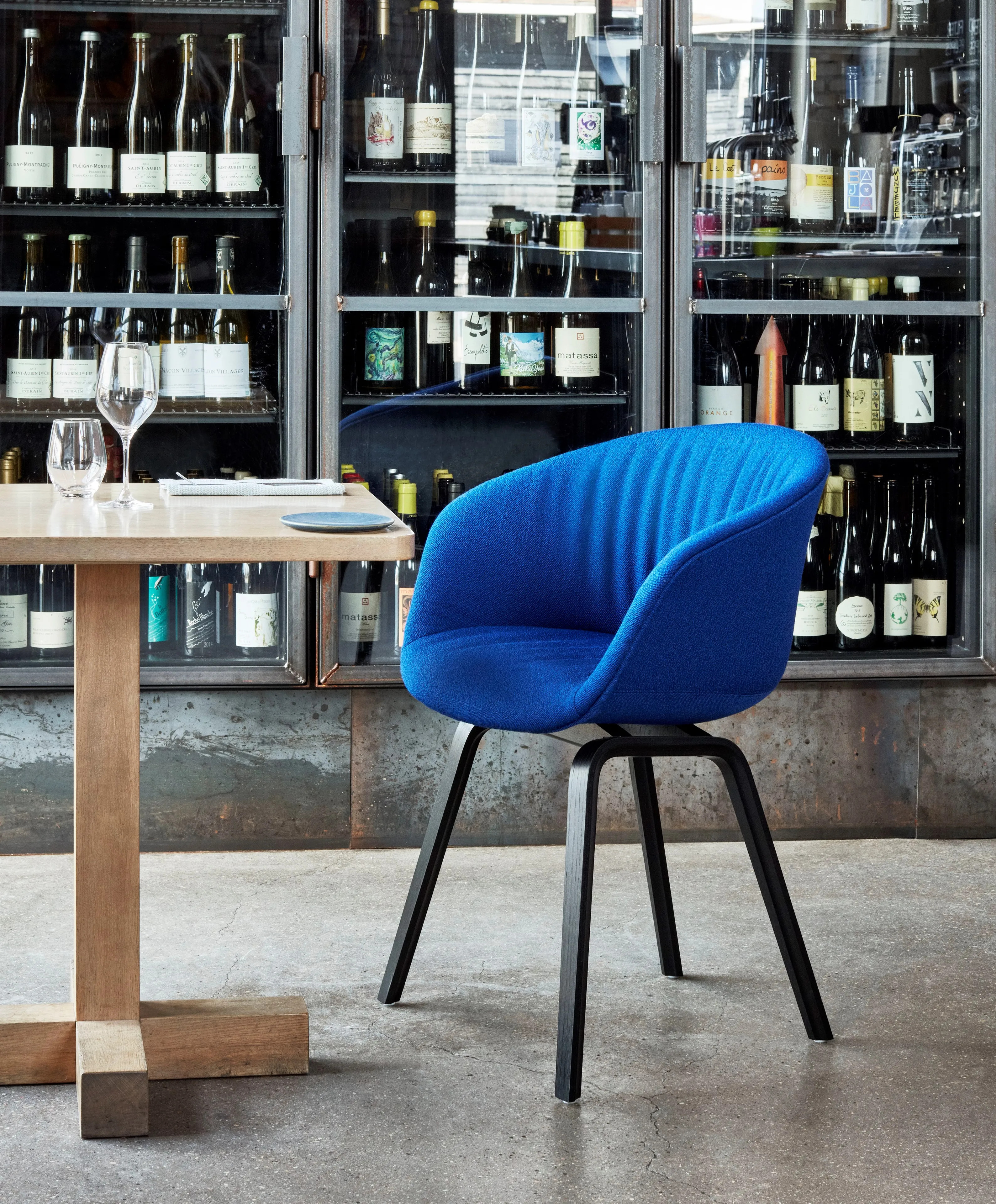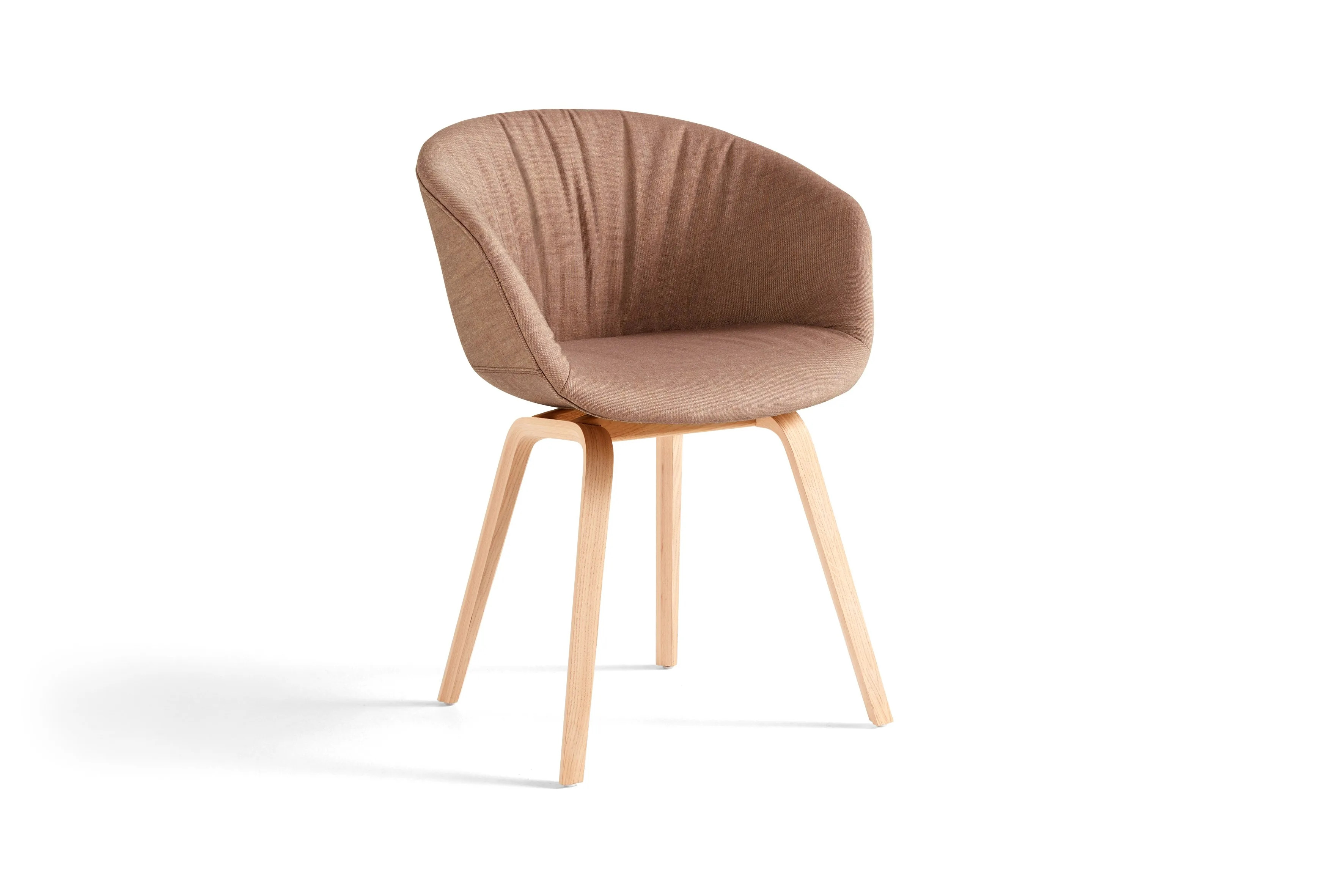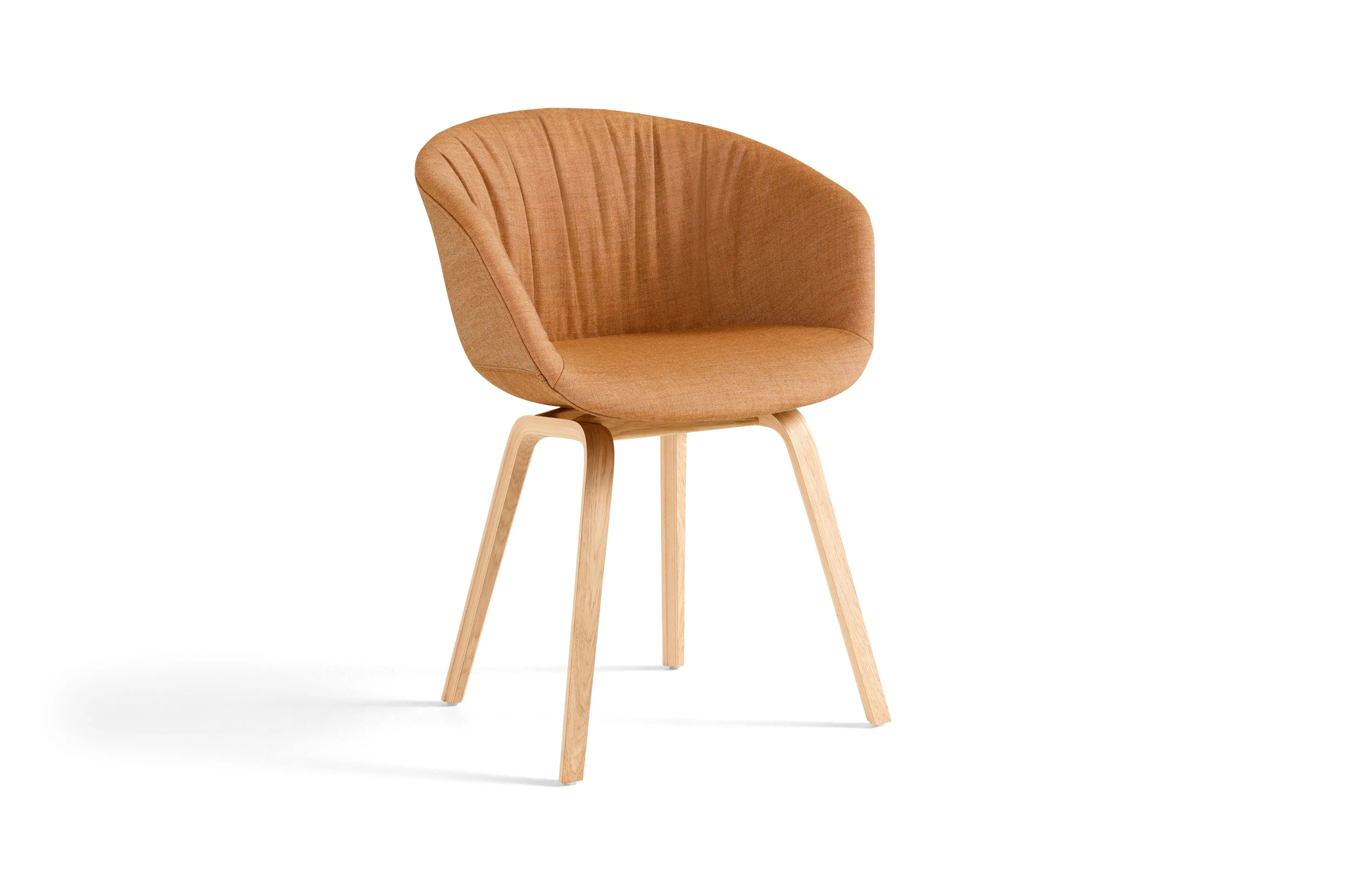The AAC 23 Soft chair combines functional simplicity with modern aesthetics, enhanced by a quilted shell that adds warmth and comfort. Its curved silhouette and four-legged wooden base offer a timeless, classic look, making it suitable for dining tables, café settings, and conference room furniture. The base comes in various finishes, while the shell is available in multiple upholstery options, allowing for diverse design combinations. This chair features an injection-molded polypropylene shell with armrests, full upholstery with a quilted front, and foam padding for added comfort. The moulded plywood base includes an inner beech plywood and an oak veneer top. Choose from four base finishes: black stained oak, clear lacquered oak, soaped oak, and matt lacquered oak. Ideal for restaurants, coworking spaces, and educational institutions, this chair offers durable seating with a modern design.