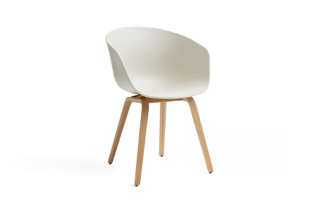 The AAC22 chair embodies functional simplicity, a hallmark of its collection. Its solid shell features a curved back and armrests, offering comfort and a cohesive silhouette. The four-legged wooden base provides stability and durability, with a classic design that complements modern dining tables and café settings. Available in various finishes, the base pairs with a shell crafted from post-consumer recycled plastic, offered in a range of contemporary colors. Multiple upholstery options for the seat enhance its versatility. This chair's adaptable design makes it ideal for restaurants, conference rooms, coworking spaces, cafés, event venues, and educational institutions. Its ergonomic and stackable nature ensures it fits seamlessly into diverse environments, serving as durable seating and a stylish addition to conference room furniture.